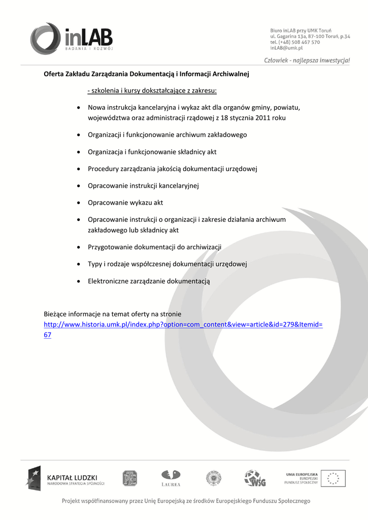 Oferta Zakładu Zarządzania Dokumentacją i Informacji Archiwalnej - szkolenia i kursy dokształcające z zakresu: Nowa instrukcja kancelaryjna i wykaz akt dla organów gminy, powiatu, województwa oraz administracji rządowej z 18 stycznia 2011 roku Organizacji i funkcjonowanie archiwum zakładowego Organizacja i funkcjonowanie składnicy akt Procedury zarządzania jakością dokumentacji urzędowej Opracowanie instrukcji kancelaryjnej Opracowanie wykazu akt Opracowanie instrukcji o organizacji i zakresie działania archiwum zakładowego lub składnicy akt Przygotowanie dokumentacji do archiwizacji Typy i rodzaje współczesnej dokumentacji urzędowej Elektroniczne zarządzanie dokumentacją Bieżące informacje na temat oferty na stronie http://www.historia.umk.pl/index.php?option=com_content&view=article&id=279&Itemid= 67