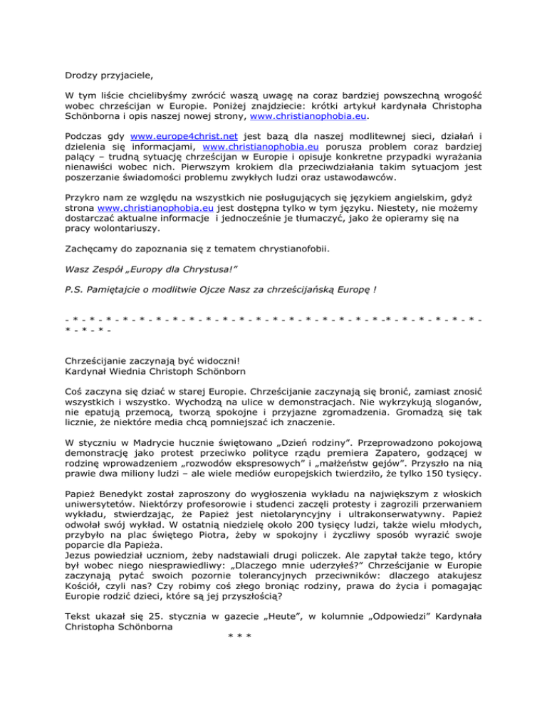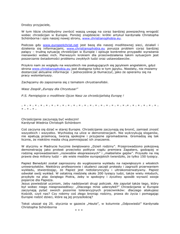 Drodzy przyjaciele, W tym liście chcielibyśmy zwrócić waszą uwagę na coraz bardziej powszechną wrogość wobec chrześcijan w Europie. Poniżej znajdziecie: krótki artykuł kardynała Christopha Schönborna i opis naszej nowej strony, www.christianophobia.eu. Podczas gdy www.europe4christ.net jest bazą dla naszej modlitewnej sieci, działań i dzielenia się informacjami, www.christianophobia.eu porusza problem coraz bardziej palący – trudną sytuację chrześcijan w Europie i opisuje konkretne przypadki wyrażania nienawiści wobec nich. Pierwszym krokiem dla przeciwdziałania takim sytuacjom jest poszerzanie świadomości problemu zwykłych ludzi oraz ustawodawców. Przykro nam ze względu na wszystkich nie posługujących się językiem angielskim, gdyż strona www.christianophobia.eu jest dostępna tylko w tym języku. Niestety, nie możemy dostarczać aktualne informacje i jednocześnie je tłumaczyć, jako że opieramy się na pracy wolontariuszy. Zachęcamy do zapoznania się z tematem chrystianofobii. Wasz Zespół „Europy dla Chrystusa!” P.S. Pamiętajcie o modlitwie Ojcze Nasz za chrześcijańską Europę ! - * - * - * - * - * - * - * - * - * - * - * - * - * - * - * - * - * - * - * -* - * - * - * - * - * *-*-*- Chrześcijanie zaczynają być widoczni! Kardynał Wiednia Christoph Schönborn Coś zaczyna się dziać w starej Europie. Chrześcijanie zaczynają się bronić, zamiast znosić wszystkich i wszystko. Wychodzą na ulice w demonstracjach. Nie wykrzykują sloganów, nie epatują przemocą, tworzą spokojne i przyjazne zgromadzenia. Gromadzą się tak licznie, że niektóre media chcą pomniejszać ich znaczenie. W styczniu w Madrycie hucznie świętowano „Dzień rodziny”. Przeprowadzono pokojową demonstrację jako protest przeciwko polityce rządu premiera Zapatero, godzącej w rodzinę wprowadzeniem „rozwodów ekspresowych” i „małżeństw gejów”. Przyszło na nią prawie dwa miliony ludzi – ale wiele mediów europejskich twierdziło, że tylko 150 tysięcy. Papież Benedykt został zaproszony do wygłoszenia wykładu na największym z włoskich uniwersytetów. Niektórzy profesorowie i studenci zaczęli protesty i zagrozili przerwaniem wykładu, stwierdzając, że Papież jest nietolaryncyjny i ultrakonserwatywny. Papież odwołał swój wykład. W ostatnią niedzielę około 200 tysięcy ludzi, także wielu młodych, przybyło na plac świętego Piotra, żeby w spokojny i życzliwy sposób wyrazić swoje poparcie dla Papieża. Jezus powiedział uczniom, żeby nadstawiali drugi policzek. Ale zapytał także tego, który był wobec niego niesprawiedliwy: „Dlaczego mnie uderzyłeś?” Chrześcijanie w Europie zaczynają pytać swoich pozornie tolerancyjnych przeciwników: dlaczego atakujesz Kościół, czyli nas? Czy robimy coś złego broniąc rodziny, prawa do życia i pomagając Europie rodzić dzieci, które są jej przyszłością? Tekst ukazał się 25. stycznia w gazecie „Heute”, w kolumnie „Odpowiedzi” Kardynała Christopha Schönborna *** Strona ruszyła: Chrystianofobia w Europie Strona Www.christianophobia.eu została ostatnio uruchomiona w Wiedniu jako część sieci chrześcijan Europa dla Chrystusa! (www.europe4christ.net). Można na niej dowiedzieć się o znaczeniu terminu, przypadkach chrystianofobii w Europie i poczytać wypowiedzi znanych osób. „Chrystianofobia oznacza irracjonalny strach albo nienawiść do chrześcijan albo chrześcijaństwa w ogólności”, mówi dr Gudrun Kugler, prawnik i założycielka strony. Dodaje: „ polega ona na manifestowaniu uprzedzenia wobec chrześcijan i stopniowej marginalizacji społecznej wyznających wiarę chrześcijańską”. Na stronie można przeczytać o kilku przypadkach kpin albo ośmieszania wiary chrześcijanskiej, usuwanie symboli chrześcijańskich, zakaz ich noszenia oraz ataki występujące w filmach i programach telewizyjnych. Dyskryminowanie postaw “niepoprawnych politycznie”, związanych nierozerwalnie z wiarą chrześcijańską, takich jak sprzeciw wobec aborcji i małżeństw homoseksualistów przybiera poważne formy: od przypadków utraty pracy albo kary grzywny aż do kary więzienia. Na przykład francuski poseł, Christian Vanneste, został skazany na karę grzywny w wysokości około 10 tysięcy Euro za krytyczne komentarze homoseksualizmu. Pojęcie ‘Chrystianofobii’ znalazło się już w kilku dokumentach ONZ i Organizacji Bezpieczeństwa i Współpracy w Europie. Kilku urzędników watykańskich zaznaczyło potrzebę zwiększania świadomości o tym zjawisku, między innymi, niedawno arcybiskup Dominique Mamberti, watykański sekretarz do spraw relacji z państwami, jak donosi pismo „Zenit”. Joseph Weiler, autor żydowski i profesor prawa międzynarodowego na Uniwersytecie Nowojorskim, mówi: „Europejski laicyzm, w odróżnieniu od amerykańskiego sekularyzmu, nie jest zwykłym ‘po prostu nie wierzę w Boga’. Jest pewnego rodzaju wiarą samą w sobie, polegającą na aktywnej wrogości wobec religii, w przypadku Europy wobec chrześcijaństwa.” Biskup Hilarion, przedstawiciel Patriarchatu Moskiewskiego przy międzynarodowych organizacjach europejskich, zarzuca Unii Europejskiej przymykanie oka na antychrześcijańskie działania krajów Unii: „ Propagując tolerancję, liderzy Unii Europejskiej walczą z islamofobią i antysemityzmem, ale często ignorują przeróżne praktyki uderzające w chrześcijan’, mówi, podając za przykład próby wykluczenia kościoła z życia publicznego. Inicjatorka dr Gudrun Kugler: “ Stosunek do chrześcijan w Europie staje się bardzo wrogi. Zajmujemy się tą sprawą i publikujemy informacje o takich sytuacjach, żeby alarmować. Nie chodzi o użalanie się nad sobą, ale o poszukiwanie rozwiązań, które dotyczą również sfery politycznej. Proponuje ona strategię walki z zjawiskiem chrystianofobii polegającą na wzmacnianiu samoświadomości chrześcijan w Europie. „Wiele z 