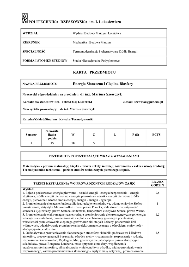 Karta przedmiotu Energia Słoneczna i Cieplna Biosfery