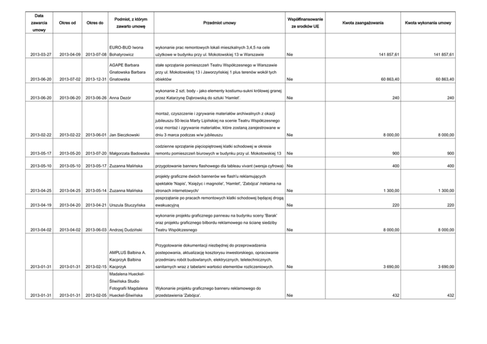 Data zawarcia Okres od umowy Okres do Podmiot, z którym zawarto umowę EURO-BUD Iwona 2013-03-27 2013-06-20 2013-04-09 2013-07-02 Przedmiot umowy 2013-07-08 Bohatyrowicz ze srodków UE Kwota zaangażowania Kwota wykonania umowy wykonanie prac remontowych lokali mieszkalnych 3,4,5 na cele użytkowe w budynku przy ul. Mokotowskiej 13 w Warszawie AGAPE Barbara stałe sprzątanie pomieszczeń Teatru Współczesnego w Warszawie Gnatowska Barbara przy ul. Mokotowskiej 13 i Jaworzyńskiej 1 plus terenów wokół tych 2013-12-31 Gnatowska Współfinansowanie obiektów Nie 141 857,61 141 857,61 Nie 60 863,40 60 863,40 Nie 240 240 Nie 8 000,00 8 000,00 wykonanie 2 szt. body - jako elementy kostiumu-sukni królowej granej 2013-06-20 2013-06-20 2013-06-26 Anna Dezór przez Katarzynę Dąbrowską do sztuki 'Hamlet'. montaż, czyszczenie i zgrywanie materiałów archiwalnych z okazji jubileuszu 50-lecia Marty Lipińskiej na scenie Teatru Współczesnego oraz montaż i zgrywanie materiałów, które zostaną zarejestrowane w 2013-02-22 2013-02-22 2013-06-01 Jan Sieczkowski dniu 3 marca podczas w/w jubileuszu codzienne sprzątanie pięciopiętrowej klatki schodowej w okresie 2013-05-17 2013-05-20 2013-07-20 Małgorzata Badowska remontu pomieszczeń biurowych w budynku przy ul. Mokotowskiej 13 Nie 900 900 2013-05-10 2013-05-10 2013-05-17 Zuzanna Malińska przygotowanie banneru flashowego dla tableau vivant (wersja cyfrowa) Nie 400 400 Nie 1 300,00 1 300,00 Nie 220 220 Nie 8 000,00 8 000,00 Nie 3 690,00 3 690,00 Nie 432 432 projekty graficzne dwóch bannerów we flash'u reklamujących spektakle 'Napis', 'Księżyc i magnolie', 'Hamlet', 'Zabójca' /reklama na 2013-04-25 2013-04-25 2013-05-14 Zuzanna Malińska stronach internetowych/ posprzątanie po pracach remontowych klatki schodowej będącej drogą 2013-04-19 2013-04-20 2013-04-21 Urszula Stuczyńska ewakuacyjną wykonanie projektu graficznego panneau na budynku sceny 'Barak' oraz projektu graficznego bilbordu reklamowego na ścianę siedziby 2013-04-02 2013-04-02 2013-06-03 Andrzej Dudziński Teatru Współczesnego Przygotowanie dokumentacji niezbędnej do przeprowadzenia 2013-01-31 2013-01-31 AMPLUS Balbina A. postepowania, aktualizację kosztorysu inwestorskiego, opracowanie Kacprzyk Balbina przedmiaru robót budowlanych, elektrycznych, teletechnicznych, 2013-02-15 Kacprzyk sanitarnych wraz z tabelami wartości elementów rozliczeniowych. Madalena HueckelŚliwińska Studio Fotografii Magdalena 2013-01-31 2013-01-31 2013-02-05 Hueckel-Śliwińska Wykonanie projektu graficznego banneru reklamowego do przedstawienia 'Zabójca'. Wykonanie okresowej, rocznej kontroli budynku Sceny w Baraku i 2013-01-24 2013-01-24 2013-01-31 Tadeusz Węgrowski zaplecza techniczno-administracyjnego przy ul. Jaworzyńskiej 1. Nie 1 100,00 1 100,00 Nie 1 188,00 1 188,00 Nie 432 432 Nie 3 567,00 3 567,00 Magdalena HueckelŚliwińska Studio Fotografii Magdalena 2013-01-21 2013-01-21 2013-01-25 Hueckel-Śliwińska Wykonanie sesji zdjęciowej z próby przedpremierowej przedstawienia 'Zabójca' w dniu 22 stycznia 2013r. Magdalena HueckelŚliwińska Studio Fotografii Magdalena 2013-01-18 2013-01-18 2013-01-22 Hueckel-Śliwińska Wykonanie projektu graficznego reklamy prasowej przedstawienia 'Zabójca' do 'Gazety Wyborczej' /emisja 25.01.2013r./ WARBIT Zakład ProjektowoProdukcyjny Jakub 2012-12-28 2012-12-28 2013-01-21 Weręgowski Wykonanie elementów scenografii do sztuki 'Zabójca' wg projektu scenograficznego Marty Zając. Nagranie audiowizualne i montaż trailera ze sztuki 'Zabójca' przeznaczonego do umieszczenia na stronie internetowej Teatru 2012-12-28 2012-12-28 2013-01-23 Krzysztof Sieniawski Współczesnego. Nie 1 900,00 1 900,00 2012-12-01 2012-12-01 2013-01-10 Anna Czerniawska Archiwizacja dokumentacji Teatru w archiwum zakładowym Nie 600 600 Nie 0 3 075,00 Nie 0 4 000,00 Nie 0 432 Nie 0 1 200,00 Nie 0 540 przyjęcie obowiązków pełnienia funkcji inspektora nadzoru w branży elektrycznej nad pracami remontowymi związanymi ze zmianą sposobu użytkowania lokali mieszkalnych 3,4,5 na cele biurowe w 2013-03-28 2013-04-09 2013-06-30 PROEL Henryk Matysik budynku przy ul. Mokotowskiej 13 w Warszawie Przyjęcie obowiązków pełnienia funkcji inspektora nadzoru w branży budowlanej i sanitarnej nad pracami remontowymi zw. ze zmianą sposobu użytkowania lokali mieszkalnych 3,4,5 na cele biurowe w budynku przy ul. Mokotowskiej 13 w Warszawie, które będą 2013-03-28 2013-04-09 2013-06-30 Tadeusz Węgrowski przeprowadzone w okresie kwiecień/czerwiec 2013 Studio Fotografii Magdalena HueckelŚliwińska Magdalena 2013-03-21 2013-03-21 2013-04-04 Hueckel-Śliwińska projekt graficzny reklamy prasowej Teatru na miesiąc kwiecień 2013 do miesięcznika „Moja Kolej”. wykonanie (szycie i przeróbki) kostiumów damskich do sztuki pt 2013-03-05 2013-03-05 2013-03-13 Anna Dezór 'Najdroższy'. Studio Fotografii Magdalena HueckelŚliwińska Magdalena 2013-03-12 2013-03-12 2013-03-20 Hueckel-Śliwińska wykonanie projektu graficznego banneru reklamowego do przedstawienia pt. 'Najdroższy'. 2013-03-01 2013-03-01 SYNERGIA Firma serwisowanie sprzętu komputerowego i aplikacji powszechnego usługowa Michał stosowania oraz zarządzanie systemami informatycznymi 2013-12-31 Jaworski zainstalowanymi w siedzibie Teatru. Nie 0 15 498,00 Nie 0 1 900,00 Nie 0 800 2013r. (zmiany w obsadzie) Nie 0 2 160,00 Wykonanie mebli do spektaklu 'Najdroższy...' Nie 0 10 209,00 Wykonanie elementów modelatorskich do spektaklu 'Najdroższy...' Nie 0 2 570,00 Nie 0 64 452,00 Nie 0 20 024,40 Nie 0 2 160,00 Nie 2 744,18 2 744,18 nagranie audiowizualne i montaż trailera do sztuki 'Najdroższy' przeznaczonego do umieszczenia na stronie internetowej teatru 2013-03-07 2013-03-07 2013-03-13 Krzysztof Sieniawski Współczesnego. wykonanie pomiarów natężenia oświetlenia ewakuacyjnego w budynku głównym Teatru /Mokotowska 13/ oraz w pomieszczeniach 'Scena w 2013-02-22 2013-02-22 2013-02-28 Krzysztof Kostrzew
