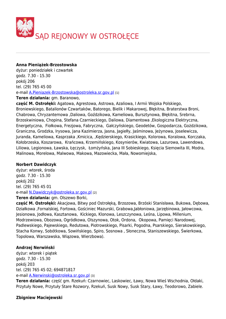 SĄD REJONOWY W OSTROŁĘCE Anna Pieniążek-Brzostowska dyżur: poniedziałek i czwartek godz. 7.30 - 15.30 pokój 206 tel. (29) 765 45 00 e-mail [email protected] [1] Teren działania: gm. Baranowo, część M. Ostrołęki: Agatowa, Agrestowa, Astrowa, Azaliowa, I Armii Wojska Polskiego, Broniewskiego, Batalionów Czwartaków, Batorego, Bielik i Makarowej, Błękitna, Braterstwa Broni, Chabrowa, Chryzantemowa ,Daliowa, Goździkowa, Kameliowa, Bursztynowa, Błękitna, Srebrna, Brzoskwiniowa, Chopina, Stefana Czarnieckiego, Daliowa, Diamentowa ,Ekologiczna Elektryczna, Energetyczna, Fiołkowa, Frezjowa, Fabryczna, Gałczyńskiego, Geodetów, Gospodarcza, Gożdzikowa, Graniczna, Grodzka, Irysowa, Jana Kazimierza, Jasna, Jagiełły, Jaśminowa, Jeżynowa, Joselewicza, Juranda, Kameliowa, Kasprzaka ,Kmicica, ,Kędzierskiego, Krasickiego, Kolorowa, Koralowa, Korczaka, Kołobrzeska, Koszarowa, Krańcowa, Krzemińskiego, Kosynierów, Kwiatowa, Lazurowa, Lawendowa, Liliowa, Legionowa, Ławska, Łęczysk, Łomżyńska, Jana III Sobieskiego, Księcia Siemowita III, Modra, Malinowa, Morelowa, Malwowa, Makowa, Mazowiecka, Mała, Nowomiejska, Norbert Dawidczyk dyżur: wtorek, środa godz. 7.30 - 15.30 pokój 202 tel. (29) 765 45 01 e-mail [email protected] [2] Teren działania: gm. Olszewo Borki, część M. Ostrołęki: Akacjowa, Bitwy pod Ostrołęką, Brzozowa, Brzóski Stanisława, Bukowa, Dębowa, Działkowa ,Fornalskiej, Fortowa, Gościniec Mazurski, Grabowa,Jabłoniowa, Jarzębinowa, Jałowcowa, Jesionowa, Jodłowa, Kasztanowa, Kickiego, Klonowa, Leszczynowa, Leśna, Lipowa, Millenium, Modrzewiowa, Obozowa, Ogródkowa, Olszynowa, Otok, Ordona, Okopowa, Pamięci Narodowej, Padlewskiego, Pajewskiego, Redutowa, Piotrowskiego, Pisarki, Pogodna, Psarskiego, Sierakowskiego, Stacha Konwy, Sobótkowa, Sowińskiego, Spiro, Sosnowa , Słoneczna, Staniszewskiego, Świerkowa, Topolowa, Warszawska, Wiązowa, Wierzbowa). Andrzej Nerwiński dyżur: wtorek i piątek godz. 7.30 - 15.30 pokój 203 tel. (29) 765 45 02; 694871817 e-mail [email protected] [3] Teren działania: część gm. Rzekuń: Czarnowiec, Laskowiec, Ławy, Nowa Wieś Wschodnia, Ołdaki, Przytuły Nowe, Przytuły Stare Rozwory, Rzekuń, Susk Nowy, Susk Stary, Ławy, Teodorowo, Zabiele. Zbigniew Maciejewski dyżur: wtorek i piątek godz. 7.30 - 15.30 pokój 202 tel. (29) 765 45 01; 694871844 e-mail [email protected] [4] Teren działania: gm. Troszyn, część M. Ostrołęki: Al. Jana Pawła II, Al. Ks. J .Popiełuszki, I Batalionu Pułku Morskiego, Bobińskiego, Bohaterów Warszawy, Chełmońskiego, Certowicza, Cieplińskiego Pługa, L.Chojnowskiego, Czarna, Daleka, Dąbrowskiej, Dygasińskiego, Goworowska, Grodzickiego, Grodzkiego, Gruntowa, Hallera, Jedności, Jasińskiego, Kaczyńska, Karłowicza, Mieczysława Jana Kasprowicza, Kochanowskiego, Kolejowa, Kraszewskiego, Królowej Bony, Krucza, Leopolda Staffa, Joachima Lelewela, Aleksandra Teofila Lenartowicza, Leśmiana, Literacka, Magazynowa, Marynarzy, Gabriela Narutowicza, Nasypowa, Nadziei, Nałkowskiej, Norwida, Ogrodowa, Odległa, Władysława Orkana, Ostrołęckich Harcerzy, Ostrowska, Patriotów, Plac Dworcowy, Emilii Plater, Poligonowa, Polna, Bolesława Prusa, Rolna, Reja, Skrajna, Starowiejska, Składowa, Skowrońskiego, Juliusza Słowackiego, Stańskiego, Szymanowskiego, M.Skłodowskiej-Curie, Juliana Tuwima, Tobolicka, Wiejska, Wypychy, Stanisława Wyspiańskiego, Zarośle, Ziemska, Stefana Żeromskiego, Żołnierzy AK. Grzegorz Ciak dyżur: środa i piątek godz. 7.30 - 15.30 pokój 205 tel. (29) 765 45 04 e-mail [email protected] [5] Teren działania: gm. Myszyniec, gm. Czarnia. część M. Ostrołęki: Boczna, Dobra, Dobrzańskiego, Cicha, Insurekcyjna, Inwalidów Wojennych, 11 Listopada, Łąkowa, Markowskiego, Miła, Mokra, Niemena, Prosta, Przytulna, Krzywa, Stayera, Wesoła, Wygodna Wybickiego, Zaciszna). Izabela Słaboń Lis dyżur: środa i piątek godz. 7.30 - 15.30 pokój 205 tel. (29) 765 45 04 e-mail [email protected] [6] Teren działania: gm. Łyse, gm. Goworowo [6] Grażyna Ossowska dyżur: poniedziałek i czwartek godz. 7.30 - 15.30 pokój 207 tel. (29) 765 45 06 e-mail [email protected] [7] Teren działania: gm. Czerwin, część M. Ostrołęki: Andersa, Banacha, Barzykowskiego, Boczna, Buczka, Chemiczna, Denisiewicza, Gorbatowa, Hubalczyków, Jaracza , Jezierskiego, Kołłątaja, Komisji Edukacji Narodowej, Konarskiego, Konopnickiej, Korzeniowskiej, Krzywickiego, Kuklińskiego,St. Kosko, Łubieńskiego, gen.Maczka, Modrzejewskiej, Powstańców, Reymonta, Roweckiego – Grota, Sienkiewicza, Sikorskiego, Skierkowskiego, Sochaczewskiego. [7] Joanna Zdrojewska dyżur: poniedziałek i czwartek godz. 7.30 - 15.30 pokój 207 tel. (29) 765 45 06 e-mail [email protected] [8] Teren działania: gm. Kadzidło. część M. Ostrołęki: Berlinga, Kleeberga, Pileckiego, Madalińskiego, Rataja, Sucharskiego, Wincentego Pola. Joanna Piersa dyżur: wtorek i środa godz. 7.30 - 15.30 pokój nr 201 tel. (29) 765 45 05 e-mail [email protected] [9] Teren działania: gm.Lelis. część gm. Rzekuń: Dzbenin, Korczaki, Kamianka, Tobolice , Borawe, Drwęcz. część M. Ostrołęki: 22 Lipca, 26 Maja, Baśniowa, Batorego, Bernardyńska, Bogusławskiego, Bojowników, Bema, Czeczotka, Celulozowa, Celna, Chętnika, Chomicza, Ciasna, Daszyńskiego, Dolna, Dzieci Polskich, Dłużniewskiego, Filochowskiego, Farna, Gocłowskiego, Gomulickiego, Gołębia, Głowackiego, Guliwera, Grodzka, Kamieńskiego, Kaszubska, Kilińskiego, Króla Jana Kazimierza, Kolberga, Kopernika, Kościuszki, Kujawska, Kubusia Puchatka, Kurpiowska, Leszczyńskiego, Lokalna, Mazurska, Mickiewicza, Mostowa, Niedziałkowskiej, Obrońców, Olimpijska, Oświatowa, Parkowa, Papiernicza, Plac Jana Pawła II, Plac Wyszyńskiego, Pomorska, Poprzeczna, Podchorążych, Pionierów, Poległych, Piłsudskiego, Przechodnia, Rybacka, Rejtana, Siemowita III, Skrzatów, Skryta, Sowia, Spacerowa, Staszica, Starosty Kosa, Szkolna, Śląska,