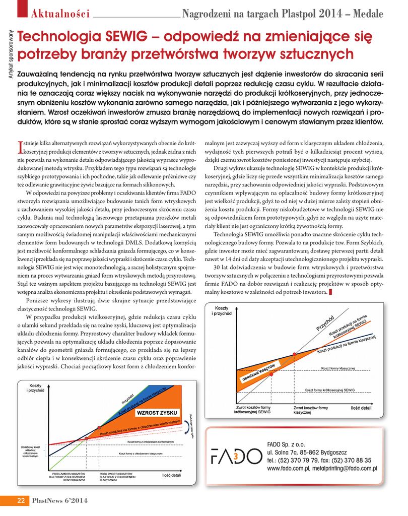 Artykuł sponsorowany Aktualności Nagrodzeni na targach Plastpol 2014 – Medale Technologia SEWIG – odpowiedź na zmieniające się potrzeby branży przetwórstwa tworzyw sztucznych Zauważalną tendencją na rynku przetwórstwa tworzyw sztucznych jest dążenie inwestorów do skracania serii produkcyjnych, jak i minimalizacji kosztów produkcji detali poprzez redukcję czasu cyklu. W rezultacie działania te oznaczają coraz większy nacisk na wykonywanie narzędzi do produkcji krótkoseryjnych, przy jednoczesnym obniżeniu kosztów wykonania zarówno samego narzędzia, jak i późniejszego wytwarzania z jego wykorzystaniem. Wzrost oczekiwań inwestorów zmusza branżę narzędziową do implementacji nowych rozwiązań i produktów, które są w stanie sprostać coraz wyższym wymogom jakościowym i cenowym stawianym przez klientów. I stnieje kilka alternatywnych rozwiązań wykorzystywanych obecnie do krótkoseryjnej produkcji elementów z tworzyw sztucznych, jednak żadna z nich nie pozwala na wykonanie detalu odpowiadającego jakością wyprasce wyprodukowanej metodą wtrysku. Przykładem tego typu rozwiązań są technologie szybkiego prototypowania i ich pochodne, takie jak odlewanie próżniowe czy też odlewanie grawitacyjne żywic bazujące na formach silikonowych. W odpowiedzi na powyższe problemy i oczekiwania klientów firma FADO stworzyła rozwiązania umożliwiające budowanie tanich form wtryskowych z zachowaniem wysokiej jakości detalu, przy jednoczesnym skróceniu czasu cyklu. Badania nad technologią laserowego przetapiania proszków metali zaowocowały opracowaniem nowych parametrów ekspozycji laserowej, a tym samym możliwością świadomej manipulacji właściwościami mechanicznymi elementów form budowanych w technologii DMLS. Dodatkową korzyścią jest możliwość konformalnego schładzania gniazda formującego, co w konsekwencji przekłada się na poprawę jakości wypraski i skrócenie czasu cyklu. Technologia SEWIG nie jest więc monotechnologią, a raczej holistycznym spojrzeniem na proces wytwarzania gniazd form wtryskowych metodą przyrostową. Stąd też ważnym aspektem projektu bazującego na technologii SEWIG jest wstępna analiza ekonomiczna projektu i określenie podstawowych wymagań. Poniższe wykresy ilustrują dwie skrajne sytuacje przedstawiające elastyczność technologii SEWIG. W przypadku produkcji wielkoseryjnej, gdzie redukcja czasu cyklu o ułamki sekund przekłada się na realne zyski, kluczową jest optymalizacja układu chłodzenia formy. Przyrostowy charakter budowy wkładek formujących pozwala na optymalizację układu chłodzenia poprzez dopasowanie kanałów do geometrii gniazda formującego, co przekłada się na lepszy odbiór ciepła i w konsekwencji skrócenie czasu cyklu oraz poprawienie jakości wypraski. Chociaż początkowy koszt form z chłodzeniem konfor- malnym jest zazwyczaj wyższy od form z klasycznym układem chłodzenia, wydajność tych pierwszych potrafi być o kilkadziesiąt procent wyższa, dzięki czemu zwrot kosztów poniesionej inwestycji następuje szybciej. Drugi wykres ukazuje technologię SEWIG w kontekście produkcji krótkoseryjnej, gdzie liczy się przede wszystkim minimalizacja kosztów samego narzędzia, przy zachowaniu odpowiedniej jakości wypraski. Podstawowym czynnikiem wpływającym na opłacalność budowy formy krótkoseryjnej jest wielkość produkcji, gdyż to od niej w dużej mierze zależy stopień obniżenia kosztu produkcji. Formy niskobudżetowe w technologii SEWIG nie są odpowiednikiem form prototypowych, gdyż ze względu na użyte materiały klient nie jest ograniczony krótką żywotnością formy. Technologia SEWIG umożliwia ponadto znaczne skrócenie cyklu technologicznego budowy formy. Pozwala to na produkcje tzw. Form Szybkich, gdzie inwestor może mieć zagwarantowaną dostawę pierwszej partii detali nawet w 14 dni od daty akceptacji utechnologicznionego projektu wypraski. 30 lat doświadczenia w budowie form wtryskowych i przetwórstwa tworzyw sztucznych w połączeniu z technologiami przyrostowymi pozwala firmie FADO na dobór rozwiązań i realizację projektów w sposób optymalny kosztowo w zależności od potrzeb inwestora. FADO Sp. z o.o. ul. Solna 7a, 85-862 Bydgoszcz tel.: (52) 370 79 79, fax: (52) 370 88 35 www.fado.com.pl, [email protected] 22 PlastNews 6’2014