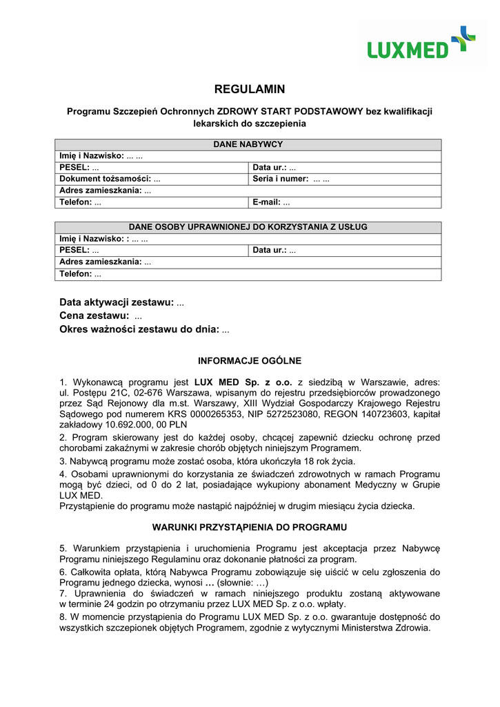 REGULAMIN Programu Szczepień Ochronnych ZDROWY START PODSTAWOWY bez kwalifikacji lekarskich do szczepienia DANE NABYWCY Imię i Nazwisko: ... ... PESEL: ... Dokument tożsamości: ... Adres zamieszkania: ... Telefon: ... Data ur.: ... Seria i numer: ... ... E-mail: ... DANE OSOBY UPRAWNIONEJ DO KORZYSTANIA Z USŁUG Imię i Nazwisko: : ... ... PESEL: ... Data ur.: ... Adres zamieszkania: ... Telefon: ... Data aktywacji zestawu: ... Cena zestawu: ... Okres ważności zestawu do dnia: ... INFORMACJE OGÓLNE 1. Wykonawcą programu jest LUX MED Sp. z o.o. z siedzibą w Warszawie, adres: ul. Postępu 21C, 02-676 Warszawa, wpisanym do rejestru przedsiębiorców prowadzonego przez Sąd Rejonowy dla m.st. Warszawy, XIII Wydział Gospodarczy Krajowego Rejestru Sądowego pod numerem KRS 0000265353, NIP 5272523080, REGON 140723603, kapitał zakładowy 10.692.000, 00 PLN 2. Program skierowany jest do każdej osoby, chcącej zapewnić dziecku ochronę przed chorobami zakaźnymi w zakresie chorób objętych niniejszym Programem. 3. Nabywcą programu może zostać osoba, która ukończyła 18 rok życia. 4. Osobami uprawnionymi do korzystania ze świadczeń zdrowotnych w ramach Programu mogą być dzieci, od 0 do 2 lat, posiadające wykupiony abonament Medyczny w Grupie LUX MED. Przystąpienie do programu może nastąpić najpóźniej w drugim miesiącu życia dziecka. WARUNKI PRZYSTĄPIENIA DO PROGRAMU 5. Warunkiem przystąpienia i uruchomienia Programu jest akceptacja przez Nabywcę Programu niniejszego Regulaminu oraz dokonanie płatności za program. 6. Całkowita opłata, którą Nabywca Programu zobowiązuje się uiścić w celu zgłoszenia do Programu jednego dziecka, wynosi … (słownie: …) 7. Uprawnienia do świadczeń w ramach niniejszego produktu zostaną aktywowane w terminie 24 godzin po otrzymaniu przez LUX MED Sp. z o.o. wpłaty. 8. W momencie przystąpienia do Programu LUX MED Sp. z o.o. gwarantuje dostępność do wszystkich szczepionek objętych Programem, zgodnie z wytycznymi Ministerstwa Zdrowia. ODSTĄPIENIE I REZYGNACJA Z PROGRAMU 9. W ciągu 10 dni od dnia zaakceptowania Regulaminu, Zleceniodawca może odstąpić od Umowy bez podania przyczyny, składając oświadczenie na piśmie i przesyłając je na adres: [email protected]. 10. Prawo odstąpienia od umowy zawartej na odległość nie przysługuje konsumentowi w wypadku świadczenia usług rozpoczętych, za zgodą konsumenta, przed upływem 10 dni od dnia zawarcia umowy. 11. W przypadku rezygnacji z Programu lub niewykonania wszystkich szczepień objętych Programem nie ma możliwości zwrócenia Państwu jakichkolwiek kosztów niewykorzystanych świadczeń, z wyłączeniem ważnych przyczyn, takich jak: zgon dziecka lub wydanie przez lekarza LUX MED orzeczenia lekarskiego o braku możliwości kontynuowania szczepień. W przypadku rezygnacji z Programu z ww. ważnych przyczyn zwrot kosztów dokonany będzie w wysokości: a. 95% całkowitej ceny Programu, gdy rezygnacja nastąpi przed rozpoczęciem korzystania ze świadczeń zdrowotnych w ramach Programu, z zastrzeżeniem odpowiednio lit. b lub c lub d poniżej, b. 25% całkowitej ceny Programu, gdy rezygnacja nastąpi w przeciągu pierwszych 6 miesięcy począwszy od przystąpienia do Programu, c. 15% całkowitej ceny Programu, gdy rezygnacja nastąpi między 7 a 12 miesiącem począwszy od przystąpienia do Programu, d. 10% całkowitej ceny Programu, gdy rezygnacja nastąpi po upływie 12 miesięcy począwszy od przystąpienia do Programu; WARUNKI REALIZACJI PROGRAMU 12. Obsługa w ramach Programu odbywa się w ogólnodostępnych placówkach własnych LUX MED i Medycyny Rodzinnej wymienionych w załączniku nr 2. 13. Program realizowany jest przez okres począwszy od dnia nadania uprawnień do osiągnięcia przez dziecko 2 lat. Program rozpoczyna się Konsultacją pediatry w gabinecie dzieci zdrowych podczas której dokonywany jest dobór preparatów i ustalany jest indywidualny harmonogram szczepień dziecka, wypełniany jest formularz „Harmonogram Indywidualnego Kalendarza Szczepień”, który stanowi załącznik numer 3 do niniejszego Regulaminu. W celu zapewnienia sprawnej obsługi Programu zaleca się posiadanie wypełnionego formularza na kolejnych konsultacjach szczepiennych. Wizyty związane ze szczepieniami standardowo powinny odbyć się w 2, 4, 6, 13 i 16 miesiącu życia dziecka. Ostateczny termin zakończenia programu upływa po 2 latach od dnia zakupu Programu. 14. Warunkiem udzielenia świadczenia w ramach Programu jest uprzednie uzgodnienie jego terminu. Termin udzielenia świadczenia w Centrach Medycznych uzgodnić należy z Asystentem Programu – Joanną Tobiasz - pod numerem 723 150 590. Asystent Programu przez okres 24 miesięcy będzie koordynował i zapewniał korzystanie z Programu. 15. W celu realizacji usługi, pacjent powinien przybyć do Centrum Medycznego wraz z przedstawicielem ustawowym lub osobą upoważnioną pisemnie przez przedstawiciela ustawowego. Przedstawiciel ustawowy lub osoba przez niego upoważniona musi wylegitymować się dokumentem tożsamości. KONTAKT I REKLAMACJE 16. Reklamacje przyjmowane są wyłącznie w formie pisemnej. 17. Reklamacje dotyczące obsługi rozpatrywane są w ciągu 5 dni roboczych, reklamacje dotyczące kwestii medycznych rozpatrywane są w ciągu 14 dni roboczych od daty wpływu wszystkich danych niezbędnych do rozpatrzenia reklamacji na adres: LUX MED Sp. z o.o. Departament Obsługi Klienta Dział Zarządzania Reklamacjami ul. Postępu 21c 02-676 Warszawa lub na adres poczty elektronicznej: [email protected] POSTANOWIENIA KOŃCOWE 18. Nie ma możliwości cesji na inną osobę niewykorzystanych dawek/szczepionek. 19. Zakup Programu oraz korzystanie ze świadczeń zdrowotnych w ramach Programu nie łączy się żadnymi innymi promocjami ani rabatami na jakiekolwiek usługi . 20. Integralną część Regulaminu stanowią Załączniki nr 1 i 2,3. ZAŁĄCZNIK NR 1 Wykaz usług medycznych wchodzących w sk
