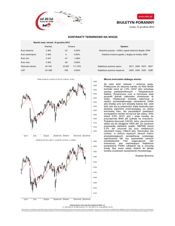 BIULETYN PORANNY środa, 11 grudnia 2013 KONTRAKTY TERMINOWE NA WIG20 Wyniki sesji: wtorek, 10 grudnia 2013 Wartość Zmiana System: Kurs otwarcia 2 484 -23 -0,92% Aktualna pozycja – krótka, sygnał otwarcia długiej- 2549 Kurs zamknięcia 2 484 0 0,00% Ostatnia zmiana sygnału z długiej na krótką- 2569 Kurs min. 2 437 -47 -1,89% Kurs max. 2 493 -20 -0,80% Wolumen obrotu 45 149 23 827 111,75% LOP 121 680 -785 -0,64% Najbliższe poziomy oporu: 2513 2546 2570 2637 Najbliższe poziomy wsparcia: 2440 2400 2355 2286 Mocna końcówka słabego wtorku FW20 (2,484.00, 2,493.00, 2,437.00, 2,484.00, +0.00) 2650 2550 Za nami dość ciekawa i zmienna sesja. Praktycznie do otwarcia handlu na Wall Street kontrakt tracił aż 1,9% (2437 pkt) schodząc poniżej październikowych i listopadowych dołków. Dynamiczny ruch w końcówce sesji pozwolił jednak całkowicie zniwelować te straty. Ostatecznie kontrakt zakończył w okolicy poniedziałkowego odniesienia (2484 pkt) kreśląc przy tym okazałą świecę doji. Jeśli dziś uda się ją potwierdzić białą świeczką byki dostaną argument przemawiający za udaną końcówką roku. Na pozostałych parkietach europejskich handel nie był już tak udany. DAX stracił 0,9% (9121 pkt) i wizja korekty do przynajmniej 9000 pkt zyskała na znaczeniu. Podobnie francuski CAC40, który nieuchronnie zbliża się do okrągłych 4000 pkt. Za oceanem przeważały delikatne spadki. S&P500 stracił 0,3% ale utrzymał się przy niedawnych rekordach hossy (1802,6 pkt). Generalnie siła rynków, w obliczu lepszych danych makro przyśpieszających perspektywę szybszego ograniczenia QE czy wypowiedzi samych przedstawicieli Fed sugerujących taki scenariusz, jest zadziwiająca. Najbliższe posiedzenie FOMC odbędzie się w przyszłą środę. Być może wtedy dojdzie do jakiejś korekty oczekiwań zacieśnienia monetarnego. 2500 Krystian Brymora 2600 2550 2500 2450 2400 2350 2300 2250 2200 2150 2100 2050 June July August September October November December WIG20 (2,477.44, 2,487.11, 2,432.69, 2,474.62, -4.14990) 2650 2600 2450 2400 2350 2300 2250 2200 2150 June July August September October November December Wydział Analiz i Informacji Dom Maklerski BDM S.A. ul. 3‐go Maja 23, 40‐096 Katowice, Tel.: 032 208 14 12, [email protected] Opracowanie ma charakter czysto informacyjny i zostało opracowany na podstawie informacji uznanych przez autorów za wiarygodne . Zawarte w nim komentarze są subiektywnymi poglądami autorów. Opracowanie i zawarte w nim komentarze nie są podstawą żadnej rekomendacji kupna bądź sprzedaży w rozumieniu obowiązującego prawa i nie powinny być tak interpretowane. Publikowanie w prasie lub w Internecie całości lub części opracowania wymaga zgody sporządzających raport. BIULETYN PORANNY środa, 11 grudnia 2013 RYNEK AKCJI Wyniki sesji: wtorek, 10 grudnia 2013 52 tygodnie Indeks Kurs otwarcia Kurs zamknięcia Zmiana [%] Kurs min. Kurs max. Zakres wahań Wartość obrotów [mln PLN] Kurs max. Kurs min. WIG20 2 634,2 2 150,8 2 477,44 2 474,62 -0,17% 2 432,69 2 487,11 54,4 643,8 WIG30 2 764,4 2 520,1 2 622,32 2 614,70 -0,25% 2 575,93 2 628,82 52,9 744,3 sWIG80 15 156,8 10 165,8 14 663,21 14 573,06 -0,37% 14 460,95 14 668,69 207,7 69,3 mWIG40 3 599,3 2 453,4 3 465,22 3 425,22 -0,96% 3 417,99 3 468,58 50,6 155,1 WIG-PL 56 438,7 43 438,1 54 087,92 53 850,79 -0,34% 53 258,53 54 087,92 829,4 WIG 55 384,8 42 842,1 52 897,23 52 692,63 -0,36% 52 098,54 52 994,18 895,6 Spółka Cena [PLN] Mkt Cap [mln PLN] ALIOR BANK 78,15 ASSECOPOL AZOTY TARNÓW zmiana % 896,8 zmiana % względem WIG30 dzienna 1M 3M 6M dzienna 1M 3M 6M 4 969 0,2% 3,0% -12,6% -13,6% 0,4% 4,4% -16,3% -14,4% 49,50 4 109 -0,4% -4,7% 9,2% 14,3% -0,1% -3,2% 5,4% 13,6% 68,00 6 745 -2,4% -13,9% -5,6% -10,8% -2,2% -12,5% -9,3% -11,5% BANK HANDLOWY 115,70 15 117 -0,9% 3,6% 8,2% 16,9% -0,6% 5,0% 4,5% 16,1% BOGDANKA 138,00 4 694 0,0% 7,7% 23,1% 14,2% 0,3% 9,2% 19,4% 13,4% BORYSZEW 0,56 1 232 -1,8% 9,8% 14,3% 33,3% -1,5% 11,3% 10,6% 32,6% BRE 507,00 21 382 -1,2% 0,6% 11,5% 30,0% -1,0% 2,1% 7,7% 29,2% BZ WBK 392,40 36 707 -0,7% 6,8% 19,6% 33,3% -0,4% 8,2% 15,9% 32,5% CCC 117,00 4 493 -0,2% -2,4% 9,8% 46,3% 0,0% -1,0% 6,1% 45,5% CYFROWY POLSAT 19,75 6 880 -0,3% -11,0% -7,3% 1,8% 0,0% -9,5% -11,0% 1,0% ENEA 15,48 6 834 -2,0% 6,8% 8,3% 7,6% -1,8% 8,3% 4,5% 6,9% EUROCASH 45,50 6 296 -0,8% 0,0% -8,1% -27,8% -0,5% 1,5% -11,8% -28,5% -10,2% GTC 8,28 2 644 -1,0% 8,4% 17,9% -9,4% -0,7% 9,8% 14,2% ING BSK 116,25 15 124 -2,4% -1,2% 10,2% 17,3% -2,1% 0,2% 6,5% 16,5% JSW 61,50 7 221 -1,3% -6,6% -21,9% -22,2% -1,0% -5,2% -25,6% -22,9% KERNEL 39,50 3 147 -1,1% -8,1% -21,8% -27,2% -0,9% -6,7% -25,5% -27,9% KGHM 116,80 23 360 1,6% -5,4% -6,9% -22,1% 1,8% -4,0% -10,6% -22,9% LOTOS 38,01 4 936 0,1% -1,1% 1,1% -11,4% 0,3% 0,3% -2,6% -12,2% 9 000,00 16 480 1,1% 2,5% 13,2% 25,8% 1,4% 4,0% 9,5% 25,0% NETIA 5,21 1 813 -1,3% 2,2% 3,8% 15,8% -1,1% 3,6% 0,1% 15,0% PEKAO 181,00 47 507 -0,7% -5,6% 6,7% 7,1% -0,4% -4,1% 3,0% 6,3% PGE 17,30 32 347 0,9% -3,0% 5,0% -2,8% 1,1% -1,5% 1,3% -3,6% PGNIG 5,45 32 155 -2,3% -4,4% -14,2% -14,0% -2,1% -2,9% -17,9% -14,8% PKNORLEN 44,70 19 119 -1,5% 1,6% 1,6% -16,7% -1,3% 3,1% -2,1% -17,4% PKOBP 39,50 49 375 -0,5% -2,3% 6,5% 8,5% -0,3% -0,9% 2,8% 7,8% PZU 465,00 40 154 1,3% 2,4% 8,6% 7,4% 1,6% 3,9% 4,9% 6,6% SYNTHOS 5,26 6 960 -0,6% 1,3% -0,6% 2,1% -0,3% 2,8% -4,3% 1,4% TAURON 4,68 8 202 -2,5% -5,8% 2,6% 8,1% -2,2% -4,4% -1,1% 7,3% TPSA 9,79 12 848 2,9% -1,8% 23,5% 20,9% 3,2% -0,3% 19,7% 20,1% TVN 15,00 5 195 0,0% -2,0% 12,8% 37,6% 0,3% -0,5% 9,1% 36,9% LPP Wydział Analiz i Informacji Dom Maklerski BDM S.A. ul. 3‐go Maja 23, 40‐096 Katowice, Tel.: 032 208 14 12, [email protected] Opracowanie ma charakter czysto informacyjny i zostało opracowany na podstawie informacji uznanych przez autorów za wiarygodne . Zawarte w nim komentarze są subiektywnymi poglądami autorów. Opracowanie i zawarte w nim komentarze nie są podstawą żadnej rekomendacji kupna bądź sprzedaży