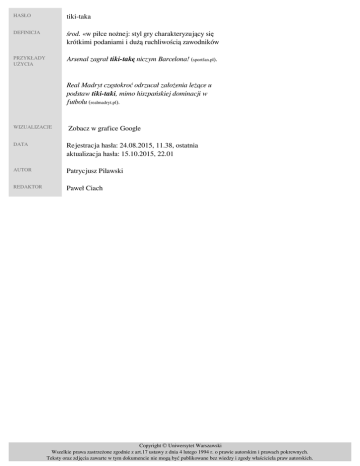 HASŁO tiki-taka DEFINICJA środ. «w piłce nożnej: styl gry charakteryzujący się krótkimi podaniami i dużą ruchliwością zawodników» PRZYKŁADY UŻYCIA Arsenal zagrał tiki-takę niczym Barcelona! (sportfan.pl). Real Madryt częstokroć odrzucał założenia leżące u podstaw tiki-taki, mimo hiszpańskiej dominacji w futbolu (realmadryt.pl). WIZUALIZACJE Zobacz w grafice Google DATA Rejestracja hasła: 24.08.2015, 11.38, ostatnia aktualizacja hasła: 15.10.2015, 22.01 AUTOR Patrycjusz Pilawski REDAKTOR Paweł Ciach Copyright © Uniwersytet Warszawski Wszelkie prawa zastrzeżone zgodnie z art.17 ustawy z dnia 4 lutego 1994 r. o prawie autorskim i prawach pokrewnych. Teksty oraz zdjęcia zawarte w tym dokumencie nie mogą być publikowane bez wiedzy i zgody właściciela praw autorskich. Powered by TCPDF (www.tcpdf.org)