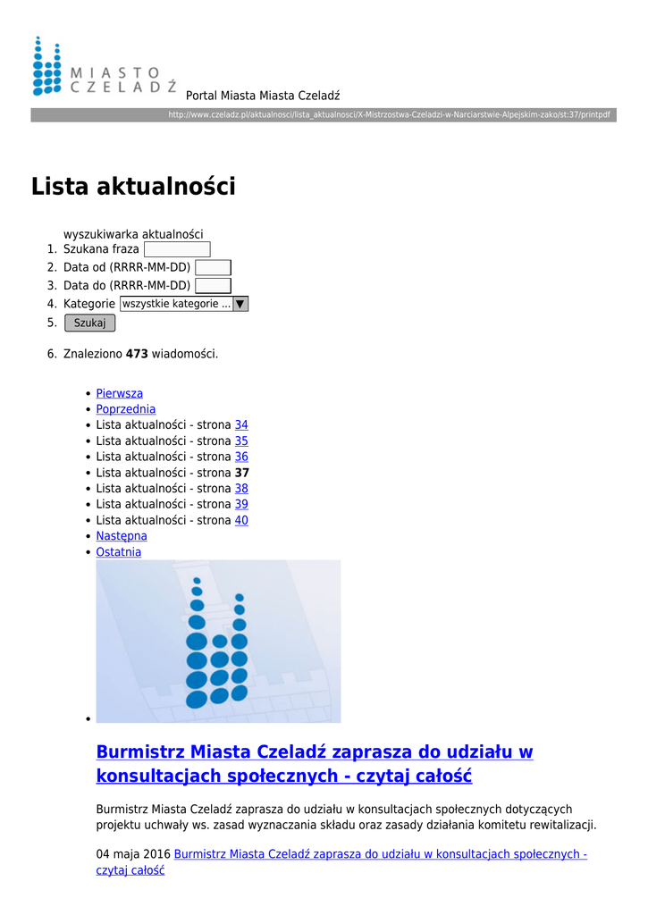 Portal Miasta Miasta Czeladź http://www.czeladz.pl/aktualnosci/lista_aktualnosci/X-Mistrzostwa-Czeladzi-w-Narciarstwie-Alpejskim-zako/st:37/printpdf Lista aktualności wyszukiwarka aktualności 1. Szukana fraza 2. Data od (RRRR-MM-DD) 3. Data do (RRRR-MM-DD) 4. Kategorie wszystkie kategorie ... ▼ 5. Szukaj 6. Znaleziono 473 wiadomości. Pierwsza Poprzednia Lista aktualności - strona 34 Lista aktualności - strona 35 Lista aktualności - strona 36 Lista aktualności - strona 37 Lista aktualności - strona 38 Lista aktualności - strona 39 Lista aktualności - strona 40 Następna Ostatnia Burmistrz Miasta Czeladź zaprasza do udziału w konsultacjach społecznych - czytaj całość Burmistrz Miasta Czeladź zaprasza do udziału w konsultacjach społecznych dotyczących projektu uchwały ws. zasad wyznaczania składu oraz zasady działania komitetu rewitalizacji. 04 maja 2016 Burmistrz Miasta Czeladź zaprasza do udziału w konsultacjach społecznych czytaj całość Obchody Święta Konstytucji 3 Maja - czytaj całość Tegoroczne obchody Święta Konstytucji 3 Maja były bardzo uroczyste. 04 maja 2016 Obchody Święta Konstytucji 3 Maja - czytaj całość Świętowali diamentowe i złote gody - czytaj całość Kolejne piękne jubileusze małżeńskie świętowały pary z Czeladzi. 02 maja 2016 Świętowali diamentowe i złote gody - czytaj całość Majówka w Czeladzi – cz. I - czytaj całość Majówka w Czeladzi rozpoczęła się… w kwietniu. W piątek, 30 kwietnia 2016 roku o 19.30 otworzyły swe podwoje letnie ogródki na rynku Starego Miasta. 02 maja 2016 Majówka w Czeladzi – cz. I - czytaj całość Spektakl teatralny pt. „Przygody drwala Bartłomieja” czytaj całość Miasto Czeladź wraz z Spółdzielczym Domem Kultury „Odeon” serdecznie zapraszają wszystkie dzieciaki na spektakl teatralny pt. „Przygody drwala Bartłomieja” 02 maja 2016 Spektakl teatralny pt. „Przygody drwala Bartłomieja” - czytaj całość Mistrzowie wiedzy o Czeladzi - czytaj całość 27 kwietnia w siedzibie Muzeum Saturn odbył się finał Konkursu Wiedzy o Czeladzi, nad którym honorowy patronat tradycyjnie objął Burmistrz Miasta Czeladź. 29 kwietnia 2016 Mistrzowie wiedzy o Czeladzi - czytaj całość Gminny Program Rewitalizacji Miasta Czeladź na lata 2016-2023 - czytaj całość Burmistrz Miasta Czeladź przystąpił do wykonania Strategicznej Oceny Oddziaływania na Środowisko dla opracowania „Gminnego Programu Rewitalizacji Miasta Czeladź na lata 2016-2023”. 29 kwietnia 2016 Gminny Program Rewitalizacji Miasta Czeladź na lata 2016-2023 - czytaj całość Setne urodziny Stanisławy Lesiak - czytaj całość W czwartek, 28 kwietnia br. czeladzianka Stanisława Lesiak obchodziła swoje setne urodziny. 29 kwietnia 2016 Setne urodziny Stanisławy Lesiak - czytaj całość Burmistrz wyróżnił najzdolniejszych - czytaj całość Podczas wczorajszej sesji Rady Miejskiej w Czeladzi Burmistrz Miasta Czeladź Zbigniew Szaleniec nagrodził tegorocznych laureatów Wojewódzkich Konkursów Przedmiotowych. 29 kwietnia 2016 Burmistrz wyróżnił najzdolniejszych - czytaj całość Strategia Rozwoju Miasta Czeladź - konsultacje społeczne - czytaj całość 29 kwietnia 2016 r. rozpoczynają się konsultacje społeczne projektu Strategii Rozwoju Miasta Czeladź na lata 2016-2023. 29 kwietnia 2016 Strategia Rozwoju Miasta Czeladź - konsultacje społeczne - czytaj całość Pierwsza Poprzednia Lista aktualności - strona 34 Lista aktualności - strona 35 Lista aktualności - strona 36 Lista aktualności - strona 37 Lista aktualności - strona 38 Lista aktualności - strona 39 Lista aktualności - strona 40 Następna Ostatnia