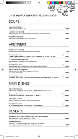 CHEF OLIWIA BERNADY RECOMMENDS: SOUPS KOHLRABI CREAM with chard-cucumber salsa 15.00 LEMON MOUSSE LIME with wild black rice, carmelised pistachio and coriander emulsion 19.00 RABBIT CONSOMME with herbal pearl barley, fennel and linseed 20.00 APETISERS BURNT GOAT CHEESE celeriac chips, enoki mushrooms, pear reduction Recommended wine: CHARDONAY VIOGNER LORGERIL 1620 IGP PAYS D’OC /75CL BLANC 27.00 100.00 STURGEON PICKLED IN LIME with galangal, roasted lemon and watercress 29.00 Recommended wine: GEORGE BREUER CHARM QBA RHEINGAU /75 CL WHITE 156.00 GRILLED MINI AUBERGINES with goat cheese and thyme mousse with celery and coconut milk salsa 26.00 Recommended wine: DOMAINE ROGER BELLAND AOC BOURGOGNE PINOT NOIR /75 CL ROUGE 170.00 MAIN DISHES ROAST STURGEON with orange rissotto, glazed Kohlrabi, samphire, beurre blanc sauce56.00 Recommended wine: BERNARD DEFAIX AOC CHABLIS /75 CL WHITE 160.00 SOUS VIDE RABBIT with spinach puree, scallion confit, burnt parsnip65.00 Recommended wine: ATTEMS SAUVIGNON DOC COLLIO /75 CL BIANCO 142.00 DESERTS MERINGUE WITH MASCARPONE-LIME CREAM WITH MINT with reen peas mousse, blueberries salsa20.00 ANISEED MOUSSE with white chocolate, yoghurt and nut cream, pineapple and passion fruit coulis with roast sunflower seeds 21.00 Menu chef NOWE 511.indd 1 07.05.2015 13:38 SZEF KUCHNI OLIWIA BERNADY POLECA: ZUPY KREM Z KALAREPY z salsą botwinkowo-ogórkową 15.00 KREM Z MUSU CYTRYNOWEGO z czarnym ryżem, karmelizowaną pistacją i emulsją z kolendry 19.00 CONSOMME Z KRÓLIKA z ziołowym pęczakiem, fenkułem i siemieniem lnianym20.00 PRZYSTAWKI OPALANY SER KOZI z chipsem z selera, grzybami enoki i redukcją z gruszki Rekomendowane wino: CHARDONAY VIOGNER LORGERIL 1620 IGP PAYS D’OC /75 CL BLANC 27.00 100.00 MARYNOWANY W LIMONCE JESIOTR z galangalem, pieczoną cytryną i rukwią wodną 29.00 Rekomendowane wino: GEORGE BREUER CHARM QBA RHEINGAU /75 CL WHITE 156.00 GRILLOWANE MINI BAKŁAŻANY z musem z sera owczego i tymianku z salsą z selera naciowego i mleczka kokosowego 26.00 Rekomendowane wino: DOMAINE ROGER BELLAND AOC BOURGOGNE PINOT NOIR /75 CL ROUGE 170.00 DANIA GŁÓWNE JESIOTR PIECZONY z risotto pomarańczowym, glazurowaną kalarepą, solirodem i sosem beurre blanc56.00 Rekomendowane wino: BERNARD DEFAIX AOC CHABLIS /75 CL WHITE 160.00 KRÓLIK SOUS VIDE z puree szpinakowym, szalotką confit i palonym pasternakiem65.00 Rekomendowane wino: ATTEMS SAUVIGNON DOC COLLIO /75 CL BIANCO 142.00 DESERTS BEZA Z LIMONKOWO-MIĘTOWYM KREMEM MASCARPONE z musem z zielonego groszku i salsą jagodową20.00 MUS ANYŻOWY z biała czekoladą, kremem jogurtowo-orzechowym, coulis z ananasa i marakui i prażonym słonecznikiem 21.00 Menu chef NOWE 511.indd 2 07.05.2015 13:38