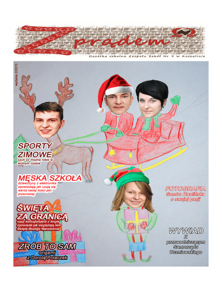 Parê slów od Redakcji ... :) Nasta³ ten czas, w którym na ulicach zamieszanie. Ka¿dy sprz¹ta swe mieszkanie. Ludzi szczere uœmiechy sobie wysy³aj¹ i serdeczne ¿yczenia sk³adaj¹. Nadszed³ wiêc czas na z³o¿enie wam ¿yczeñ od nas. Zatem ca³a nasza redakcja bez ¿adnego wyj¹tku ¿yczy mnóstwo prezentów w Miko³aja worku. Zdrowia na zimê, wytrwa³oœci w najgorsz¹ œnie¿ycê. Najweselszych œwi¹t Bo¿ego Narodzenia, bardzo dobrze przygotowanego przez was jedzenia. Niech gwiazda Betlejemska œwieci ca³¹ moc¹ nad wami i du¿o mi³oœci kochani. Niechaj te œwiêta bêd¹ radosne i ¿eby postanowienia noworoczne by³y proste. Niech rok nowy wniesie blasku do serc waszych. To na tyle ¿yczeñ naszych, wiêc w skrócie Weso³ych, spokojnych i zdrowych œwi¹t ¿yczy redakcja EKSTREMALNE SPORTY ZIMOWE Aleksandra Chmielewska S port wp³ywa nie tylko na nasz¹ kondycjê, ale równie¿ na nasze samopoczucie. Nied³ugo czeka nas bia³e szaleñstwo, wiêc warto bêdzie spêdziæ trochê czasu na œwie¿ym powietrzu. Tym, których ulubionym zajêciem nie s¹ tradycyjne narty czy ³y¿wy, redakcja poleca ekstremalne sporty zimowe. Nie trzeba byæ zawodowcem, by zacz¹æ siê nimi zajmowaæ. Wystarcz¹ tylko chêci spróbowania czegoœ nowego. Nasuwa siê pytanie, wiêc z których ekstremalnych sportów zimowych mo¿emy wybieraæ ? ICECLIMBING – sport ten jest bardzo niebezpieczny. Wspinaczka lodowa wymaga odpowiedniej kondycji, przygotowania i sprzêtu. Ta ekscytuj¹ca podró¿ po ró¿nych formacjach ska³ skutych lodem wymaga te¿ zastosowania odpowiedniej techniki, która dostosuje siê do nachylenia i tekstury lodu. ICEBIKING – jazda rowerem po oblodzonych b¹dŸ oœnie¿onych powierzchniach. Ten rodzaj sportu mo¿e uprawiaæ ka¿dy, kto posiada rower, najlepiej górski. Sprzêt powinien byæ wyposa¿ony w opony z kolcami, a tak¿e specjalnie ³añcuchy, które u³atwiaj¹ utrzymanie siê na lodzie. Zawody icebikowe odbywaj¹ siê m.in. na szlakach górskich, rowerowych lub nawet na zamarzniêtych jeziorach. W Polsce swoich si³ w tym sporcie ludzie próbuj¹ najczêœciej w górach. Pojêcie samego ICEBIKINGU wymyœli³ Joe Clark. HELISKIING – jest to jazda na nartach poza trasami, które zosta³y to tego wyznaczone. Mówi siê, i¿, najatrakcyjniejszym elementem tego sportu jest lot helikopterem do punktu startu. Lecz jest to bardzo kosztowne. Ka¿dy kto zechce uprawiaæ Heliskiing musi mieæ pe³ne wyposa¿enie lawinowe, czyli ³opatê sondê lawinow¹ oraz detektor. Ta forma narciarstwa s³awna jest w Szwajcarii, Rosji, Kanadzie, Hiszpanii, USA i we W³oszech. Jest on jednak zakazany w Austrii i we Francji, ze wzglêdu na przepisy dotycz¹ce ochrony przyrody. SKIBOB- sport ten polega na po³¹czeniu nart i roweru. Rower zamiast tradycyjnych kó³ ma narty. Do butów przypinane s¹ krótkie deski, które s¹ pomoc¹ w utrzymaniu stabilnoœci. Do uprawiania tego sportu potrzebny jest sprawnie technicznie sprzêt oraz wodoodporny ubiór. Skibob powsta³ w latach 40-tych XX w. i mia³ s³u¿yæ jako transport w Alpach. Do skibobu najlepiej nadaj¹ siê strome stoki gór np.. w Tatrach lub Alpach. Pamiêtajmy, ¿e uprawianie ekstremalnych sportów zimowych wymaga nie tylko dobrej kondycji, ale równie¿ odpowiedniego stroju i sprzêtu, co wymaga niestety sporych kosztów. Je¿eli jednak zdecydujemy siê na to , mo¿emy najpierw zakupiæ skarbonkê i powoli zbieraæ pieni¹¿ki na ekstremaln¹ przygodê. Mêska szkola okiem dziewczyny Daria Kordowska Wiele z nas myœli sobie , ¿e uczêszczaæ do szko³y ,gdzie s¹ prawie sami ch³opacy to trudne zadanie.Niekoniecznie tak jest. Zapytacie dlaczego ? Zapewne wiêkszoœæ dziewczyn , gdy wybiera³y tê szko³ê nie wiedzia³o , ¿e w jest w niej taka du¿a liczba ch³opaków. Profile s¹ typowo mêskie , dlatego niektórych klasach mo¿na ujrzeæ maksymalnie dwie dziewczyny , które s¹ jedynymi w klasie. My – dziewczyny nie mamy ³atwo, poniewa¿ wesz³yœmy do œwiata ch³opaków , których tematy rozmów na przerwach obejmuj¹ sport i gry komputerowe. Teraz, gdy w szkole pojawia siê coraz wiêcej dziewczyn ze wzglêdu na nowy profil w naszej szkole , który jak najbardziej nadaje siê dla dziewczyn, jak i równie¿ ch³opców, to ch³opacy maj¹ nowe tematy do obgadania. Dziewczyny , którym ³atwo p r zyc h o d z i p oz n a wa n i e n o w yc h l u d z i a szczególnie p³eæ przeciwn¹ ,odnajd¹ siê w tej szkole i nie bêd¹ mia³y ¿adnego problemu. S¹ plusy bycia w mêskiej szkole- mo¿na staæ siê czêœci¹ ich œwiata , lepiej poznaæ ich zainteresowania, na co zwracaj¹ wiêksz¹ uwagê w dziewczynie ,i wiele innych tematów , o których dziewczyny nie maj¹ pojêcia. Z ch³opakami bardzo czêsto mo¿na lepiej siê dogadaæ, ni¿ z dziewczynami, poniewa¿ oni maj¹ inne zwyczaje i myœl¹ w inny sposób. W tej szkole wiêkszoœæ ch³opaków siê ze sob¹ zna, co u³atwia nam dziewczynom zapoznanie siê np. z dobrym koleg¹ naszego przyjaciela, kuzyna czy brata. Nauka w mêskiej szkole ma swoje PLUSY. Nasza szkola w rytmie muzyki Konstancja Pawlikowska Muzykê tê tworzy siê g³ównie lub wy³¹cznie za pomoc¹ elektrofonów czyli elektromechanicznych i elektronicznych instrumentów muzycznych oraz urz¹dzeñ elektronicznych przetwarzaj¹cych dŸwiêki pozamuzyczne lub generowane przez tradycyjne instrumenty akustyczne. Muzyka elektroniczna jest kontynuacj¹ muzyki mechanicznej. Swój pocz¹tek ma i ona w okolicach 1910 roku, lecz do kultury masowej zaczê³a wchodziæ dopiero w 1970 roku. Utwór ,,Popcorn" nagrany przez Hot Butter w 1972 roku staje siê pierwszym singlowym hitem muzyki elektronicznej. Lata 80 dla tej muzyki to najwiêkszy prze³om , gdy¿ w tym okresie jest najwiêkszy rozwój technologiczny w dziedzinie instrumentów. W latach 80-tych XX wieku rozpocz¹³ siê okres muzyki elektronicznej w Polsce . Jej wykonawcami byli : Marek Biliñski, Konrad Kucz, Artur Lasoñ, £osowski, ale tak¿e 