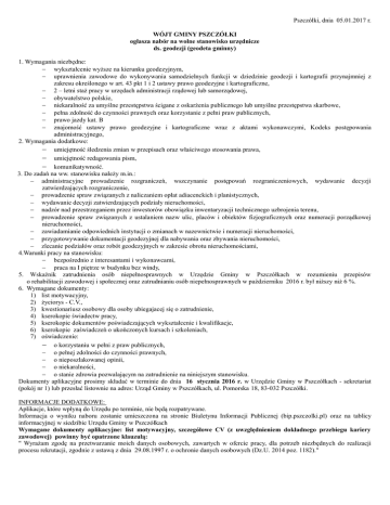 Pszczółki, dnia 05.01.2017 r. WÓJT GMINY PSZCZÓŁKI ogłasza nabór na wolne stanowisko urzędnicze ds. geodezji (geodeta gminny) 1. Wymagania niezbędne: wykształcenie wyższe na kierunku geodezyjnym, uprawnienia zawodowe do wykonywania samodzielnych funkcji w dziedzinie geodezji i kartografii przynajmniej z zakresu określonego w art. 43 pkt 1 i 2 ustawy prawo geodezyjne i kartograficzne, 2 – letni staż pracy w urzędach administracji rządowej lub samorządowej, obywatelstwo polskie, niekaralność za umyślne przestępstwa ścigane z oskarżenia publicznego lub umyślne przestępstwa skarbowe, pełna zdolność do czynności prawnych oraz korzystanie z pełni praw publicznych, prawo jazdy kat. B znajomość ustawy prawo geodezyjne i kartograficzne wraz z aktami wykonawczymi, Kodeks postępowania administracyjnego, 2. Wymagania dodatkowe: umiejętność śledzenia zmian w przepisach oraz właściwego stosowania prawa, umiejętność redagowania pism, komunikatywność. 3. Do zadań na ww. stanowisku należy m.in.: administracyjne prowadzenie rozgraniczeń, wszczynanie postępowań rozgraniczeniowych, wydawanie decyzji zatwierdzających rozgraniczenie, prowadzenie spraw związanych z naliczaniem opłat adiacenckich i planistycznych, wydawanie decyzji zatwierdzających podziały nieruchomości, nadzór nad przestrzeganiem przez inwestorów obowiązku inwentaryzacji technicznego uzbrojenia terenu, prowadzenie spraw związanych z ustalaniem nazw ulic, placów i obiektów fizjograficznych oraz numeracji porządkowej nieruchomości, zawiadamianie odpowiednich instytucji o zmianach w nazewnictwie i numeracji nieruchomości, przygotowywanie dokumentacji geodezyjnej dla nabywania oraz zbywania nieruchomości, zlecanie podziałów oraz robót geodezyjnych w zakresie obrotu nieruchomościami, 4.Warunki pracy na stanowisku: bezpośrednio z interesantami i wykonawcami, praca na I piętrze w budynku bez windy, 5. Wskaźnik zatrudnienia osób niepełnosprawnych w Urzędzie Gminy w Pszczółkach w rozumieniu przepisów o rehabilitacji zawodowej i społecznej oraz zatrudnianiu osób niepełnosprawnych w październiku 2016 r. był niższy niż 6 %. 6. Wymagane dokumenty: 1) list motywacyjny, 2) życiorys - C.V., 3) kwestionariusz osobowy dla osoby ubiegajacej się o zatrudnienie, 4) kserokopie świadectw pracy, 5) kserokopie dokumentów poświadczających wykształcenie i kwalifikacje, 6) kserokopie zaświadczeń o ukończonych kursach i szkoleniach, 7) oświadczenie: o korzystaniu w pełni z praw publicznych, o pełnej zdolności do czynności prawnych, o nieposzlakowanej opinii, o niekaralności, o stanie zdrowia pozwalającym na zatrudnienie na niniejszym stanowisku. Dokumenty aplikacyjne prosimy składać w terminie do dnia 16 stycznia 2016 r. w Urzędzie Gminy w Pszczółkach - sekretariat (pokój nr 1) lub przesłać listownie na adres: Urząd Gminy w Pszczółkach, ul. Pomorska 18, 83-032 Pszczółki. INFORMACJE DODATKOWE: Aplikacje, które wpłyną do Urzędu po terminie, nie będą rozpatrywane. Informacja o wyniku naboru zostanie umieszczona na stronie Biuletynu Informacji Publicznej (bip.pszczolki.pl) oraz na tablicy informacyjnej w siedzibie Urzędu Gminy w Pszczółkach Wymagane dokumenty aplikacyjne: list motywacyjny, szczegółowe CV (z uwzględnieniem dokładnego przebiegu kariery zawodowej) powinny być opatrzone klauzulą: " Wyrażam zgodę na przetwarzanie moich danych osobowych, zawartych w ofercie pracy, dla potrzeb niezbędnych do realizacji procesu rekrutacji, zgodnie z ustawą z dnia 29.08.1997 r. o ochronie danych osobowych (Dz.U. 2014 poz. 1182)."