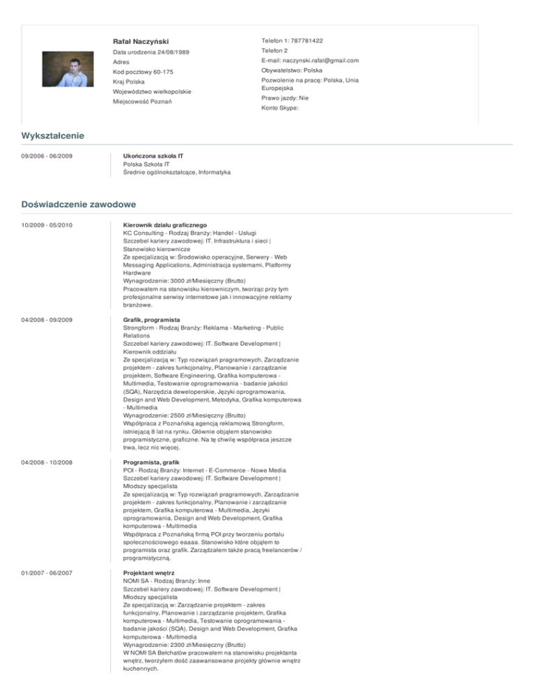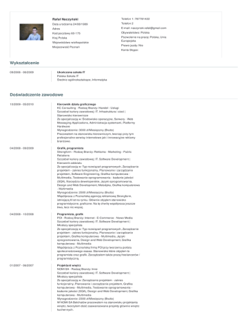 Rafał Naczyński Telefon 1: 787781422 Data urodzenia 24/08/1989 Telefon 2 Adres E-mail: [email protected] Kod pocztowy 60-175 Obywatelstwo: Polska Kraj Polska Pozwolenie na pracę: Polska, Unia Europejska Województwo wielkopolskie Miejscowość Poznań Prawo jazdy: Nie Konto Skype: Wykształcenie 09/2006 - 06/2009 Ukończona szkoła IT Polska Szkoła IT Średnie ogólnokształcące, Informatyka Doświadczenie zawodowe 10/2009 - 05/2010 Kierownik działu graficznego KC Consulting - Rodzaj Branży: Handel - Usługi Szczebel kariery zawodowej: IT. Infrastruktura i sieci | Stanowisko kierownicze Ze specjalizacją w: Środowisko operacyjne, Serwery - Web Messaging Applications, Administracja systemami, Platformy Hardware Wynagrodzenie: 3000 zł/Miesięczny (Brutto) Pracowałem na stanowisku kierowniczym, tworząc przy tym profesjonalne serwisy internetowe jak i innowacyjne reklamy branżowe. 04/2008 - 09/2009 Grafik, programista Strongform - Rodzaj Branży: Reklama - Marketing - Public Relations Szczebel kariery zawodowej: IT. Software Development | Kierownik oddziału Ze specjalizacją w: Typ rozwiązań pragramowych, Zarządzanie projektem - zakres funkcjonalny, Planowanie i zarządzanie projektem, Software Engineering, Grafika komputerowa Multimedia, Testowanie oprogramowania - badanie jakości (SQA), Narzędzia deweloperskie, Języki oprogramowania, Design and Web Development, Metodyka, Grafika komputerowa - Multimedia Wynagrodzenie: 2500 zł/Miesięczny (Brutto) Współpraca z Poznańską agencją reklamową Strongform, istniejącą 8 lat na rynku. Głównie objąłem stanowisko programistyczne, graficzne. Na tę chwilę współpraca jeszcze trwa, lecz nic więcej. 04/2008 - 10/2008 Programista, grafik POI - Rodzaj Branży: Internet - E-Commerce - Nowe Media Szczebel kariery zawodowej: IT. Software Development | Młodszy specjalista Ze specjalizacją w: Typ rozwiązań pragramowych, Zarządzanie projektem - zakres funkcjonalny, Planowanie i zarządzanie projektem, Grafika komputerowa - Multimedia, Języki oprogramowania, Design and Web Development, Grafika komputerowa - Multimedia Współpraca z Poznańską firmą POI przy tworzeniu portalu społecznościowego eaaaa. Stanowisko które objąłem to programista oraz grafik. Zarządzałem także pracą freelancerów / programistyczną. 01/2007 - 06/2007 Projektant wnętrz NOMI SA - Rodzaj Branży: Inne Szczebel kariery zawodowej: IT. Software Development | Młodszy specjalista Ze specjalizacją w: Zarządzanie projektem - zakres funkcjonalny, Planowanie i zarządzanie projektem, Grafika komputerowa - Multimedia, Testowanie oprogramowania badanie jakości (SQA), Design and Web Development, Grafika komputerowa - Multimedia Wynagrodzenie: 2300 zł/Miesięczny (Brutto) W NOMI SA Bełchatów pracowałem na stanowisku projektanta wnętrz, tworzyłem dość zaawansowane projekty głównie wnętrz kuchennych. kuchennych. 04/2006 - 01/2007 Programista, grafik Globsat Sp. z o.o. - Rodzaj Branży: Inne Szczebel kariery zawodowej: IT. Software Development | Młodszy specjalista Ze specjalizacją w: Typ rozwiązań pragramowych, Zarządzanie projektem - zakres funkcjonalny, Planowanie i zarządzanie projektem, Grafika komputerowa - Multimedia, Testowanie oprogramowania - badanie jakości (SQA), Narzędzia deweloperskie, Języki oprogramowania, Design and Web Development, Grafika komputerowa - Multimedia Wynagrodzenie: 3000 zł/Miesięczny (Brutto) W Bełchatowskiej firmie Globsat pełniłem funkcję programisty oraz grafika, tworząc serwisy na rzecz firmy, jak i dla zleceniodawców zewnętrznych. Również organizowałem klientów, którzy chętnie z nami współpracowali. Prowadziłem także w późniejszym etapie grupę freelancerów. Umiejętności Umiejętność – stopień zaawansowany Adobe Photoshop (Ponad 10 lat) Od pierwszych wersji Photoshopa zajmuję się grafiką, uczę się cały czas odkrywając w sobie nowe zmysły jak i wizje graficzne. Zarządzanie dużymi projektami (4 - 5 lat) Zarządzałem wieloma dużymi projektami unijnymi. Kierowanie projektami (4 - 5 lat) Projektowanie graficzne (Ponad 10 lat) Projektowanie graficzne witryn WWW (5 - 10 lat) Na swoim koncie mam ponad 100 wykonanych layoutów, co sprawia że doskonale czuje się w tworzeniu layoutów jak i interfejsów. Narzędzia do zarządzania projektami (2 - 3 lat) Narzędzia do zarządzania projektami mam w małym palcu, przy czym również jedno tego typu narzędzie sam stworzyłem. Umiejętność – stopień średni Rozwiazania Klient/Serwer (4 - 5 lat) Mam wysokie doświadczenie w zarządzaniu serwerami Windows/Linux. Instalowałem wiele serwerów WWW na serwerach dedykowanych, zarządzałem z nimi, instalowałem aplikacje do zarządzania serwerami (tj. bazy danych, skrzynki e-mail itp.). e-Commerce (4 - 5 lat) Uczestniczyłem w kampaniach e-Commerce, tworzyłem aplikację dla tej dziedziny informatyki jak współpracowałem z profesjonalistami. CSS (Cascading Style Sheets) (5 - 10 lat) HTML (5 - 10 lat) JavaScript (5 - 10 lat) PHP / PHP3 (4 - 5 lat) Mam średnie doświadczenie w programowaniu, mimo kilku aplikacji wskazano mi w nich błędy programistyczne, nad którymi ciągle pracuję w ten sposób ucząc się coraz to nowych rozwiązań. SQL (4 - 5 lat) CorelDraw (4 - 5 lat) Moje pierwsze logotypy powstawały w tym programie, potem postacie ludzie i tak powoli przeskoczyłem na Adobe Illustrator, który dziś znam doskonale. Technologie informacyjne (1 - 2 lat) Przygotowanie przedsięwziecia (4 - 5 lat) Planowanie projektu wizualnego (5 - 10 lat) Umiejętność – stopień podstawowy DHTML (5 - 10 lat) Kampania reklamowa (1 - 2 lat) Ogłoszenia - prasa - TV - Web - radio (4 - 5 lat) Przyszła praca Preferowane stanowisko: Poznań, Wrocław, Warszawa, Łódź Preferowane branże zawodowe: Grafika / Kreacja artystyczna, Instalacje / Utrzymanie / Serwis, Internet / E-Commerce, IT - Bazy danych, IT - Programowanie / Analizy Preferowana lokalizacja pracy: dolnośląski