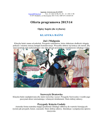 Agencja Artystyczna KANON [email protected] Tel.: 12 642 52 90, 91, 92 12 358 11 98 31-871 Kraków, os Dywizjonu 303 5\143, NIP 675-110-05-44 Oferta programowa 2013\14 Opisy bajek (do wyboru) KLASYKA BAŚNI Jaś i Małgosia Klasyka baśni znana od pokoleń. Perypetie rodzeństwa, które złaknione słodkości ulegają pokusie i niestety muszą nastąpić konsekwencje. Wszystko dobrze się kończy ale morał, aby mieć kontrolę nad zachciankami i nie ufać obcym pozostaje w świadomości młodego widza. Szewczyk Dratewka Klasyka baśni zaadaptowana aby nieść rozrywkę i uczyć. Przygody Szewczyka i wyniki jego poczynań dzieci utożsamiają z własnymi działaniami. Dużo dobrej zabawy. Przygody Księcia Gaduły Autorska forma teatralna mająca przekonać młodego odbiorcę do wartości kierujących życiem jak przyjaźń, honor, szacunek. Dużo dobrej zabawy. Interakcja i sympatyczna oprawa muzyczna. Czerwony Kapturek Adaptacja baśni Charlesa Perraulta – żywiołowa akcja pełna zwrotów i zaskakujących, humorystycznych odnośników do rzeczywistości. Morał i czynny udział widzów czynią to przedstawienie miłym dla oka i ucha młodego widza wydarzeniem PRZYGODOWE Recepta na Leniuszka Autorska forma teatralna traktująca o tym jak złe nawyki (lenistwa) przekładają się na relacje z bliskimi i otoczeniem. Każdy z widzów odnajdzie tu cząstkę swojej osobowaści a interaktywana akcja powoduje zmianę zachowania głównego bohatera i uczy widza. Jesienne Opowieści (1)– Wiosenne Porządki (2) Dwuczęściowa składanka teatralna, w której postacie muszą uporać się z problemami praw natury i własnego przetrwania. Poza żywotnymi czynnościami pojawiają się zabarwione humorem sytuacje kreujące oceny ekologiczne. W zależności od pór roku umiejscowione są zjawiska, które mają wpływ na bohaterów bajki, a które interaktywnie sterują widzowie – dzieci i fabuła opowieści np. jesienne gromadzenie zapasów bądź sprzątanie po zimie aby powitać wiosnę. Jak Piotrek chciał zostać piratem Zabawna inscenizacja o przygodach chłopca, który chce zrealizować swoje marzenia. Mimo, iż chce zostać postacią o złym charakterze to jednak musi stosować zwroty grzecznościowe, być miłym dla przyjaciół, szanować starszych. Wartka akcja pełna ironii i humoru Wigilijny prezent Święta Bożego Narodzenia stanowią okazję do refleksji i taką formę przyjmuje nasze przedstawienie. Współczucie, wrażliwość, odpowiedzialność i niesienie pomocy to czynniki niosące przesłąnie dla dzieci. Wszystko w aurze zimy, świąt i zabawy. SPEKTAKL MOŻEMY POŁĄCZYĆ ZE SPOTKANIEM Z POSTACIĄ ŚW. Mikołaja. PROFILAKTYKA Kalejdoskop Zagrożeń – bezpieczeństwo Z leśnej, baśniowej krainy w rzeczywistym świecie pojawia się postać krasnala, który nie wie jak się poruszać po „ miejskiej dżungli.” Dzięki poznanej przyjaciółce uczy się przechodzenia przez jezdnię, poznaje niebezpieczeństwa związane z agresywnymi zwierzętami. Dowiaduje się co to jest Internet i co czyha na niego, kiedy zaufa osobie, której nie zna i jak może przysporzyć sobie problemów, kiedy będzie chciał dowiedzieć się w sposób niekontrolowany czegoś o alkoholu, narkotykach, papierosach. Pomocą służy mu także postać policjantki, która pomaga i uczy, uświadamia bohaterowi i odbiorcom, że każdy zły występek będzie ukarany, a dziecko postępujące nierozsądnie i nie stosujące się do zaleceń i reguł może przysporzyć sobie , rodzicom i opiekunom problemów. Przygody misia Szymka Spektakl wnoszący w życie młodych odbiorców takie wartości jak przyjaźń, lojalność, prawdomówność, szukanie kompromisów, nie poddawanie się trudnym sytuacjom. Miś Szymek uczy zwrotów grzecznościowych i poszanowania cudzej własności. A wszystko w konwencji zabaw zwierzaków gdzieś na leśnej polanie. Benek Brudasek Zapraszamy do czynnego udziału w przedstawieniu o tym jak tytułowy bohater beztrosko oddający się zabawom nie może przekonać się do mycia. Unika wszelkich czynności, które związane są z higieną osobistą. Pojawia się chytry plan ułożony przez przeciwstawną postać i widzów. Kiedy Benek zauważa, że jego zdrowie i ząbki są poważnie zagrożone – radykalnie zmienia swoje nawyki. Wszystko kończy się dobrze. Dużo śmiechu, zabawy i morał płynący z widowiska to główne założenia naszego spektaklu. Przygody Krasnala Pączka Spektakl, w którym chcemy przekazać ile korzyści dla dziecka płynie z aktywnych form spędzania czasu, racjonalnego i higienicznego odżywiania, regularnego spożywania dobrze zbilansowanych posiłków. Unikanie podjadania, wyeliminowanie siedzącego trybu życia i zachowanie w grupie, które zapewnia pełną integrację a co za tym idzie współpracę, zrozumienie i współczucie. Powyższe elementy przekazujemy w bardzo przystępnej formie. Cena jednego przedstawienia - 330 zł
