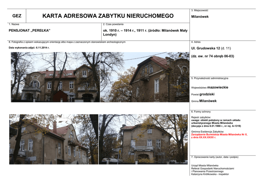 3. Miejscowość GEZ KARTA ADRESOWA ZABYTKU NIERUCHOMEGO 1. Nazwa 2. Czas powstania PENSJONAT „PEREŁKA” ok. 1910 r. – 1914 r., 1911 r. (źródło: Milanówek Mały Londyn) Milanówek 8. Fotografia z opisem wskazującym orientację albo mapa z zaznaczonym stanowiskiem archeologicznym 4. Adres Data wykonania zdjęć: 6.11.2014 r. Ul. Grudowska 12 (d. 11) (dz. ew. nr 74 obręb 06-03) 5. Przynależność administracyjna Województwo mazowieckie Powiat grodziski Gmina Milanówek 6. Formy ochrony Rejestr zabytków: uwaga: obiekt położony w ramach układu urbanistycznego Miasta Milanówka (decyzja z dnia 8.01.1988 r., nr rej. A-1319) Gminna Ewidencja Zabytków: Zarządzenie Burmistrza Miasta Milanówka Nr X, z dnia XX.XX.XXXX r. 7. Opracowanie karty (autor, data i podpis) Urząd Miasta Milanówka Referat Gospodarki Nieruchomościami i Planowania Przestrzennego Katarzyna Królikowska - inspektor