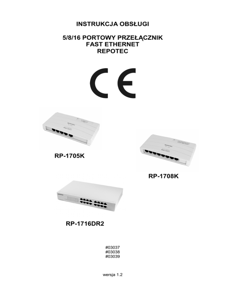 INSTRUKCJA OBSŁUGI 5/8/16 PORTOWY PRZEŁĄCZNIK FAST ETHERNET REPOTEC RP-1705K RP-1708K RP-1716DR2 #03037 #03038 #03039 wersja 1.2 Wstęp Przełączniki serii RP-17xx są przeznaczone głównie dla małych i średnich sieci LAN. KaŜdy port pracuje z niezaleŜną, automatycznie dostosowywaną przepustowością. Istnieje moŜliwość łatwej rozbudowy sieci poprzez kaskadowe łączenie stosowanych przełączników. Funkcja Store&Forward zapewnia efektywne wykorzystanie przepustowości kaŜdego portu oraz zabezpiecza przed utratą pakietów podczas transmisji i odbioru danych. Niewielkie rozmiary, korzystna cena oraz łatwa instalacja sprawia, Ŝe jest to doskonałe urządzenie dla administratorów niewielkich sieci lokalnych. Bezpieczeństwo uŜytkowania Urządzenie zostało zaprojektowane i wyprodukowane z najwyŜszą starannością o bezpieczeństwo osób instalujących i uŜytkujących. Dla zapewnienia bezpieczeństwa pracy, naleŜy stosować się do wszelkich wskazań zawartych w tej instrukcji jak i instrukcjach obsługi urządzeń towarzyszących (np. komputera PC). 1. Zawartość opakowania - 5/8/16/24-portowy niezarządzalny przełącznik serii RP-17xx, - zewnętrzny zasilacz lub przewód zasilający (z zaleŜności od modelu), - niniejsza instrukcja obsługi. Podczas dostawy naleŜy upewnić się, Ŝe opakowanie nie jest uszkodzone. W przypadku stwierdzonych uszkodzeń naleŜy niezwłocznie skontaktować się z dostawcą. Prosimy równieŜ o sprawdzenie zgodności zawartości opakowania z powyŜej zamieszczoną listą. 2. Zawartość tej instrukcji Instrukcja ta zawiera opis przełącznika sieciowego serii RP-17xx z odpowiednimi procedurami instalacji, konfiguracji i uŜytkowania. Przed przystąpieniem do instalacji urządzenia naleŜy dokładnie przeczytać całość tej instrukcji, w szczególności zaś punkty poświęcone bezpieczeństwu. 3. Zasady bezpieczeństwa Przełącznik sieciowy serii RP-17xx jest zgodny z przepisami w zakresie bezpieczeństwa uŜytkowania urządzeń elektrycznych. - gniazdo sieciowe musi być uziemione zgodnie z obowiązującymi przepisami, - przed przeniesieniem lub wykonywaniem innych operacji technicznych urządzenie naleŜy odłączyć od zasilania, - nie stosować uszkodzonych lub zuŜytych przewodów zasilania, gdyŜ powodują one znaczne zagroŜenie dla bezpieczeństwa uŜytkownika, - prace instalacyjne muszą być wykonywane przez odpowiednio przeszkolony personel techniczny, - nie stosować urządzenia w miejscach występowania substancji łatwopalnych, - zabezpieczyć urządzenie przed dostępem dzieci lub osób niepowołanych, - upewnić się, Ŝe urządzenie zostało odpowiednio zamocowane, - urządzenie jest wyłączone dopiero po odłączeniu przewodów zasilania oraz przewodów łączących je z innymi urządzeniami, - jeśli urządzenie zostanie przeniesione z miejsca chłodnego do ciepłego, w jego wnętrzu moŜe skroplić się para wodna uniemoŜliwiając prawidłowe funkcjonowanie - naleŜy wówczas odczekać, aŜ wilgoć odparuje. Uwaga: Nie naleŜy dotykać styków gniazd znajdujących się na obudowie urządzenia. Wyładowanie elektrostatyczne moŜe spowodować trwałe uszkodzenie urządzenia. 4. Instalacja sprzętu 4.1. Zasilanie W zaleŜności od modelu przełącznik moŜe być zasilany: - zasilaczem zewnętrznym DC – naleŜy wpiąć wtyczkę zasilacza do sieci prądu zmiennego 230V, natomiast złącze DC do przełącznika, - zasilaczem wbudowanym – naleŜy podłączyć przełącznik do sieci 230V przy pomocy załączonego przewodu. 2 4.2. Oprogramowanie Do prawidłowego funkcjonowania przełącznika nie jest wymagane instalowanie dodatkowego oprogramowania. 4.3. Środowisko pracy Przełącznik został zaprojektowany do pracy w warunkach biurowych i domowych. NaleŜy zadbać, aby urządzenie umieszczone było w sposób zapewniający dobry przepływ powietrza i łatwy dostęp do portów. Powietrze powinno być wolne od zanieczyszczeń, a urządzenie nie powinno znajdować się w bezpośredniej bliskości źródeł ciepła (piece, grzejniki, bezpośrednie nasłonecznienie) bądź urządzeń generujących zakłócenia elektromagnetyczne (silniki, telewizory itp.). 4.4. Wskaźniki LED Przełącznik naleŜy umieścić w taki sposób, by było widać diody kontrolne umieszczone na przednim panelu urządzenia. Opis diod LED (w niektórych wersjach urządzeń nie występują wszystkie wymienione wskaźniki LED) POWER 100M LINK/ACT Świecenie ciągłe oznacza włączone zasilanie Świecenie ciągłe diody oznacza pracę portu w trybie 100Mbps, brak światła oznacza pracę portu z prędkością 10Mbps Świecenie ciągłe diody oznacza poprawne podłączenie innego urządzenia do portu, świecenie pulsacyjne oznacza przesyłanie pakietów przez port. 5. Instalacja okablowania Dla połączenia przełącznika z innymi urządzeniami sieciowymi zaleca się stosowanie przyłączy odpowiednich dla typu wbudowanych portów. Specyfikacja przyłączy UTP: - przełącznik sieciowy obsługuje funkcje automatycznego krosowania MDI/MDI-X, z tego powodu do podłączenia elementów sieci aktywnych i pasywnych moŜna wykorzystać przyłącza krosowane (cross-over) i niekrosowane (straight-through), - do połączenia przełącznika sieciowego z komputerem naleŜy wykorzystać przyłącze UTP kat. 5 lub wyŜszej, - maksymalna długość zastosowanego przyłącza UTP 100 metrów. 6. Praca z przełącznikiem sieciowym serii RP-17xx - Tablica adresów MAC Przełącznik sieciowy ma wbudowaną pamięć adresów MAC na wiele wpisów. Kolekcjonowanie takich informacji jak adres MAC, numer portu i innych pozwala na prawidłowe funkcjonowanie filtrowania i przekazywania pakietów. Tablica jest uaktualniana automatycznie, wraz ze zmianami połączeń na portach. - Filtrowanie i przekazywanie Gdy przełącznik sieciowy otrzyma pakiet z jednego z portów, sprawdza w tablicy MAC numer portu przypisanego wymaganemu MAC. Jeśli taki znajdzie, przekazuje pakiet do 