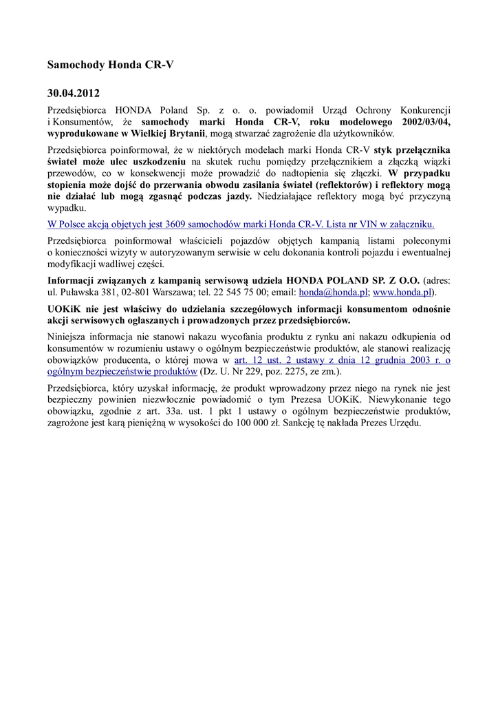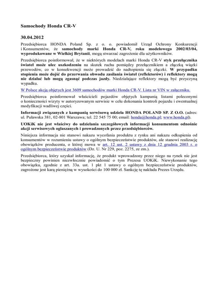 Samochody Honda CR-V 30.04.2012 Przedsiębiorca HONDA Poland Sp. z o. o. powiadomił Urząd Ochrony Konkurencji i Konsumentów, Ŝe samochody marki Honda CR-V, roku modelowego 2002/03/04, wyprodukowane w Wielkiej Brytanii, mogą stwarzać zagroŜenie dla uŜytkowników. Przedsiębiorca poinformował, Ŝe w niektórych modelach marki Honda CR-V styk przełącznika świateł moŜe ulec uszkodzeniu na skutek ruchu pomiędzy przełącznikiem a złączką wiązki przewodów, co w konsekwencji moŜe prowadzić do nadtopienia się złączki. W przypadku stopienia moŜe dojść do przerwania obwodu zasilania świateł (reflektorów) i reflektory mogą nie działać lub mogą zgasnąć podczas jazdy. Niedziałające reflektory mogą być przyczyną wypadku. W Polsce akcją objętych jest 3609 samochodów marki Honda CR-V. Lista nr VIN w załączniku. Przedsiębiorca poinformował właścicieli pojazdów objętych kampanią listami poleconymi o konieczności wizyty w autoryzowanym serwisie w celu dokonania kontroli pojazdu i ewentualnej modyfikacji wadliwej części. Informacji związanych z kampanią serwisową udziela HONDA POLAND SP. Z O.O. (adres: ul. Puławska 381, 02-801 Warszawa; tel. 22 545 75 00; email: [email protected]; www.honda.pl). UOKiK nie jest właściwy do udzielania szczegółowych informacji konsumentom odnośnie akcji serwisowych ogłaszanych i prowadzonych przez przedsiębiorców. Niniejsza informacja nie stanowi nakazu wycofania produktu z rynku ani nakazu odkupienia od konsumentów w rozumieniu ustawy o ogólnym bezpieczeństwie produktów, ale stanowi realizację obowiązków producenta, o której mowa w art. 12 ust. 2 ustawy z dnia 12 grudnia 2003 r. o ogólnym bezpieczeństwie produktów (Dz. U. Nr 229, poz. 2275, ze zm.). Przedsiębiorca, który uzyskał informację, Ŝe produkt wprowadzony przez niego na rynek nie jest bezpieczny powinien niezwłocznie powiadomić o tym Prezesa UOKiK. Niewykonanie tego obowiązku, zgodnie z art. 33a. ust. 1 pkt 1 ustawy o ogólnym bezpieczeństwie produktów, zagroŜone jest karą pienięŜną w wysokości do 100 000 zł. Sankcję tę nakłada Prezes Urzędu.