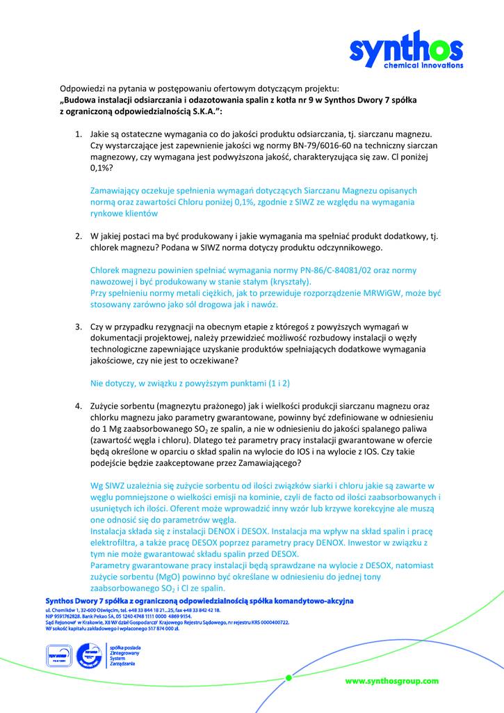 Odpowiedzi na pytania w postępowaniu ofertowym dotyczącym projektu: „Budowa instalacji odsiarczania i odazotowania spalin z kotła nr 9 w Synthos Dwory 7 spółka z ograniczoną odpowiedzialnością S.K.A.”: 1. Jakie są ostateczne wymagania co do jakości produktu odsiarczania, tj. siarczanu magnezu. Czy wystarczające jest zapewnienie jakości wg normy BN-79/6016-60 na techniczny siarczan magnezowy, czy wymagana jest podwyższona jakość, charakteryzująca się zaw. Cl poniżej 0,1%? Zamawiający oczekuje spełnienia wymagań dotyczących Siarczanu Magnezu opisanych normą oraz zawartości Chloru poniżej 0,1%, zgodnie z SIWZ ze względu na wymagania rynkowe klientów 2. W jakiej postaci ma być produkowany i jakie wymagania ma spełniać produkt dodatkowy, tj. chlorek magnezu? Podana w SIWZ norma dotyczy produktu odczynnikowego. Chlorek magnezu powinien spełniać wymagania normy PN-86/C-84081/02 oraz normy nawozowej i być produkowany w stanie stałym (kryształy). Przy spełnieniu normy metali ciężkich, jak to przewiduje rozporządzenie MRWiGW, może być stosowany zarówno jako sól drogowa jak i nawóz. 3. Czy w przypadku rezygnacji na obecnym etapie z któregoś z powyższych wymagań w dokumentacji projektowej, należy przewidzieć możliwość rozbudowy instalacji o węzły technologiczne zapewniające uzyskanie produktów spełniających dodatkowe wymagania jakościowe, czy nie jest to oczekiwane? Nie dotyczy, w związku z powyższym punktami (1 i 2) 4. Zużycie sorbentu (magnezytu prażonego) jak i wielkości produkcji siarczanu magnezu oraz chlorku magnezu jako parametry gwarantowane, powinny być zdefiniowane w odniesieniu do 1 Mg zaabsorbowanego SO2 ze spalin, a nie w odniesieniu do jakości spalanego paliwa (zawartość węgla i chloru). Dlatego też parametry pracy instalacji gwarantowane w ofercie będą określone w oparciu o skład spalin na wylocie do IOS i na wylocie z IOS. Czy takie podejście będzie zaakceptowane przez Zamawiającego? Wg SIWZ uzależnia się zużycie sorbentu od ilości związków siarki i chloru jakie są zawarte w węglu pomniejszone o wielkości emisji na kominie, czyli de facto od ilości zaabsorbowanych i usuniętych ich ilości. Oferent może wprowadzić inny wzór lub krzywe korekcyjne ale muszą one odnosić się do parametrów węgla. Instalacja składa się z instalacji DENOX i DESOX. Instalacja ma wpływ na skład spalin i pracę elektrofiltra, a także pracę DESOX poprzez parametry pracy DENOX. Inwestor w związku z tym nie może gwarantować składu spalin przed DESOX. Parametry gwarantowane pracy instalacji będą sprawdzane na wylocie z DESOX, natomiast zużycie sorbentu (MgO) powinno być określane w odniesieniu do jednej tony zaabsorbowanego SO2 i Cl ze spalin. 5. Czy będą udostępnione bardziej szczegółowe analizy składu spalin? Zamieszczony w SIWZ skład spalin jest bardzo ograniczony. Prosimy o sprecyzowanie wymagań dot. szczegółowości oczekiwanej analizy spalin 6. Czy wskazany w SIWZ okres ruchu regulacyjnego wynoszący 720 godzin może być skrócony do faktycznie potrzebnego okresu na czynności regulacyjne? Ruch regulacyjny musi uwzględnić konieczność wykonania pomiarów, które pozwolą na stwierdzenie zgodności parametrów emisji podanych w SIWZ, zgodnie z oczekiwaniami Inwestora i zgodnie z metodologią IED. Zamawiający dopuszcza maksymalny czas ruchu regulacyjnego do 720 godzin.