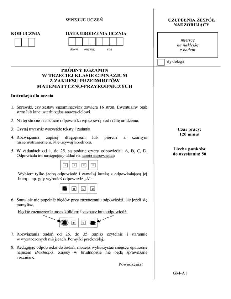 WPISUJE UCZEŃ KOD UCZNIA UZUPEŁNIA ZESPÓŁ NADZORUJĄCY DATA URODZENIA UCZNIA dzień miesiąc miejsce na naklejkę z kodem rok dysleksja PRÓBNY EGZAMIN W TRZECIEJ KLASIE GIMNAZJUM Z ZAKRESU PRZEDMIOTÓW MATEMATYCZNO-PRZYRODNICZYCH Instrukcja dla ucznia 1. Sprawdź, czy zestaw egzaminacyjny zawiera 16 stron. Ewentualny brak stron lub inne usterki zgłoś nauczycielowi. 2. Na tej stronie i na karcie odpowiedzi wpisz swój kod i datę urodzenia. 3. Czytaj uważnie wszystkie teksty i zadania. 4. Rozwiązania zapisuj długopisem lub tuszem/atramentem. Nie używaj korektora. piórem z czarnym 5. W zadaniach od 1. do 25. są podane cztery odpowiedzi: A, B, C, D. Odpowiada im następujący układ na karcie odpowiedzi: A B C Czas pracy: 120 minut Liczba punktów do uzyskania: 50 D Wybierz tylko jedną odpowiedź i zamaluj kratkę z odpowiadającą jej literą – np. gdy wybrałeś odpowiedź „A”: 6. Staraj się nie popełnić błędów przy zaznaczaniu odpowiedzi, ale jeżeli się pomylisz, błędne zaznaczenie otocz kółkiem i zaznacz inną odpowiedź. 7. Rozwiązania zadań od 26. do 35. zapisz czytelnie i starannie w wyznaczonych miejscach. Pomyłki przekreślaj. 8. Redagując odpowiedzi do zadań, możesz wykorzystać miejsca opatrzone napisem Brudnopis. Zapisy w brudnopisie nie będą sprawdzane i oceniane. Powodzenia! GM-A1 Strona 1 z 16 Na mapie zaznaczono 10 krajów, które przystąpiły do Unii Europejskiej 1 maja 2004 roku. Ich powierzchnię podano w tys. km2. Wykorzystując te informacje rozwiąż zadania 1. i 2. 45,2 Skala 1:15 000 000 64,6 Estonia Łotwa Litwa 312,7 65,2 Polska 78,9 49,0 Czechy Słowacja 20,3 93,0 Słowenia 0,3 Węgry Malta 9,3 Źródło: Świat w liczbach 1999/2000 WSiP 1999. Zadanie 1. (0–1) Jakim procentem powierzchni Węgier jest powierzchnia Cypru? A. B. C. D. 0,1% 1% 9,3% 10% Strona 2 z 16 Cypr Zadanie 2. (0–1) Powierzchnia najmniejszego z tych państw jest mniejsza od powierzchni największego państwa około A. B. C. D. 15 razy. 1042 razy. 30 razy. 6 razy. Zadanie 3. (0–1) W trakcie wędrówki po krajach Europy uczniowie zaobserwowali przedstawicieli różnych ras ludzkich. Wielu z nich to mieszańcy rasy białej i czarnej. Nazywamy ich A. B. C. D. Metysami. europeidami. negroidami. Mulatami. Zadanie 4. (0–1) Logo Unii Europejskiej to figura złożona z 12 pięcioramiennych gwiazd (rysunek obok). Figura ta ma A. B. C. D. dokładnie 1 oś symetrii. dokładnie 2 osie symetrii. dokładnie 6 osi symetrii. dokładnie 12 osi symetrii. Zadanie 5. (0–1) Punkty K, L, M, N, P są wierzchołkami pięciokąta foremnego. Punkt O jest środkiem okręgu, do którego należą punkty K, L, M, N, P. Miara kąta α zaznaczonego na rysunku jest równa A. B. C. D. o K α P L .O 30 o 36 o 72 o 45 N Strona 3 z 16 M Na diagramie przedstawiono kurs sprzedaży euro pierwszego dnia każdego z 12 miesięcy. Diagram wykorzystaj do rozwiązania zadań 6., 7. i 8. zł 4,10 4,05 4,00 3,95 3,90 3,85 3,80 3,75 3,70 3,65 3,60 3,55 I II III IV V VI VII VIII IX X XI XII Zadanie 6. (0–1) Za 50 euro kupione w lipcu zapłacono A. B. C. D. 220 zł 202 zł 201 zł 210 zł Zadanie 7. (0–1) W którym miesiącu za 200 euro zapłacono 750 zł? A. W styczniu. B. W maju. C. W czerwcu. Zadanie 8. (0–1) W maju za 540 zł kupiono A. B. C. D. 140 euro. 150 euro. 160 euro. 120 euro. Strona 4 z 16 D. W lutym. miesiące Na mapie Europy zaznaczono 15 państw należących do Unii Europejskiej przed 1 maja 2004 roku. Szwecja A• Finlandia Wielka Brytania B• Irlandia Dania Holandia Niemcy Belgia Francja Hiszpania Portugalia Bruksela Luksemburg Austria Włochy Grecja Zadanie 9. (0–1) Siedzibą parlamentu Unii Europejskiej jest Bruksela. Współrzędne geograficzne Brukseli wynoszą o o A. 4 N i 51 E o o B. 51 N i 4 W o o C. 4 N i 51 W o o D. 51 N i 4 E Zadanie 10. (0–1) Różnica w czasie słonecznym między punktem A w Finlandii a punktem B w Irlandii wynosi A. B. C. D. 40 min 1 godz. 20 min 2 godz. 40 min 2 godz. Strona 5 z 16 Zadanie 11. (0–1) Traktat ustanawiający Unię Europejską wszedł w życie w XX wieku. Rok podpisania tego traktatu jest liczbą czterocyfrową, której cyfra dziesiątek jest o 6 większa od cyfry jedności i której suma cyfr jest równa 22. Zaznacz równanie, które odpowiada treści zadania, jeśli cyfrę jedności oznaczymy przez x. A. x + x + 6 = 22 B. x – 6 + x = 22 C. 10 + x – 6 + x = 22 D. 10 + x + 6 + x = 22 Zadanie 12. (0–1) Chemiczna metoda oczyszczania ścieków polega na A. usuwaniu zanieczyszczeń nierozpuszczalnych przy użyciu urządzeń rozdrabniających i cedzących. B. zmineralizowaniu zanieczyszczeń dzięki działaniu mikroorganizmów. C. wytrąceniu niektórych związków organicznych lub ich neutralizacji. D. usunięciu zanieczyszczeń z wykorzystaniem bakterii beztlenowych. Zadanie 13. (0–1) W trakcie posiłku dzieci rozmawiały ze sobą i jedno z nich zakrztusiło się. Stało się tak dlatego, że podczas przełykania pokarmu dziecko zrobiło nagły A. B. C. D. wdech i powietrze wraz z jedzeniem dostało się do krtani. wydech i powietrze wraz z jedzeniem dostało się do przełyku. wdech i powietrze wraz z jedzeniem dostało się do przełyku. wydech i powietrze wraz z jedzeniem dostało się do krtani. Zadanie 14. (0–1) Zasolenie Bałtyku u wybrzeży Danii wynosi średnio 1,7%. W 200 gramach wody morskiej znajduje się około A. 0,85 g soli. B. 3,4 g soli. C. 8,5 g soli. D. 34 g soli. Strona 6 z 16 energia Zadanie 15. (0–1) (kWh) Na wykresie przedstawiono zależność wytwarzanej w elektrowni wodnej 400000 energii od czasu. Moc tej elektrowni jest równa 300000 A. B. C. D. 100 MW 200 MW 300 MW 400 MW 200000 100000 0 1 3 2 czas (h) Zadanie 16. (0–1) Robert został ugryziony przez mrówkę. Aby zobojętnić kwas mrówkowy zawarty w jadzie mrówki miejsce ugryzienia należy posmarować A. B. C. D. substancją o odczynie obojętnym. substancją o odczynie kwaśnym. substancją o odczynie zasadowym. spirytusem salicylowy