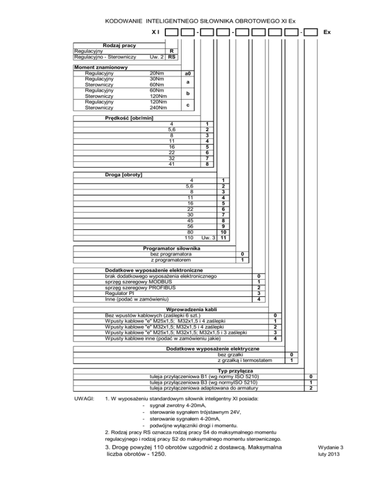KODOWANIE INTELIGENTNEGO SIŁOWNIKA OBROTOWEGO XI Ex XI - Rodzaj pracy Regulacyjny Regulacyjno - Sterowniczy R Uw. 2 RS Moment znamionowy Regulacyjny Regulacyjny Sterowniczy Regulacyjny Sterowniczy Regulacyjny Sterowniczy 20Nm 30Nm 60Nm 60Nm 120Nm 120Nm 240Nm - - Ex a0 a b c Prędkość [obr/min] 4 5,6 8 11 16 22 32 41 1 2 3 4 5 6 7 8 Droga [obroty] 4 5,6 8 11 16 22 30 45 56 80 110 1 2 3 4 5 6 7 8 9 10 Uw. 3 11 Programator siłownika bez programatora z programatorem 0 1 Dodatkowe wyposażenie elektroniczne brak dodatkowego wyposażenia elektronicznego sprzęg szeregowy MODBUS sprzęg szeregowy PROFIBUS Regulator PI Inne (podać w zamówieniu) 0 1 2 3 4 Wprowadzenia kabli Bez wpustów kablowych (zaślepki 6 szt.) Wpusty kablowe "e" M25x1,5; M32x1,5 i 4 zaślepki Wpusty kablowe "e" M32x1,5; M32x1,5 i 4 zaślepki Wpusty kablowe "e" M25x1,5; M32x1,5; M32x1,5 i 3 zaślepki Wpusty kablowe inne (podać w zamówieniu jakie) 0 1 2 3 4 Dodatkowe wyposażenie elektryczne bez grzałki z grzałką i termostatem Typ przyłącza tuleja przyłączeniowa B1 (wg normy ISO 5210) tuleja przyłączeniowa B3 (wg normyISO 5210) tuleja przyłączeniowa adaptowana do armatury UWAGI: 0 1 0 1 2 1. W wyposażeniu standardowym siłownik inteligentny XI posiada: - sygnał zwrotny 4-20mA, - sterowanie sygnałem trójstawnym 24V, - sterowanie sygnałem 4-20mA, - podwójne wyłączniki drogi i momentu. 2. Rodzaj pracy RS oznacza rodzaj pracy S4 do maksymalnego momentu regulacyjnego i rodzaj pracy S2 do maksymalnego momentu sterowniczego. 3. Drogę powyżej 110 obrotów uzgodnić z dostawcą. Maksymalna liczba obrotów - 1250. Wydanie 3 luty 2013 KODOWANIE MODUŁU WAHLIWEGO SIŁOWNIKA X Ex W Regulacyjny Sterowniczy Regulacyjny Sterowniczy Moment znamionowy 250Nm 500Nm 500Nm 1000Nm - - Ex a b Rodzaj wykonania Lewe (mocowanie siłownika obrotowego) Prawe (mocowanie siłownika obrotowego) Lewe (mocowanie siłownika obrotowego) Prawe (mocowanie siłownika obrotowego) L R R L 0 1 2 3 Sposób montażu Bez podstawy Z podstawą 0 1 Typ przyłącza do urządzenia nastawczego tuleja przyłączeniowa B1 (wg normy ISO 5210) tuleja przyłączeniowa B3 (wg normyISO 5210) tuleja przyłączeniowa adaptowana do armatury wałek do przyłączenia korby 0 1 2 3 Wyposażenie dodatkowe Bez wyposażenia Korba stała Korba regulowana Korba stała + cięgno Korba regulowana + cięgno 0 1 2 3 4 Mocowanie cięgna do urządzenia wykonawczego Bez Nakładka ze stożkiem Morse'a Tulejka ze stożkiem Morse'a 0 1 2 sierpień 2009 UWAGI: 1. Ilość obrotów na 90 stopni wynosi 4,25. 2. Od strony napędu moduł Wa posiada przyłącze F07, Wb - F10. 3. Od strony urządzenia nastawczego moduł Wa posiada przyłącze F10, Wb - F14. 4. Moduł wahliwy jest dostarczany z tuleją przyłączniową do siłownika obrotowego. 5. Wykonanie prawe i lewe opisuje rysunek. Wykonanie lewe-L Obracanie kółkiem napędu ręcznego w prawo, powoduje obrót wału wejściowego modułu wahliwego w prawo i obrót korby w lewo. Wykonanie prawe-R Obracanie kółkiem napędu ręcznego w prawo, powoduje obrót wału wejściowego modułu wahliwego w prawo i obrót korby w prawo. Wykonanie lewe-R Obracanie kółkiem napędu ręcznego w prawo, powoduje obrót wału wejściowego modułu wahliwego w prawo i obrót korby w prawo. Wykonanie prawe-L Obracanie kółkiem napędu ręcznego w prawo, powoduje obrót wału wejściowego modułu wahliwego w prawo i obrót korby w lewo. KODOWANIE MODUŁU LINIOWEGO SIŁOWNIKA X Ex L Regulacyjny Sterowniczy Regulacyjny Sterowniczy Siła znamionowa 10 kN 20 kN 20 kN 40 kN - - - Ex a b Skok do 50mm do 100 mm do 125 mm do 150 mm do 200 mm Rodzaj wykonania Lewe (obrót w lewo - cofanie tulei) Prawe (obrót w prawo - cofanie tulei) 1 2 3 4 5 0 1 Kołnierz przyłączeniowy Kołnierz F07 dla modułu La Kołnierz F10 dla modułu La, Lb Gwint trzpienia Gwint trzpienia w module La M12x1,25 Gwint trzpienia w module La M16x1,5 Gwint trzpienia w module Lb M20x1,5 Wyposażenie dodatkowe Bez przyłącza Łącznik (podać dane zaworu) Przyłącze (jarzmo +łącznik podać dane zaworu) 1 2 1 2 3 0 1 2 UWAGI: 1. Moduł liniowy jest dostarczany z tuleją przyłączniową do siłownika obrotowego. 2. Wysuw tulei na 1 obrót w module La i Lb wynosi 5 mm.