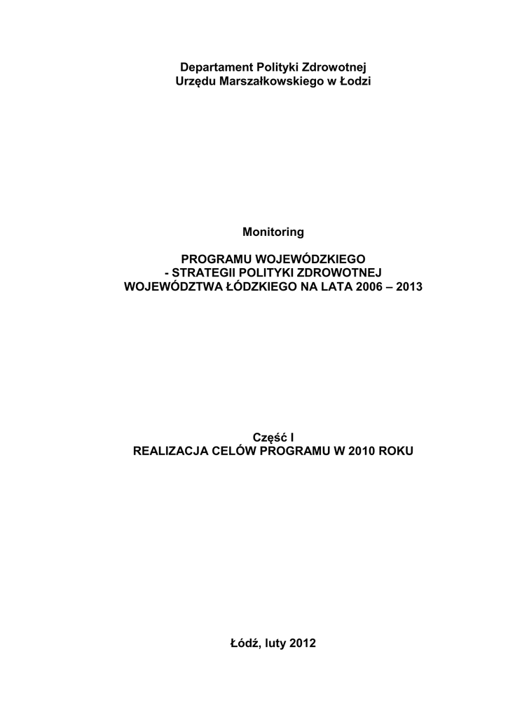 Departament Polityki Zdrowotnej Urzędu Marszałkowskiego w Łodzi Monitoring PROGRAMU WOJEWÓDZKIEGO - STRATEGII POLITYKI ZDROWOTNEJ WOJEWÓDZTWA ŁÓDZKIEGO NA LATA 2006 – 2013 Część I REALIZACJA CELÓW PROGRAMU W 2010 ROKU Łódź, luty 2012 SPIS TREŚCI WPROWADZENIE....................................................................................................................... CEL GŁÓWNY CEL I Zadanie I.1 Zadanie I.2 Zadanie I.3 Zadanie I.4 CEL II Zadanie II.1 Zadanie II.2 Zadania II.3 Zadanie II.4 CEL III Zadanie III.1 Zadanie III.2 Zadanie III.3 CEL IV Zadania IV.1 Zadania IV.2 Zadanie IV.3 Załącznik 1 PODNIESIENIE STANU ZDROWOTNOŚCI MIESZKAŃCÓW WOJEWÓDZTWA ŁÓDZKIEGO........................ 3 4 POPRAWA JAKOŚCI USŁUG MEDYCZNYCH................................. Dostosowanie placówek ochrony zdrowia do wymogów rozporządzenia Ministra Zdrowia w sprawie wymagań, jakim mają odpowiadać pod względem fachowym i sanitarnym pomieszczenia i urządzenia zakładu opieki zdrowotnej...................................................... Termomodernizacja, wymiana nośników energii........................................ Wprowadzenie systemów jakości w ochronie zdrowia (akredytacja), wprowadzenie standardów związanych ze świadczeniem usług medycznych, certyfikacja procedur............................................................. Stosowanie nowych technologii medycznych (zakup aparatów i urządzeń medycznych............................................................................... 5 7 10 11 14 POPRAWA DOSTĘPU DO USŁUG MEDYCZNYCH......................... Wzmocnienie roli i znaczenia podstawowej opieki zdrowotnej w systemie świadczeń medycznych............................................................ Racjonalizacja rozmieszczenia placówek ochrony zdrowia (specjalistyczne świadczenia ambulatoryjne, szpitale lokalne, szpitale podregionalne).............................................................................................. Podwojenie liczby miejsc w placówkach opieki długoterminowej............. Zwiększenie bazy lecznictwa psychiatrycznego.......................................... 16 POPRAWA BEZPIECZEŃSTWA ZDROWOTNEGO........................ Rozbudowa Zintegrowanego Systemu Ratownictwa Medycznego............. Utworzenie ośrodka leczenia osób narażonych na broń biologiczną (izolatorium)................................................................................................. Budowa systemu realizacji świadczeń w ramach nocnej i świątecznej pomocy lekarskiej i pielęgniarskiej w oparciu o podstawową opiekę zdrowotną..................................................................................................... 38 38 PROMOCJA ZDROWIA I ZAPOBIEGANIE CHOROBOM............. Kontynuacja Wojewódzkiego Programu Gruźlicy Płuc i Chorób Nowotworowych Układu Oddechowego..................................................... Wdrożenie i prowadzenie Programu Zdrowotnego Wczesnego Wykrywania Jaskry...................................................................................... Wspieranie działań służących promocji zdrowia i profilaktyce chorób oraz inicjatyw wspierających prozdrowotny styl życia............................... 47 WSKAŹNIKI MONITORINGU.............................................................. 53 2 16 20 26 29 44 45 47 47 48 WPROWADZENIE To już trzecie z kolei sprawozdanie z monitoringu „Programu Wojewódzkiego – Strategii Polityki Zdrowotnej Województwa Łódzkiego na lata 2006-2013”. Przedstawiono w nim podsumowanie realizacji celów i zadań określonych w ww. dokumencie za 2010 rok. Opracowanie składa się z dwóch części. Część I - w sposób szczegółowy opisuje realizację każdego z zadań, w oparciu o przyjęte wskaźniki monitoringu. Ponadto przedstawiono czynniki zewnętrzne, które miały istotny wpływ na realizację niektórych założeń. Część II - zawiera diagnozę stanu zdrowia mieszkańców województwa łódzkiego w 2010 roku. Wykorzystane w niniejszym opracowaniu dane pochodzą z 47 jednostek ochrony zdrowia z województwa łódzkiego, które odpowiedziały na skierowane do nich ankiety, a także z innych instytucji, m.in. Łódzkiego Oddziału Wojewódzkiego Narodowego Funduszu Zdrowia, Wojewódzkiego Centrum Zdrowia Publicznego w Łodzi, Wojewódzkiej Stacji Sanitarno-Epidemiologicznej w Łodzi, Zakładu Ubezpieczeń Społecznych w Łodzi, Regionalnego Centrum Polityki Społecznej w Łodzi, Uniwersytetu Medycznego w Łodzi. Różnica w liczbie placówek, które przekazały niezbędne do niniejszego opracowania informacje, w stosunku do roku poprzedniego (wówczas dane pochodziły z 49 placówek) wynika z braku odpowiedzi ze Szpitala podległego Ministerstwu Spraw Wewnętrznych i Administracji oraz włączenia Uniwersyteckiego Szpitala Klinicznego Nr 3 im. S. Sterlinga w Łodzi w struktury Uniwersyteckiego Szpitala im. Wojskowej Akademii Medycznej – Centralnego Szpitala Weteranów. Centrum Medyczne WSInf w Głownie podobnie jak w roku poprzednim nie przekazało informacji. Szczegółowe informacje na temat przekształceń zakładów opieki zdrowotnej w regionie w 2010 roku przedstawiono w opisie Celu II, Zadania II.2 - Racjonalizacja rozmieszczenia placówek ochrony zdrowia. Powyższe nie pozostawało bez wpływu na wykonanie poszczególnych celów i zadań Strategii Polityki Zdrowotnej, o czym można się przekonać analizując przedstawione w niniejszym opracowaniu podsumowanie realizacji Programu Wojewódzkiego - Strategii Polityki Zdrowotnej Województwa Łódzkiego na lata 2006-2013 za 2010 rok. 3 CEL GŁÓWNY PODNIESIENIE STANU ZDROWOTNOŚCI MIESZKAŃCÓW WOJEWÓDZTWA ŁÓDZKIEGO Celem głównym „Programu Wojewódzkiego - Strategii Polityki Zdrowotnej Województwa Łódzkiego na lata 2006-2013” jest Podniesienie stanu zdrowotności mieszkańców województwa łódzkiego. Całkowita ocena stopnia realizacji niniejszego celu na przełomie osta