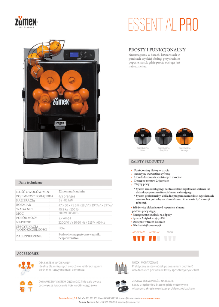 ESSENTIAL PRO PROSTY I FUNKCJONALNY Niezastąpiony w barach, kawiarniach w punktach szybkiej obsługi przy średnim popycie na sok gdzie prosta obsługa jest najważniejsza. Essential Pro Silver Essential Pro Graphite Essential Pro Orange ZALETY PRODUKTU Funkcjonalny i łatwy w użyciu Intuicyjny wyświetlacz cyfrowy Licznik dozowania wyciskanych owoców Dostępne menu w 23 językach 2 tryby pracy: Dane techniczne ILOŚĆ OWOCÓW/MIN POJEMNOŚĆ PODAJNIKA KALIBRACJA ROZMIAR WAGA NET MOC POBÓR MOCY NAPIĘCIE SPECYFIKACJA WODOSZCZELNOŚCI ZABEZPIECZENIE 22 pomarańcze/min 4/5 oranges 65 - 81 MM 47 x 50 x 75 cm ı 181/2” x 1911/16” x 2917/32” 45.5 kg ı 100 lb 380 W ı 0.50 HP 2.7 Amps 220-240 V ı 50-60 Hz / 115 V ı 60 Hz IPX4 Podwójne magnetyczne czujniki bezpieczeństwa System samoobsługowy: bardzo szybkie napełnienie szklanki lub dzbanka poprzez naciśnięcie kranu nalewającego System profesjonalny: dokładne programowanie ilości wyciskanych owoców bez potrzeby naciskania kranu. Kran może być w wersji roboczej. Self-Service blokada przed kapaniem z kranu podczas pracy ciągłej Zintegrowane szuflady na odpady System Antybakteryjny ASP Dostępny w trzech kolorach Dla średniej konsumpcji moderate medium high ACCESSORIES D65 SYSTEM WYCISKANIA Idealny dla mniejszych owoców o kalibracji 45 mm do 65 mm, łatwy montaż i demontaż NÓŻKI MONTAŻOWE Praktyczny zestaw nóżek pozwala nam podnieść urządzenie co pozwala w łatwy sposób wyczyścić blat DYNAMICZNY SYSTEM CIĘCIA DSC Tnie całe owoce co zwiększa i poprawia ilość wyciśniętego soku ZESTAW DO MONTAŻU NA BLACIE Łaczy urządzenie z blatem gdzie możemy we własnym zakresie rozwiązać problem z odpadkami Zumex Group, S.A. Tel: +34 961 301 251. Fax.+34 961 301 255. [email protected]. www.zumex.com Zumex Service. Tel: +34 960 800 999. [email protected]