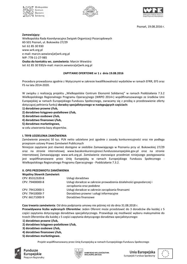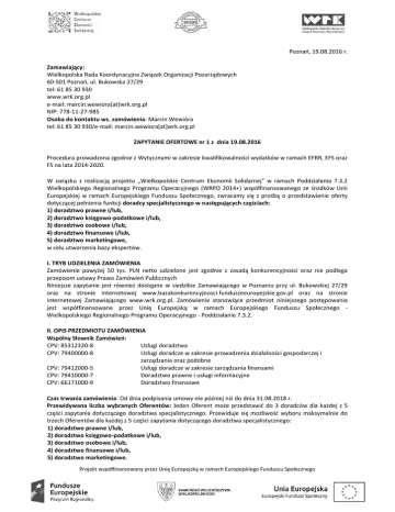 Poznań, 19.08.2016 r. Zamawiający: Wielkopolska Rada Koordynacyjna Związek Organizacji Pozarządowych 60-501 Poznań, ul. Bukowska 27/29 tel: 61 85 30 930 www.wrk.org.pl e-mail: marcin.wewiora[at]wrk.org.pl NIP: 778-11-27-985 Osoba do kontaktu ws. zamówienia: Marcin Wewióra tel: 61 85 30 930/e-mail: marcin.wewiora[at]wrk.org.pl ZAPYTANIE OFERTOWE nr 1 z dnia 19.08.2016 Procedura prowadzona zgodnie z Wytycznymi w zakresie kwalifikowalności wydatków w ramach EFRR, EFS oraz FS na lata 2014-2020. W związku z realizacją projektu „Wielkopolskie Centrum Ekonomii Solidarnej” w ramach Poddziałania 7.3.2 Wielkopolskiego Regionalnego Programu Operacyjnego (WRPO 2014+) współfinansowanego ze środków Unii Europejskiej w ramach Europejskiego Funduszu Społecznego, zwracamy się z prośbą o przedstawienie oferty dotyczącej pełnienia funkcji doradcy specjalistycznego w następujących częściach: 1) doradztwo prawne i/lub, 2) doradztwo księgowo-podatkowe i/lub, 3) doradztwo osobowe i/lub, 4) doradztwo finansowe i/lub, 5) doradztwo marketingowe, w celu utworzenia bazy ekspertów. I. TRYB UDZIELENIA ZAMÓWIENIA Zamówienie powyżej 50 tys. PLN netto udzielone jest zgodnie z zasadą konkurencyjności oraz nie podlega przepisom ustawy Prawo Zamówień Publicznych Niniejsze zapytanie jest również dostępne w siedzibie Zamawiającego w Poznaniu przy ul. Bukowskiej 27/29 oraz na stronie internetowej www.bazakonkurencyjnosci.funduszeeuropejskie.gov.pl oraz na stronie internetowej Zamawiającego www.wrk.org.pl. Zamówienie stanowiące przedmiot niniejszego postępowania jest współfinansowane przez Unię Europejską w ramach Europejskiego Funduszu Społecznego Wielkopolskiego Regionalnego Programu Operacyjnego - Poddziałanie 7.3.2. II. OPIS PRZEDMIOTU ZAMÓWIENIA Wspólny Słownik Zamówień: CPV: 85312320-8 Usługi doradztwa CPV: 79400000-8 Usługi doradcze w zakresie prowadzenia działalności gospodarczej i zarządzania oraz podobne CPV: 79412000-5 Usługi doradcze w zakresie zarządzania finansami CPV: 79410000-7 Doradztwo prawne i usługi informacyjne CPV: 66171000-9 Doradztwo finansowe Czas trwania zamówienia: Od dnia podpisania umowy nie później niż do dnia 31.08.2018 r. Przewidywana liczba wybranych Oferentów: Jeden Oferent może przedstawić do 3 doradców dla każdej z 5 części zapytania dotyczącego doradztwa specjalistycznego. Przewiduje się możliwość wyboru maksymalnie do trzech Oferentów dla każdej z 5 części zapytania dotyczącego doradztwa specjalistycznego: 1) doradztwo prawne i/lub, 2) doradztwo księgowo-podatkowe i/lub, 3) doradztwo osobowe i/lub, 4) doradztwo finansowe i/lub, 5) doradztwo marketingowe. Projekt współfinansowany przez Unię Europejską w ramach Europejskiego Funduszu Społecznego Zamawiający zastrzega, że pierwszeństwo w realizacji doradztwa specjalistycznego ma Oferent, który uzyskał najwyższą punktację, a w przypadku kiedy nie jest w stanie przystąpić do realizacji doradztwa specjalistycznego zgodnie ze zgłoszonym przez Zamawiającego zapotrzebowaniem, wówczas to prawo uzyskuje kolejny Oferent. Składanie ofert: Dopuszcza się możliwość składania ofert częściowych w poszczególnych częściach doradztwa specjalistycznego: 1) doradztwo prawne i/lub, 2) doradztwo księgowo-podatkowe i/lub, 3) doradztwo osobowe i/lub, 4) doradztwo finansowe i/lub, 5) doradztwo marketingowe. Zamawiający zastrzega sobie możliwość wyboru Wykonawcy do każdej z 5 części zamówienia odrębnie. W ramach każdej części zamówienia Oferent może wykazać do trzech 3 (trzech) doradców z potwierdzonym doświadczeniem w załączonym CV i doświadczeniem wykazanym w formularzu załączonym do zapytania. Wymiar czasowy: Liczba godzin świadczonego doradztwa specjalistycznego zostanie ustalona indywidualnie dla każdego doradcy (prawnego, księgowo-podatkowego, osobowego, finansowego i marketingowego) oraz określona zostanie przez Zamawiającego. Oferent zobowiązuje się, że wskazany doradca będzie świadczył doradztwo osobiście i pozostaje w gotowości w ciągu 48 godzin do pełnienia doradztwa od zgłoszenia zapotrzebowania. Miejsce realizacji zamówienia: Subregion poznański: Miasto Poznań, powiat poznański, powiat obornicki, powiat szamotulski, powiat śremski, powiat średzki, zgodnie z kryterium nr 3 pkt. 4.3.1 (Kryteria dostępu) Regulaminu konkursu zamkniętego w ramach Wielkopolskiego Regionalnego Programu Operacyjnego na lata 2014 – 2020, Poddziałanie 7.3.2: „Ekonomia społeczna”. Przedmiotem niniejszego zapytania ofertowego jest świadczenie doradztwa specjalistycznego w następujących częściach: 1) doradztwo prawne i/lub, 2) doradztwo księgowo-podatkowe i/lub, 3) doradztwo osobowe i/lub, 4) doradztwo finansowe i/lub, 5) doradztwo marketingowe w ramach projektu „Wielkopolskie Centrum Ekonomii Solidarnej” realizowanego w ramach Poddziałania 7.3.2 Wielkopolskiego Regionalnego Programu Operacyjnego współfinansowanego ze środków Unii Europejskiej w ramach Europejskiego Funduszu Społecznego. Osoba pełniąca obowiązki doradcy specjalistycznego będzie wchodziła w skład zespołu doradców Ośrodka Wspierania Ekonomii Społecznej (OWES) prowadzonego przez Zamawiającego. Zakres tematyczny zadań osoby zatrudnionej na stanowisku doradcy specjalistycznego będzie obejmował minimum następujące zagadnienia: 1) DORADZTWO PRAWNE: a) prowadzenie działalności gospodarczej w ramach podmiotów ekonomii społecznej/przedsiębiorstw społecznych (PES/PS), b) prawne aspekty działania w sferze ekonomii społecznej, w tym m.in. zakładanie, rejestrowanie, przekształcanie i likwidacja PES/PS, np. fundacji, stowarzyszeń, spółek non profit, warsztatów terapii zajęciowej, zakładów aktywności zawodowej, c) podatki bezpośrednie i pośrednie w działaniach PES/PS, d) obowiązki pracodawcy względem pracowników, w tym zatrudnianie osób z niepełnosprawnością, e) konsultacje w przygotowywaniu dokumentacji n