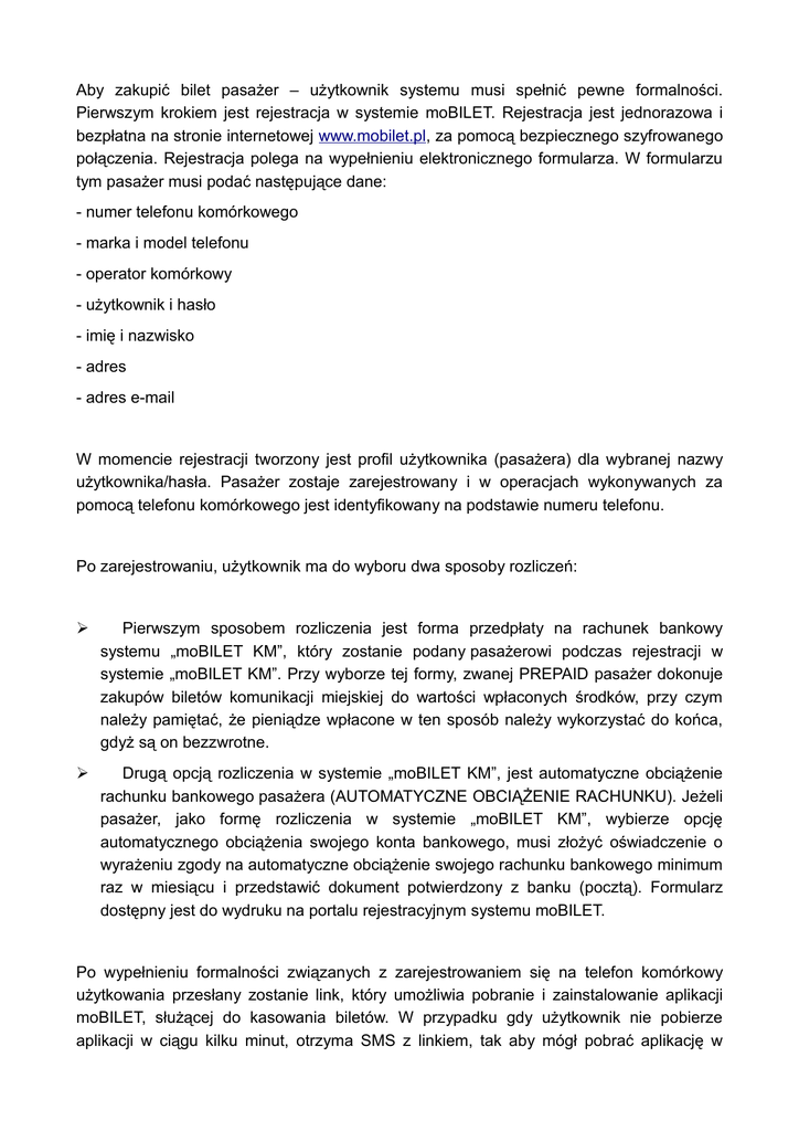 Aby zakupić bilet pasażer – użytkownik systemu musi spełnić pewne formalności. Pierwszym krokiem jest rejestracja w systemie moBILET. Rejestracja jest jednorazowa i bezpłatna na stronie internetowej www.mobilet.pl, za pomocą bezpiecznego szyfrowanego połączenia. Rejestracja polega na wypełnieniu elektronicznego formularza. W formularzu tym pasażer musi podać następujące dane: - numer telefonu komórkowego - marka i model telefonu - operator komórkowy - użytkownik i hasło - imię i nazwisko - adres - adres e-mail W momencie rejestracji tworzony jest profil użytkownika (pasażera) dla wybranej nazwy użytkownika/hasła. Pasażer zostaje zarejestrowany i w operacjach wykonywanych za pomocą telefonu komórkowego jest identyfikowany na podstawie numeru telefonu. Po zarejestrowaniu, użytkownik ma do wyboru dwa sposoby rozliczeń: Ø Pierwszym sposobem rozliczenia jest forma przedpłaty na rachunek bankowy systemu „moBILET KM”, który zostanie podany pasażerowi podczas rejestracji w systemie „moBILET KM”. Przy wyborze tej formy, zwanej PREPAID pasażer dokonuje zakupów biletów komunikacji miejskiej do wartości wpłaconych środków, przy czym należy pamiętać, że pieniądze wpłacone w ten sposób należy wykorzystać do końca, gdyż są on bezzwrotne. Ø Drugą opcją rozliczenia w systemie „moBILET KM”, jest automatyczne obciążenie rachunku bankowego pasażera (AUTOMATYCZNE OBCIĄŻENIE RACHUNKU). Jeżeli pasażer, jako formę rozliczenia w systemie „moBILET KM”, wybierze opcję automatycznego obciążenia swojego konta bankowego, musi złożyć oświadczenie o wyrażeniu zgody na automatyczne obciążenie swojego rachunku bankowego minimum raz w miesiącu i przedstawić dokument potwierdzony z banku (pocztą). Formularz dostępny jest do wydruku na portalu rejestracyjnym systemu moBILET. Po wypełnieniu formalności związanych z zarejestrowaniem się na telefon komórkowy użytkowania przesłany zostanie link, który umożliwia pobranie i zainstalowanie aplikacji moBILET, służącej do kasowania biletów. W przypadku gdy użytkownik nie pobierze aplikacji w ciągu kilku minut, otrzyma SMS z linkiem, tak aby mógł pobrać aplikację w każdym momencie później. Po wypełnieniu tych formalności pasażer będzie mógł kasować bilety za pomocą komórki. Procedurę kasowania biletu pasażer jest zobowiązany rozpocząć bezpośrednio po wejściu do pojazdu. Kasowanie biletów odbywa się w następujący sposób: - uruchomienie aplikacji moBILET i wybranie opcji „Skasuj bilet” - wybranie z listy kategorii linii – linie zwykłe bądź pospieszne i nocne - wybranie z listy rodzaju biletu – czasu ważności pożądanego przez pasażera - potwierdzenie zamiaru skasowania Po potwierdzeniu skasowania przez pasażera, pasażer otrzymuje potwierdzenie w postaci biletu elektronicznego zawartego na 3 ekranach, który zawierać będzie następujące elementy: rodzaj biletu, czas ważności biletu, kod zabezpieczający, cenę biletu, numer biletu, czas transakcji oraz elementy graficzne. Bilet zostaje zapisany w pamięci aplikacji, która pozwoli na wyświetlenie go w dowolnym momencie. Czas od rozpoczęcia kasowania biletu do otrzymania potwierdzenia o skasowaniu to maksymalnie 5 sekund, a z wyborem aplikacji ok. 15 sekund.
