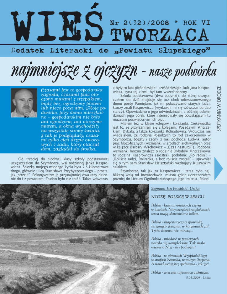 WIEŚ TWORZĄCA Nr 2(32)/2008 * ROK VI Dodatek Literacki do „Powiatu Słupskiego” Czasami jest to gospodarska zagroda, czasami plac otoczony murami z trzepakiem, bądź bez, ogrodzony płotem lub nieco poza nim. Moje podwórko, przy domu mieszkalno – gospodarskim nie było ani ogrodzone, ani otoczone murem, a okna wychodziły na wszystkie strony świata. I tak je podglądały; czasami tylko cień drzew owocowych z sadu, który otaczał dom, zaglądał do środka. Od trzeciej do siódmej klasy szkoły podstawowej uczęszczałem do Szymborza, wsi rodzinnej Janka Kasprowicza. Ścieżką mojego młodego życia była 2,5-kilometrowa droga, głównie ulicą Stanisława Przybyszewskiego – prosta, jak „strzelił”. Pokonywałem ją przynajmniej dwa razy dziennie do i z powrotem. Trudno było nie trafić. Także wówczas, a były to lata pięćdziesiąte i sześćdziesiąte, kult Jana Kasprowicza, syna tej ziemi, był tam wszechobecny. Szkoła podstawowa (dwa budynki), do której uczęszczałem do dziś znajduje się tuż obok odrestaurowanego domu poety. Pamiętam, jak mi pokazywano starych ludzi, którzy znali Kasprowicza (wydawali mi się wówczas bardzo starzy). Opowiadano o jego odwiedzinach, a później odwiedzinach jego córek, które interesowały się powstającym tu muzeum poświęconym ich ojcu. Miałem też w klasie kolegów i koleżanki. Ciekawostką jest to, że przyjaźniłem się z kolegami; Posadzym, Antczakiem, Dybałą, a także koleżanką Roliradówną. Wówczas nie wiedziałem, że rodzina Posadzych to ród zakorzeniony w Szymborzu, bogaty i zacny, z niej pochodzi Ludwik, autor prac filozoficznych (wzmianki w źródłach archiwalnych oraz w książce Barbary Wachowicz – „Czas nasturcji”). Podobne wzmianki można znaleźć o rodzinie Dybałów. Antczakowie to rodzina Kasprowicza (siostra), podobnie „Roliradka”: „Roliście radzi, Roliradka, a bez roliście zostali” – upewniał się o tym sam Stanisław Helsztyński wędrujący Kujawskim szlakiem. Szymborze, tak jak za Kasprowicza i teraz było najbliższą wsią od Inowrocławia, miasta gdzie uczęszczałem później do Liceum Ogólnokształcącego jego imienia. PoloniZygmunt Jan Prusiński, Ustka NOSZĘ POLSKĘ W SERCU Polska - kraina rosnących cierni w ludziach. Niby szczęśliwi na plakatach, serca mają skrwawione bólem. Polska - majestatyczna spowiedź, na gorąco zbieżna, w korzeniach żal. Tylko drzewa nie mówią... Polska - młodość w pacierzach nabyła się kompleksów. Tak mało wiemy o Niej - my podróżni! Polska - w obrazach Wyspiańskiego, w strofach Norwida, w muzyce Szopena. A naród wciąż bez spełnienia - jak żyć? Polska - wieczna tajemnica zaśnięcia. 5.05.2008 - Ustka SPOTKANIA W DRODZE najmniejsze z ojczyzn - nasze podwórka W SZKOLE TEJ SIEDZIAŁEM NAWET W ŁAWCE, W KTÓREJ SIEDZIAŁ WCZEŚNIEJ KASPROWICZ stą moim był tam mgr Zenon Kopeć. Jak wiemy, babcia Jana Kasprowicza była Kopciówną ze znanego rodu Kopciów. W szkole tej siedziałem nawet w ławce (piętrowa), w której siedział wcześniej Kasprowicz. Moją parafią był też kościół im. Św. Mikołaja, do którego uczęszczałem, chociaż w Szymborzu za moich czasów był już wybudowany mały kościółek, w którym pobierałem lekcje religii, znajdujący się tuż obok odrestaurowanego domu Kasprowicza. Szymborze, tak jak wcześniej wspomniałem to w zasadzie jedna długa ulica z rozwidleniami krótkich ulic i dróg na boki, rozciąga się kilku łańcuchami domów na znacznej przestrzeni. Ulice zbiegają się koło sadzawki, nad którą leży kościółek i szkoła podstawowa. Domy typowo gospodarskie murowane, częściowo drewniane, wokół sady z bielonymi drzewami. Okolica, jak to na Kujawach, gładka jak stół, pozbawiona lasów, horyzontem jednako odległym z nieskończonością pól znikających za nim. Dookoła polne drogi z drzewami i bez. „Ani gajów, ani łąk, ani ruczajów” – jak mawiał poeta. Uprawne, żyzne pola o bardzo wysokiej kulturze. Latem miedze z wysuszonymi ziołami, trawami, rżyska jak szczotka, dorodne zagony buraków. Tak, jak za czasów Kasprowicza, zapamiętałem ciągnące rzesze ludzi na piechotę i na rowerach (później autobusami) od strony Mątew, gdzie były fabryki cukru i sody, w kierunku Inowrocławia. Ziemia przeludniona i wiele osób pracowało w tychże fabrykach. Główna ulica St. Przybyszewskiego była już utwardzona natomiast pobocze nie, częściowo i te musiałem pokonywać piechotą wczesną wiosną i jesienią w błotnej mazi, latem w pyle, jak popiół popielatym z wysokimi łopianami na poboczach. Za czasów Kasprowicza Szymborze było najludniejszą wsią w powiecie. Nigdzie nie uczyło się tyle dzieci w miejscowej szkole jak w Szymborzu, które nazwę swą zawdzięcza według ks. St. Kozierowskiego od imienia Sambor (Senbor). W aktach z XVI w. spotyka się nazwę w brzemieniu Samborze lub Szymborzy - bramy drewnianej z blankami. Była to wieś królewska na prawie czynszowym z bogatą historią późniejszą. Jak mówią kronikarze - warunki istnienia były dobre bez piętna niewolnictwa. Akcenty powyższego opisu znajdujemy w wierszu Sjerp - Polaczka pt. „Pożar w Szymborzu” (wydany na dochód pogorzelców): Snopy ziarniste, warstwy runiste – W gumnach i brogach i stogach W Piastów Ziemicy, wokrąż Krużświcy Na złotoplennych rozłogach. A te jałówki, te jak łanie krówki, Dziarskie gniadosze – bachmaty, Bure te trzódki, sady ogródki – W nich ruta, rozmaryn ba – kwiaty: Domy jak dwory, stajnie – obory, Jak u rządnego szlachcica. Piętra pościeli. Z cian wzrok weseli Ze sto świętych, a wśród nich zachwyca Polski Królowa, Zbawcy rodzica – Dziewica. Ową drogę ze i do szkoły pokonywałem w towarzystwie, jak wspominałem, kolegów i koleżanek, zaczynałem i kończyłem sam, gdyż dalej ode mnie już nikt nie mieszkał. Miejscowość ta zachowała do dzisiaj wiekowe tradycje obyczajów i jako najstarsza wi