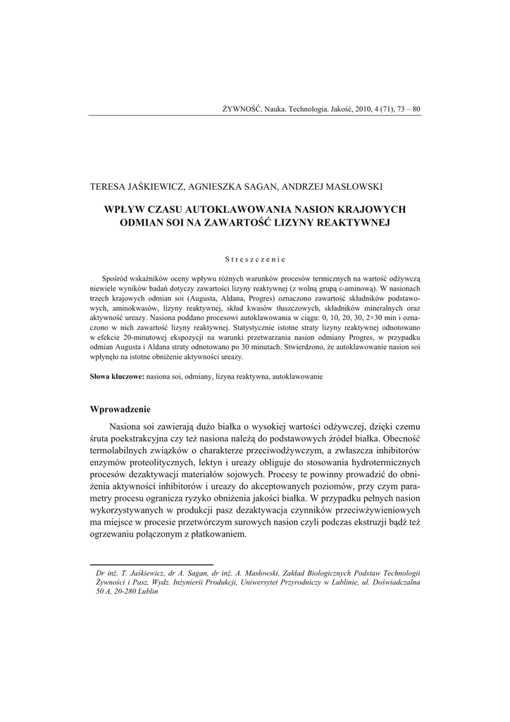 ŻYWNOŚĆ. Nauka. Technologia. Jakość, 2010, 4 (71), 73 – 80 TERESA JAŚKIEWICZ, AGNIESZKA SAGAN, ANDRZEJ MASŁOWSKI WPŁYW CZASU AUTOKLAWOWANIA NASION KRAJOWYCH ODMIAN SOI NA ZAWARTOŚĆ LIZYNY REAKTYWNEJ Streszczenie Spośród wskaźników oceny wpływu różnych warunków procesów termicznych na wartość odżywczą niewiele wyników badań dotyczy zawartości lizyny reaktywnej (z wolną grupą ε-aminową). W nasionach trzech krajowych odmian soi (Augusta, Aldana, Progres) oznaczono zawartość składników podstawowych, aminokwasów, lizyny reaktywnej, skład kwasów tłuszczowych, składników mineralnych oraz aktywność ureazy. Nasiona poddano procesowi autoklawowania w ciągu: 0, 10, 20, 30, 2×30 min i oznaczono w nich zawartość lizyny reaktywnej. Statystycznie istotne straty lizyny reaktywnej odnotowano w efekcie 20-minutowej ekspozycji na warunki przetwarzania nasion odmiany Progres, w przypadku odmian Augusta i Aldana straty odnotowano po 30 minutach. Stwierdzono, że autoklawowanie nasion soi wpłynęło na istotne obniżenie aktywności ureazy. Słowa kluczowe: nasiona soi, odmiany, lizyna reaktywna, autoklawowanie Wprowadzenie Nasiona soi zawierają dużo białka o wysokiej wartości odżywczej, dzięki czemu śruta poekstrakcyjna czy też nasiona należą do podstawowych źródeł białka. Obecność termolabilnych związków o charakterze przeciwodżywczym, a zwłaszcza inhibitorów enzymów proteolitycznych, lektyn i ureazy obliguje do stosowania hydrotermicznych procesów dezaktywacji materiałów sojowych. Procesy te powinny prowadzić do obniżenia aktywności inhibitorów i ureazy do akceptowanych poziomów, przy czym parametry procesu ogranicza ryzyko obniżenia jakości białka. W przypadku pełnych nasion wykorzystywanych w produkcji pasz dezaktywacja czynników przeciwżywieniowych ma miejsce w procesie przetwórczym surowych nasion czyli podczas ekstruzji bądź też ogrzewaniu połączonym z płatkowaniem. Dr inż. T. Jaśkiewicz, dr A. Sagan, dr inż. A. Masłowski, Zakład Biologicznych Podstaw Technologii Żywności i Pasz, Wydz. Inżynierii Produkcji, Uniwersytet Przyrodniczy w Lublinie, ul. Doświadczalna 50 A, 20-280 Lublin 74 Teresa Jaśkiewicz, Agnieszka Sagan, Andrzej Masłowski W wytwarzaniu żywności i mieszanek paszowych proces technologiczny może obejmować kondycjonowanie, ekspandowanie, ekstruzję czy granulowanie. Tak więc materiał sojowy poddany wcześniej np. toastowaniu bywa ponownie ogrzewany przy podwyższonej wilgotności. Stwarza to ryzyko zmniejszenia dostępności i strawności aminokwasów, głównie lizyny [4]. Lizyna, szczególnie w wyższej temperaturze, może wchodzić w reakcje z innymi natywnymi związkami np. redukującymi [1, 10]. W efekcie po zablokowaniu wolnej grupy ε-aminowej staje się niedostępna dla procesów trawiennych. Spośród wskaźników oceny wpływu różnych warunków obróbki technologicznej na wartość pokarmową niewiele wyników badań dotyczy zawartości lizyny reaktywnej (z wolną grupą ε-aminową). Podatność nasion różnych odmian soi na procesy termicznego przetwarzania stwierdzili Qin i wsp. [19] oraz Žilić i wsp. [26]. Celem badań było określenie wpływu czasu autoklawowania oraz autoklawowania dwukrotnego krajowych odmian nasion soi na zawartość lizyny reaktywnej. Materiał i metody badań Do badań użyto prób 3 krajowych odmian soi: Progres (1981), Aldana (1992) i Augusta (2002) pochodzących z upraw IHAR w Radzikowie k. Warszawy. W nawiasach podano rok wpisania odmian do Krajowego Rejestru. Próby pochodziły ze zbiorów 2007 r. Po usunięciu zanieczyszczeń przechowywano je w zamkniętych szklanych pojemnikach w temp. 18 - 23 ºC. Z każdej odmiany przygotowano po 5 prób nasion, które autoklawowano w ciągu: 0, 10, 20, 30, 2×30 min. Autoklawowanie prowadzono w pionowym sterylizatorze parowym, typ ASVE produkcji SPM w Warszawie. Temperatura procesu wynosiła 121 ºC, a ciśnienie 0,25 MPa. W próbkach nasion oznaczano białko ogólne metodą Kjeldahla zgodnie z PN-ISO 5983 [14], tłuszcz surowy metodą Soxleta zgodnie z PN-EN ISO 659 [13], popiół całkowity wg PN-ISO 749 [16]. Aminokwasy oznaczano metodą chromatografii jonowymiennej w automatycznym analizatorze aminokwasów Beckman model 119Cl; przed analizą próby poddano kwaśnej hydrolizie w obecności 6 M HCl, w temp. 105 ºC w ciągu 24 h. Aminokwasy siarkowe oznaczano oddzielnie po utlenieniu [2, 23]. Tryptofan oznaczano zgodnie z metodą AOAC [11]. Skład kwasów tłuszczowych oznaczano zgodnie z metodą opisaną przez Matykę [7], jako estry metylowe w chromatografie gazowym UNICAM 610 Series. Zawartość składników mineralnych, za wyjątkiem fosforu, oznaczano w spektrofotometrze płomieniowym ASA SOLAR 939 UNICAM wg PN–EN ISO 6869 [17], zawartość fosforu metodą spektrometryczną wg PN–ISO 6491 [15]. Lizynę reaktywną oznaczano techniką HPLC według RamírezaJiméneza i wsp. [20]. Zasada metody polegała na utworzeniu barwnego kompleksu εDNP-lizyny w reakcji z dinitrofluorobenzenem (DNFB), a następnie zhydrolizowaniu próby i oznaczeniu zawartości ε-DNP-lizyny w chromatografie cieczowym z detekto- WPŁYW CZASU AUTOKLAWOWANIA NASION KRAJOWYCH ODMIAN SOI NA ZAWARTOŚĆ… 75 rem UV VIS – Spectroflow 773. Aktywność ureazy oznaczano metodą PN ISO 5506 [18]. Istotność różnic pomiędzy średnimi wartościami zawartości lizyny reaktywnej zweryfikowano używając analizy wariancji i testu Tukey’a przy p ≤ 0,05. Obliczano współczynniki korelacji liniowej i równania regresji liniowej określające zmiany zawartości lizyny reaktywnej w nasionach soi w zależności od czasu autoklawowania. Obliczenia wykonano korzystając z programu Statistica 8.0. Wyniki i dyskusja Nasiona soi odmiany Augusta zawierały najwięcej białka ogólnego (34,25 %) oraz najmniej tłuszczu surowego (17,20 %), zaś w nasionach odmiany Progres było najmniej białka ogólnego (31,14 %) oraz najwięcej tłus