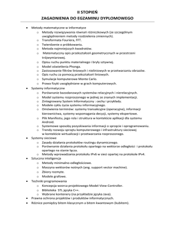 II STOPIEŃ ZAGADNIENIA DO EGZAMINU DYPLOMOWEGO • • • • • • • Metody matematyczne w informatyce o Metody rozwiązywania równań różniczkowych (ze szczególnym uwzględnieniem metody rozdzielenia zmiennych). o Transformata Fouriera, FFT. o Twierdzenie o próbkowaniu. o Metoda najmniejszych kwadratów. o Matematyczny opis przekształceń geometrycznych w przestrzeni trójwymiarowej. o Opisu ruchu punktu materialnego i bryły sztywnej. o Model oświetlenia Phonga. o Zastosowanie filtrów liniowych i nieliniowych w przetwarzaniu obrazów. o Opis ruchu za pomocą przekształceń liniowych. o Symulacje komputerowe Monte Carlo. o Prawa fizyki uwzględniane w grach komputerowych. Systemy informatyczne o Porównanie bazodanowych systemów relacyjnych i nierelacyjnych. o Model systemu rozproszonego w jednej ze znanych implementacji. o Zintegrowany System Informatyczny : cechy i przykłady. o Modele cyklu życia systemu informacyjnego. o Omówienia terminów: systemy transakcyjne (operacyjne), informacji kierownictwa, systemy wspomagania decyzji, systemy ekspertowe. o Plik Manifestu, jego rola i struktura w kontekście aplikacji dla systemu Android. o Systemowe sposoby pozyskiwania informacji o sprzęcie i oprogramowaniu. o Trendy rozwoju sprzętu komputerowego i infrastruktury sieciowej w kontekście wirtualizacji i przetwarzania rozproszonego. Systemy sieciowe o Zasady działania protokołów routingu dynamicznego. o Porównanie działania protokołu opartego na wektorze odległości i protokołu opartego na stanie łącza. o Metody wprowadzania protokołu IPv6 w sieci opartej na protokole IPv4. Sztuczna inteligencja o Metody minimalno-odległościowe. o Maszyna wektorów nośnych (ang. support vector machine). o Zbiory rozmyte. o Modele grafowe. Techniki programowania o Koncepcja wzorca projektowego Model-View-Controller. o Biblioteka STL języka C++. o Wybrane kontenery (na przykładzie języka Java). Prawna ochrona projektów i produktów informatycznych. Różnice pomiędzy bitem klasycznym a bitem kwantowym (kubitem).