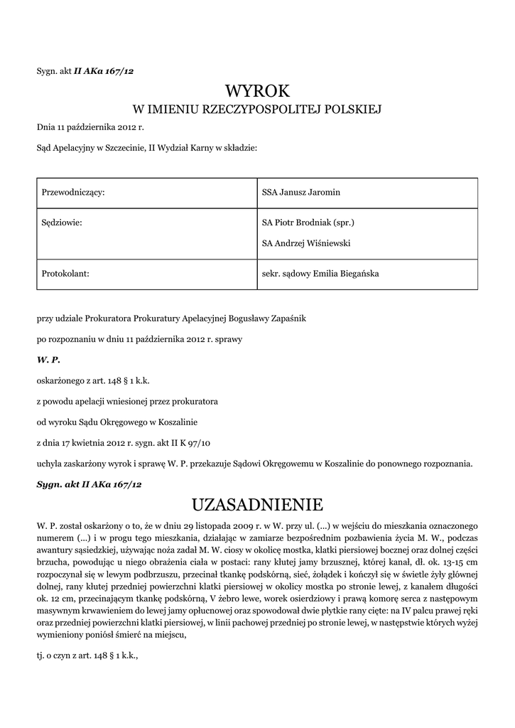 Sygn. akt II AKa 167/12 WYROK W IMIENIU RZECZYPOSPOLITEJ POLSKIEJ Dnia 11 października 2012 r. Sąd Apelacyjny w Szczecinie, II Wydział Karny w składzie: Przewodniczący: SSA Janusz Jaromin Sędziowie: SA Piotr Brodniak (spr.) SA Andrzej Wiśniewski Protokolant: sekr. sądowy Emilia Biegańska przy udziale Prokuratora Prokuratury Apelacyjnej Bogusławy Zapaśnik po rozpoznaniu w dniu 11 października 2012 r. sprawy W. P. oskarżonego z art. 148 § 1 k.k. z powodu apelacji wniesionej przez prokuratora od wyroku Sądu Okręgowego w Koszalinie z dnia 17 kwietnia 2012 r. sygn. akt II K 97/10 uchyla zaskarżony wyrok i sprawę W. P. przekazuje Sądowi Okręgowemu w Koszalinie do ponownego rozpoznania. Sygn. akt II AKa 167/12 UZASADNIENIE W. P. został oskarżony o to, że w dniu 29 listopada 2009 r. w W. przy ul. (...) w wejściu do mieszkania oznaczonego numerem (...) i w progu tego mieszkania, działając w zamiarze bezpośrednim pozbawienia życia M. W., podczas awantury sąsiedzkiej, używając noża zadał M. W. ciosy w okolicę mostka, klatki piersiowej bocznej oraz dolnej części brzucha, powodując u niego obrażenia ciała w postaci: rany kłutej jamy brzusznej, której kanał, dł. ok. 13-15 cm rozpoczynał się w lewym podbrzuszu, przecinał tkankę podskórną, sieć, żołądek i kończył się w świetle żyły głównej dolnej, rany kłutej przedniej powierzchni klatki piersiowej w okolicy mostka po stronie lewej, z kanałem długości ok. 12 cm, przecinającym tkankę podskórną, V żebro lewe, worek osierdziowy i prawą komorę serca z następowym masywnym krwawieniem do lewej jamy opłucnowej oraz spowodował dwie płytkie rany cięte: na IV palcu prawej ręki oraz przedniej powierzchni klatki piersiowej, w linii pachowej przedniej po stronie lewej, w następstwie których wyżej wymieniony poniósł śmierć na miejscu, tj. o czyn z art. 148 § 1 k.k., Sąd Okręgowy w Koszalinie wyrokiem z dnia 17 kwietnia 2012 r. wydanym w sprawie II K 97/10 W. P. uniewinnił od popełnienia zarzuconego mu czynu, przyjmując że oskarżony działał w ramach obrony koniecznej. Na podstawie art. 415 § 2 kpk, Sąd Okręgowy pozostawił bez rozpoznania powództwo cywilne, a ponadto rozstrzygnął o kosztach postępowania. Apelację od wyroku wywiódł prokurator i zarzucił mu: - błąd w ustaleniach faktycznych przyjętych za podstawę orzeczenia mającą wpływ na jego treść, a polegający na uznaniu, że oskarżony W. P. swoim zachowaniem nie wypełnił znamion przestępstwa z art. 148 § 1 kk podczas, gdy całokształt zgromadzonego materiału dowodowego do takiego wniosku nie prowadzi, - obrazę przepisu postępowania tj. art. 413 § 2 punkt 1 kpk, która miała wpływ na treść orzeczenia poprzez nie wskazanie w opisie przypisanego oskarżonemu czynu cech niezbędnych, znamionujących działanie w warunkach obrony koniecznej zaś w kwalifikacji prawnej tego czynu art. 25 § 1 kk, - obrazę przepisu postępowania tj. art. 7 kpk , która miała wpływ na treść orzeczenia przez odstąpienie od zasady swobodnej oceny dowodów, która jednoznacznie wyklucza arbitralność Sądu w zakresie oceny materiału dowodowego i orzekania przez Sąd I instancji na zasadzie dowolności, w szczególności w zakresie oceny wiarygodności wyjaśnień W. P. w świetle zeznań świadków A. M. i M. M. oraz wniosków opinii biegłych lekarzy U. D. i S. S.. Podnosząc te zarzuty prokurator wniósł o uchylenie zaskarżonego wyroku i przekazanie sprawy do ponownego rozpoznania przez Sąd Okręgowy w Koszalinie, a w przypadku nie uwzględnienia tego zarzutu, wniósł o zmianę opisu i kwalifikacji prawnej przypisanego oskarżonemu czynu i przyjęcie w opisie czynu, że oskarżony działał w warunkach obrony koniecznej tj. odpierał bezpośredni, bezprawny zamach na swoje życie lub zdrowie i zakwalifikowanie czynu przypisanego oskarżonemu z art. 148 § 1 kk w zw. z art. 25 § 1 kk . Sąd Apelacyjny zważył, co następuje. Apelacja jest częściowo zasadna, aczkolwiek sformułowane w niej wnioski, w aktualnym stanie rozpoznawanej sprawy, jawią się jako zdecydowanie przedwczesne. Dokonując takiej oceny skargi, na wstępie wypada przypomnieć, że prawidłowość nie tylko zaskarżonego, ale jakiegokolwiek orzeczenia uzależniona jest od zrealizowania przez sąd dwóch podstawowych obowiązków. Pierwszego, polegającego na przeprowadzeniu postępowania dowodowego w sposób wyczerpujący a do tego przewidziany przepisami kodeksu postępowania karnego oraz drugiego sprowadzającego się do oceny wszystkich okoliczności ujawnionych w toku rozprawy głównej. Instancyjna kontrola zaskarżonego wyroku prowadzi do wniosku, że Sąd Okręgowy rozpoznający przedmiotową sprawę, jakkolwiek uczynił zadość pierwszemu wymaganiu, to jednak nie zrealizował drugiego z wyżej wymienionych obowiązków. Zmaterializowanie się takiego stanu rzeczy wynika zaś ze zbyt pobieżnej analizy zeznań M. M. (k.71-73, k.123-126, k.142-143, k.682-685, k.1092-1095) i A. M. (k.49-52, k.1016-1019), a także jest konsekwencją pominięcia przez Sąd meriti wniosków płynących z ustnej uzupełniającej opinii biegłego lekarza medycyny sądowej U. D. (k.1127-1130). Nawiązując do pierwszego z wymienionych dowodów należy zauważyć, że Sąd Okręgowy, notabene trafnie, uwypuklił wiele uwarunkowań, które wpłynęły na treść owego dowodu (np. stan nietrzeźwości świadka, czy też duża dynamika zajścia), aczkolwiek trzeba też podkreślić, że ocenę zeznań M. M. Sąd orzekający spuentował stwierdzeniem, iż „(…) napaść tę (tj. pierwszą część ataku M. W. na W. P. - uwaga Sądu Apelacyjnego) M. M. zrelacjonowała w istocie w taki sam sposób, jak uczynił to oskarżony (…)” (str. 17 uzasadnienia zaskarżonego wyroku). Rzecz jednak w tym, że lektura zeznań M. M. nie prowadzi do tak jednoznacznej tezy jaką sformułował Sąd pierwszej instancji. Aby nie być gołosłownym należy zaś przypo