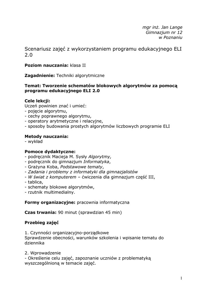 mgr inż. Jan Lange Gimnazjum nr 12 w Poznaniu Scenariusz zajęć z wykorzystaniem programu edukacyjnego ELI 2.0 Poziom nauczania: klasa II Zagadnienie: Techniki algorytmiczne Temat: Tworzenie schematów blokowych algorytmów za pomocą programu edukacyjnego ELI 2.0 Cele lekcji: Uczeń powinien znać i umieć: - pojęcie algorytmu, - cechy poprawnego algorytmu, - operatory arytmetyczne i relacyjne, - sposoby budowania prostych algorytmów liczbowych programie ELI Metody nauczania: - wykład Pomoce dydaktyczne: - podręcznik Macieja M. Sysły Algorytmy, - podręcznik do gimnazjum Informatyka, - Grażyna Koba, Podstawowe tematy, - Zadania i problemy z informatyki dla gimnazjalistów - W świat z komputerem – ćwiczenia dla gimnazjum część III, - tablica, - schematy blokowe algorytmów, - rzutnik multimedialny. Formy organizacyjne: pracownia informatyczna Czas trwania: 90 minut (sprawdzian 45 min) Przebieg zajęć 1. Czynności organizacyjno-porządkowe Sprawdzenie obecności, warunków szkolenia i wpisanie tematu do dziennika 2. Wprowadzenie - Określenie celu zajęć, zapoznanie uczniów z problematyką wyszczególnioną w temacie zajęć. 1 - Określenie metod pracy na lekcji. - Kierowanie procesem przyswajania nowych wiadomości i kształtowania umiejętności. TECHNIKI ALGORYTMICZNE 1. Wprowadzenie Sposoby rozwiązywania zadań, czyli algorytmy, można przedstawiać w postaci graficznej jako schematy blokowe. Na początku przypomnimy pojęcie algorytmu, które zostało przedstawione na poprzednich lekcjach informatyki: Algorytm to jednoznaczny przepis, dyktujący krok po kroku postępowanie w celu rozwiązania pewnego problemu lub sposobu osiągnięcia jakiegoś celu. Ponadto, jeszcze raz przypomnimy sobie, jakie cechy musi mieć poprawny algorytm. A są to: • • • • poprawność - dla każdego przypisanego zestawu danych, po wykonaniu skończonej liczby czynności, algorytm prowadzi do poprawnych wyników, jednoznaczność - w każdym przypadku zastosowania algorytmu dla tych samych danych otrzymamy ten sam wynik, szczegółowość - wykonawca algorytmu musi rozumieć opisane czynności i potrafić je wykonywać, uniwersalność - algorytm ma służyć rozwiązywaniu pewnej grupy zadań, a nie tylko jednego zadania. Przykładowo algorytm na rozwiązywanie równań w postaci ax + b=0 ma je rozwiązać dla dowolnych współczynników a i b, a nie tylko dla jednego konkretnego zadania, np. 2x+6=0. W schemacie blokowym poszczególne operacje przedstawione są za pomocą odpowiednio bloków. Połączenia określają kolejność sposób wykonywani operacji realizujących dany algorytm. Do tworzenia schematów blokowych algorytmu wykorzystamy program edukacyjny ELI. Niżej przedstawiono operatory arytmetyczne i relacyjne używane przy tworzeniu algorytmów. Operatory arytmetyczne Operatory arytmetyczne służą do wykonywania zwyczajnych operacji dodawania, odejmowania, mnożenia i dzielenia. Do tej grupy należą również operatory przeznaczone do takich specjalnych celów, jak na przykład obliczenie części całkowitej wyniku dzielenia liczb całkowitych lub obliczanie reszty z takiego dzielenia (modulo). Wszystkie operatory arytmetyczne TP są zestawione w poniższej tabeli. 2 Operatory arytmetyczne Operator + + * / DIV MOD Opis Znak dodatni Znak ujemny Dodawanie Odejmowanie Mnożenie Dzielenie zmiennopozycyjne Dzielenie całkowite; 365 DIV 7 = 52 Reszta z dzielenia całkowitego; 365 MOD 7 = 1 Operatory relacyjne Oprócz operatorów do budowania wyrażeń arytmetycznych niezbędne są też operatory do porównywania argumentów. Operatory takie, zwane relacyjnymi, są bardzo przydatne; umożliwiają bowiem budowanie instrukcji decyzyjnych. Operatory relacyjne, dostępne w TP, są przedstawione w poniższej tabeli. Każdy z nich wymaga dwóch argumentów, a wynikiem operacji jest wartość typu Boolean (True, False). Podstawowe operatory relacyjne Operator = <> > < >= <= Znaczenie Oba argumenty są równe Argumenty są różne Lewy argument jest większy od prawego Lewy argument jest mniejszy od prawego Lewy argument jest większy lub równy prawemu Lewy argument jest mniejszy lub równy prawemu Uwagi 4 = 4 ; ‘a’ = ‘a’ 4 <> 6 ; ‘jeden’ <> ‘dwa’ 40 > 30 60 < 100 34.45 >= 16.67 45.68 <= 103.45 3 2. Tworzenie schematu blokowego algorytmu za pomocą programu edukacyjnego ELI 2.0 Ogólne zasady budowania prostego algorytmu 1. Każda operacja jest umieszczona w bloku (klocku). 2. Schemat rozpoczyna się zawsze blok (klocek). Początek algorytmu 3. Na końcu schematu jest blok (klocek). Koniec algorytmu (musi być przynajmniej jeden taki blok /klocek/ w danym schemacie) 4. Dane wprowadzamy za pomocą bloku (klocka). Wprowadzenie danej 5. Obliczenia wpisujemy do bloku (klocka). Wykonanie obliczeń 6. Wyniki obliczeń wyświetla się za pomocą bloku (klocka). Wyprowadzenie wyniku 7. Bloki (klocki) są ze sobą połączone. 8. Z bloku wychodzi jedno połączenie; wyjątek stanowi blok (klocek) Koniec algorytmu, z którego nie wychodzi żadne połączenie i blok (klocek). Sprawdzenie warunku, z którego wychodzą dwa połączenia. Aby zbudować schemat blokowy w programie ELI, należy: 1. Otworzyć nowy projekt Plik/Nowy projekt i zaznaczyć w oknie Nowy projekt przycisk Plansza. 2. Bloki przenosimy z palety umieszczonej obok planszy metodą uchwyć i upuść. 3. Bloki umieszczone omyłkowo na planszy usuwamy, przenosząc je poza plansze metodą uchwyć i upuść. 4. Aby wpisać operację (komunikaty, nazwy zmiennych, działania) do bloku (klocka), otwieramy okno dialogowe, naciskając prawy klawisz myszy w obszarze danego bloku (klocka). 5. W prostym schemacie połączenie bloków (klocków) realizuje się przez „doklejanie” bloku do bloku. 6. W rozbudowanym schemacie używa się bloków (klocków) połączeń Linie Ćwiczenie 1 Zbudować schemat blokowy algorytmu w programie ELI obliczający wartość niżej podanego wyrażenia: W = x 2 + 3xy + 5y 2 gdzie: x, y 