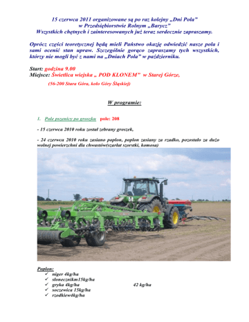 15 czerwca 2011 organizowane są po raz kolejny „Dni Pola” w Przedsiębiorstwie Rolnym „Barycz” Wszystkich chętnych i zainteresowanych już teraz serdecznie zapraszamy. Oprócz części teoretycznej będą mieli Państwo okazję odwiedzić nasze pola i sami ocenić stan upraw. Szczególnie gorąco zapraszamy tych wszystkich, którzy nie mogli być z nami na „Dniach Pola” w październiku. Start: godzina 9.00 Miejsce: Świetlica wiejska „ POD KLONEM” w Starej Górze, (56-200 Stara Góra, koło Góry Śląskiej) W programie: 1. Pole pszenicy po groszku pole: 208 - 15 czerwca 2010 roku został zebrany groszek, - 24 czerwca 2010 roku zasiano poplon, poplon zasiany za rzadko, pozostało za dużo wolnej powierzchni dla chwastów(szarłat szorstki, komosa) Poplon: niger 4kg/ha słonecznikm15kg/ha gryka 4kg/ha soczewica 15kg/ha rzodkiew4kg/ha 42 kg/ha - 21 września bezpośredni siew pszenicy, bez talerzy, by nie mieszać resztek w ziemi. - Odmiana: Jenga 90kg/ha, MTZ 40.9g - gęstość: 222 ziaren/m2, siła kiełkowania 94% Siew bezpośredni przy pomocy siewnika talerzowego, bez systemu uprawiającego przedniego. Widoczny poplon i chwasty na powierzchni. 31 maja 2011 Czy można uwierzyć, że to te same pola? Tak, to są te same pola! 31 maja 2011 Widoczna porowatość gleby oraz resztki na powierzchni kłos pszenicy 2. Pole rzepaku po koniczynie pole: 203 - zbiór koniczyny, - po zbiorze brak jakiejkolwiek uprawy, - 19-20 sierpnia 2010 bezpośredni siew rzepaku z strip-till z nawozem: SuproFoska 20, 370kg, (PK - 10:20), - 20 roślin/m², - 3 odmiany z firmy Euralis: Danube, Domino, Astrid Wykonano doświadczenie w 12 rzędach: 18cm 9cm 18cm 11cm 9cm 9cm,11cm, 18cm – odległość nasion w rzędach Nie odnotowano strat w plonach. Przy rozstawie: 9cm - 25 roślin/m2 11cm - 20 roślin/m2 18cm - 12 roślin/m2 27 października 2010 Luty 2011 Marzec 2011 Rzadki siew powoduje marny rozwój korzeni rzepaku przed zimą, a co za tym idzie lepsze zimowanie, mocniejszy rozwój oraz lepsze rozgałęzienie na wiosnę. Kwiecień 2011 Kwiecień 2011 Maj 2011 3. Pole rzepaku po groszku pole: 202 W związku z tym, ze pomiędzy zbiorem groszku i rzepaku były dwa miesiące przerwy (20 czerwca - 20 sierpnia) szkoda byłoby nie wykorzystać tego i nie zasiać poplonu. Na takim pustym polu prędzej czy później zaczęłyby rosnąć chwasty i konieczny byłby oprysk glifosatem. Postanowiliśmy zasiać poplon. Jeśli tak, to jaki miał być jego cel tego poplonu? - przykryć całą powierzchnie pola przez resztki pożniwne (odchwaszczenie), - dostarczyć azot w rzędach dla rzepaku. - zbiór groszku, Agregat Compil (głębokość do 5 cm) po kombajnie + siew rzutowy poplonu Siew bobiku (siew punktowy) wraz z nawożeniem PK Siew bezpośredni w rzędy bobiku Plusy : dostarczenie azotu, zmniejszenie problemu z chwastami Minusy: trudności z trafieniem w rzędy, jakość wschodów była niestety gorsza niż z strip-till Luty 2011 Marzec 2011 Strip-till sieje zawsze z małym dołkiem. Podczas siewu słupice odgarniają słomę oraz resztki. W powstały dołek, gdzie zasiana zostaje roślina, wpada zawsze więcej wody. Kiedy wieje silny wiatr, roślina pozostająca w dołku jest mniej narażona na wywianie. Kiedy natomiast spadnie śnieg, utrzymuje się on dłużej w dołku, niżeli na górce. Tym samym roślina pozostaje dłużej przykryta przez pokrywę śnieżną i ma lepsze warunki na rozwój. Marzec 2011 Kwiecień 2011 Taki sposób uprawy nie dał optymalnych wschodów. Ludzie, którzy byli na „Dniach Pola” w październiku pamiętają pewnie, że obsada rzepaku była kiepska, wręcz szokująca. Kwiecień 2011 12 maja 2011 31 maja 2011 wykształcony system korzeniowy łuszczyny rzepaku Mimo tego, że był rzadki, zrekompensował nam obsadę dzięki rozgałęzieniu. 4. Pole buraków po pszenicy pole: 101 45ha - zbiór zbóż (/ha)7,4t - po kombajnie agregat Compil (głębokość do 5cm), aby chwasty i samosiewy kiełkowały - siewnik rzutowy(do poplonu) + compil WZÓR POLA I II - po kombajnie compil (głębokość 5cm) - poplon + siew bobiku doświadczenie - siew rzutowy(do poplonu) + compil sierpień - siew bezpośredni (sam - siew buraków z strip-till + siewnik marzec siewnik) marzec Na ¾ części pola zasiany poplon: Siew poplonu 18.08.2010: rzodkiew 5kg/ha koniczyna Aleksandria 5kg/ha facelia 10kg/ha groszek 50kg/ha gryka 10kg/ha I sposób uprawy Na pozostałej części pola doświadczenie krzyżowe z poplonami: Siew 07.09.2010 – Vaderstad doświadczenie gdzie: 8 1 - facelia 10kg/ha 2 - gorczyca 10kg/ha 3 - niger 10kg/ha 4 - rzodkiew biały 10kg/ha 5 - koniczyna Inkarnat 10kg/ha 6 - groch 60kg/ha 7 - słonecznik 60kg/ha 8 - owies 60kg/ha 7 6 5 4 3 2 1 1 2 3 4 5 6 7 8 Celem doświadczenia była ocena jakości siewu i wschodów buraków po siewie tych poplonów. Próby siane za późno, w połowie października przyszedł mróz, który całkowicie zlikwidował rośliny wrażliwe na niską temperaturę, min.: niger i słonecznik. Doświadczenie powtarzane będzie za rok. II sposób uprawy Niestety nie posiadamy zdjęcia w trakcie siewu. Siew bezpośredni, koniec marca, nad rzędami bobiku, który był całkowicie zniszczony przez mróz. Siew buraków: 25 marca 2011, Strip - till (12 rzędowy) 25 marca 2011 Maj 2011 31 maja 2011 wykształcony system korzeniowy buraka I sposób uprawy Część pola uprawiana ze strip-till. Dla jakości pracy należało poczekać, aż pole całkowicie się wysuszy. Zruszenie gleby przez strip-till powoduje szybsze ogrzanie się gleby, poza tym uprawa ze strip-till powoduje lepszą mineralizację (dostarczenie azotu) oraz większy ruch w glebie niż sam siewnik. IIsposób uprawy Mieliśmy możliwość by siać wcześniej, już pod koniec marca. Nie czekaliśmy, aż pole wyschnie, była dobra przyczepność maszyny do ziemi. Obsada buraków to 100tys./ha. Obserwujemy lekkie opóźnienie we wzroście buraków. 5. Pole słonecznika po kukurydzy pole: 201 Po zbiorach 