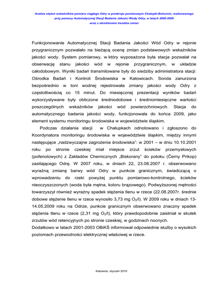 Analiza stężeń wskaźników pomiaru ciągłego Odry w przekroju pomiarowym Chałupki-Bohumin, realizowanego przy pomocy Automatycznej Stacji Badania Jakości Wody Odry, w latach 2000-2009 wraz z określeniem trendów zmian Funkcjonowanie Automatycznej Stacji Badania Jakości Wód Odry w rejonie przygranicznym pozwalało na bieżącą ocenę zmian podstawowych wskaźników jakości wody. System pomiarowy, w który wyposażona była stacja pozwalał na obserwację stanu jakości wód w rejonie przygranicznym, w układzie całodobowym. Wyniki badań transmitowane były do siedziby administratora stacji: Ośrodka Badań i Kontroli Środowiska w Katowicach. Sonda zanurzona bezpośrednio w toni wodnej rejestrowała zmiany jakości wody Odry z częstotliwością co 15 minut. Do miesięcznej prezentacji wyników badań wykorzystywane były obliczone średniodobowe i średniomiesięczne wartości poszczególnych wskaźników jakości wód powierzchniowych. Stacja do automatycznego badania jakości wody, funkcjonowała do końca 2009, jako element systemu monitoringu środowiska w województwie śląskim. Podczas działania stacji w Chałupkach odnotowano i zgłoszono do Koordynatora monitoringu środowiska w województwie śląskim, między innymi następujące „nadzwyczajne zagrożenia środowiska”: w 2001 – w dniu 10.10.2001 roku po stronie czeskiej miał miejsce zrzut ścieków przemysłowych (pofenolowych) z Zakładów Chemicznych „Biskorany” do potoku (Černy Prikop) zasilającego Odrę. W 2007 roku, w dniach 22, 23.08.2007 r. obserwowano wyraźną zmianę barwy wód Odry w punkcie granicznym, świadczącą o wprowadzeniu do rzeki powyżej punktu pomiarowo-kontrolnego, ścieków nieoczyszczonych (woda była mętna, koloru brązowego). Podwyższonej mętności towarzyszył również wyraźny spadek stężenia tlenu w rzece (22.08.2007r. średnie dobowe stężenie tlenu w rzece wynosiło 3,73 mg O2/l). W 2009 roku w dniach 1314.05.2009 roku na Odrze, punkcie granicznym obserwowano znaczny spadek stężenia tlenu w rzece (2,31 mg O2/l), który prawdopodobnie zaistniał w skutek zrzutów wód retencyjnych po stronie czeskiej, w godzinach nocnych. Dodatkowo w latach 2001-2003 OBiKŚ informował odpowiednie służby o wysokich poziomach przewodności elektrycznej właściwej w rzece. Katowice, styczeń 2010 Analiza stężeń wskaźników pomiaru ciągłego Odry w przekroju pomiarowym Chałupki-Bohumin, realizowanego przy pomocy Automatycznej Stacji Badania Jakości Wody Odry, w latach 2000-2009 wraz z określeniem trendów zmian Wnioski Pomiary ciągłe realizowane prze pomocy Automatycznej Stacji Badania Jakości Wody Odry pozwoliły na sformułowanie następujących wniosków: 1. W latach 2001-2009 średnia przewodność elektryczna właściwa Odry w przekroju kontrolnym Chałupki-Bohumin, wahała się w zakresie 0,501-0,786 mS/cm, tak wiec nie przekraczała wartości dopuszczalnej dla wód I klasy czystości1. Maksymalne wartości przewodności (1,9 mS/cm) notowane były w 2004 roku. Na przestrzeni lat 2008-2009 średnioroczna wartość przewodności ustabilizowała się na poziomie 0,6 mS/cm. 2. Zapis pomiarów (tlenu rozpuszczonego) uzyskiwanych prze pomocy Stacji pozwolił, na określenie jakości rzeki pod względem zawartości w niej zanieczyszczeń organicznych, - w latach 2001-2009 średnioroczny poziom tlenu rozpuszczonego w Odrze na granicy, kształtował się na poziomie 60% (ok.6-7mgO2/l), - pomiary potwierdziły, iż na rozpuszczalność tlenu w rzece niekorzystnie wpływają podwyższone ładunki soli, oraz wzrost temperatury wód. 3. Odczyn Odry w punkcie granicznym wahał się w szerokim zakresie pH 5,69,7. W latach 2001-2006 uzyskiwane pomiary pH mieściły się w granicach norm obowiązujących dla wód I i II klasy czystości. Analiza wartości odczynu wód Odry w punkcie granicznym, w okresie dziewięcioletnich obserwacji, wykazała wzrost tego wskaźnika w latach 2007-2009. W tym też okresie odnotowano największe wahania wskazań odczynu wód. Katowice, styczeń 2010