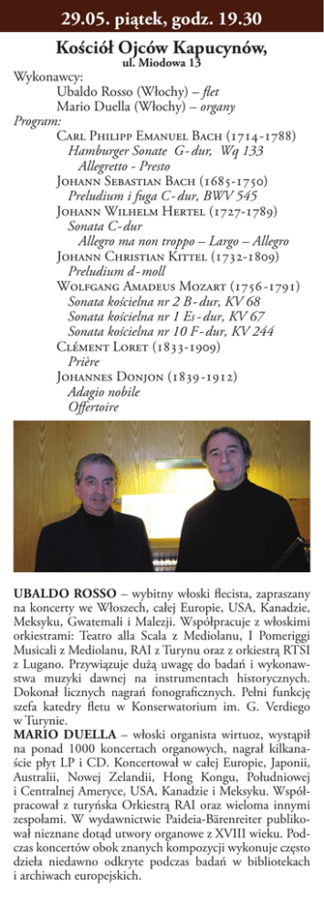 29.05. piątek, godz. 19.30 Kościół Ojców Kapucynów, ul. Miodowa 13 Wykonawcy: Ubaldo Rosso (Włochy) – flet Mario Duella (Włochy) – organy Program: Carl Philipp Emanuel Bach (1714-1788) Hamburger Sonate G- dur, Wq 133 Allegretto - Presto Johann Sebastian Bach (1685-1750) Preludium i fuga C- dur, BWV 545 Johann Wilhelm Hertel (1727-1789) Sonata C-dur Allegro ma non troppo – Largo – Allegro Johann Christian Kittel (1732-1809) Preludium d - moll Wolfgang Amadeus Mozart (1756 -1791) Sonata kościelna nr 2 B- dur, KV 68 Sonata kościelna nr 1 Es - dur, KV 67 Sonata kościelna nr 10 F- dur, KV 244 Clément Loret (1833-1909) Prière Johannes Donjon (1839 -1912) Adagio nobile Offertoire Ubaldo Rosso – wybitny włoski flecista, zapraszany na koncerty we Włoszech, całej Europie, USA, Kanadzie, Meksyku, Gwatemali i Malezji. Współpracuje z włoskimi orkiestrami: Teatro alla Scala z Mediolanu, I Pomeriggi Musicali z Mediolanu, RAI z Turynu oraz z orkiestrą RTSI z Lugano. Przywiązuje dużą uwagę do badań i wykonawstwa muzyki dawnej na instrumentach historycznych. Dokonał licznych nagrań fonograficznych. Pełni funkcję szefa katedry fletu w Konserwatorium im. G. Verdiego w Turynie. Mario Duella – włoski organista wirtuoz, wystąpił na ponad 1000 koncertach organowych, nagrał kilkanaście płyt LP i CD. Koncertował w całej Europie, Japonii, Australii, Nowej Zelandii, Hong Kongu, Południowej i Centralnej Ameryce, USA, Kanadzie i Meksyku. Współpracował z turyńska Orkiestrą RAI oraz wieloma innymi zespołami. W wydawnictwie Paideia-Bärenreiter publikował nieznane dotąd utwory organowe z XVIII wieku. Podczas koncertów obok znanych kompozycji wykonuje często dzieła niedawno odkryte podczas badań w bibliotekach i archiwach europejskich.