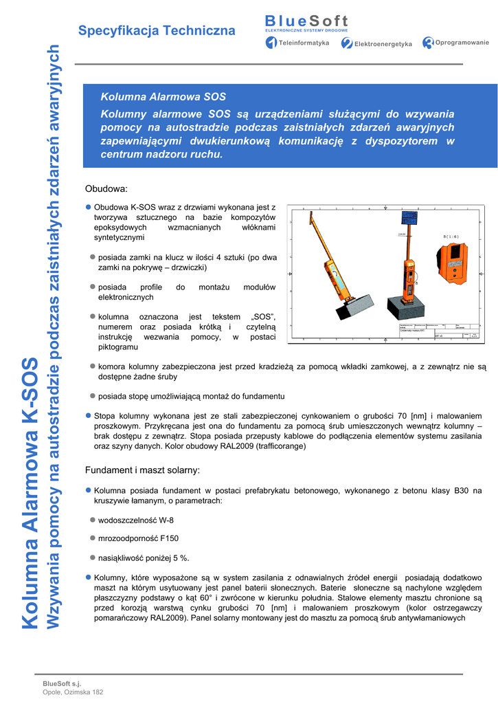 Wzywania pomocy na autostradzie podczas zaistniałych zdarzeń awaryjnych Kolumna Alarmowa K-SOS Specyfikacja Techniczna BlueSoft ELEKTRONICZNE SYSTEMY DROGOWE 1 Teleinformatyka 2 Elektroenergetyka 3 Oprogramowanie Kolumna Alarmowa SOS Kolumny alarmowe SOS są urządzeniami służącymi do wzywania pomocy na autostradzie podczas zaistniałych zdarzeń awaryjnych zapewniającymi dwukierunkową komunikację z dyspozytorem w centrum nadzoru ruchu. Obudowa: Obudowa K-SOS wraz z drzwiami wykonana jest z tworzywa sztucznego na bazie kompozytów epoksydowych wzmacnianych włóknami syntetycznymi posiada zamki na klucz w ilości 4 sztuki (po dwa zamki na pokrywę – drzwiczki) posiada profile elektronicznych do montażu modułów kolumna oznaczona jest tekstem „SOS”, numerem oraz posiada krótką i czytelną instrukcję wezwania pomocy, w postaci piktogramu komora kolumny zabezpieczona jest przed kradzieżą za pomocą wkładki zamkowej, a z zewnątrz nie są dostępne żadne śruby posiada stopę umożliwiającą montaż do fundamentu Stopa kolumny wykonana jest ze stali zabezpieczonej cynkowaniem o grubości 70 [nm] i malowaniem proszkowym. Przykręcana jest ona do fundamentu za pomocą śrub umieszczonych wewnątrz kolumny – brak dostępu z zewnątrz. Stopa posiada przepusty kablowe do podłączenia elementów systemu zasilania oraz szyny danych. Kolor obudowy RAL2009 (trafficorange) Fundament i maszt solarny: Kolumna posiada fundament w postaci prefabrykatu betonowego, wykonanego z betonu klasy B30 na kruszywie łamanym, o parametrach: wodoszczelność W-8 mrozoodporność F150 nasiąkliwość poniżej 5 %. Kolumny, które wyposażone są w system zasilania z odnawialnych źródeł energii posiadają dodatkowo maszt na którym usytuowany jest panel baterii słonecznych. Baterie słoneczne są nachylone względem płaszczyzny podstawy o kąt 60° i zwrócone w kierunku południa. Stalowe elementy masztu chronione są przed korozją warstwą cynku grubości 70 [nm] i malowaniem proszkowym (kolor ostrzegawczy pomarańczowy RAL2009). Panel solarny montowany jest do masztu za pomocą śrub antywłamaniowych BlueSoft s.j. Opole, Ozimska 182 Wzywania pomocy na autostradzie podczas zaistniałych zdarzeń awaryjnych Kolumna Alarmowa K-SOS Specyfikacja Techniczna BlueSoft ELEKTRONICZNE SYSTEMY DROGOWE 1 Teleinformatyka 2 Elektroenergetyka 3 Oprogramowanie Wyposażenie: W skład wyposażenia kolumny SOS wchodzą następujące elementy: system zasilania z odnawialnych źródeł energii, wraz z modułem zarządzania energią – w przypadku kolumn, które mają posiadać tę funkcję moduł komunikacji głosowej VOIP moduł transmisji światłowodowej System zasilania z odnawialnych źródeł energii składa się z: zestawu baterii słonecznych o napięciu pracy 24V, umieszczonego na konstrukcji wsporczej o wysokości 3,5m. Konstrukcja wsporcza jest na stałe zintegrowana z obudową kolumny zestawu akumulatorów żelowych o napięciu znamionowym 24V i dedykowanej pojemności systemu kontroli ładowania i zasilania odbiornika oraz monitoringu stanu naładowania akumulatorów modułu zarządzania energią elektryczną zgromadzoną w buforze akumulatorowym okablowania systemu zasilania Moduł komunikacji VOIP oparty na technologii VOIP krystalicznie czysty dźwięk w jakości HD wysoki poziom ciśnienia akustycznego do 105 dB aktywna redukcja hałasu tła odporna na warunki atmosferyczne, brud i kurz stopień ochrony IP66 obudowa wykonana z odlewu aluminiowego stopień ochrony IK10 Moduł transmisji światłowodowej zapewnia konwersję sygnału elektrycznego w standardzie Ethernet, na dowolny standard komunikacji światłowodowej jest kompatybilny z technologią CWDM i DWDM BlueSoft s.j. Opole, Ozimska 182