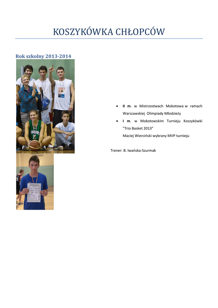 KOSZYKÓWKA CHŁOPCÓW Rok szkolny 2013-2014 II m. w Mistrzostwach Mokotowa w ramach Warszawskiej Olimpiady Młodzieży I m. w Mokotowskim Turnieju Koszykówki ”Trio Basket 2013” Maciej Wierciński wybrany MVP turnieju Trener: B. Iwańska-Szurmak Rok szkolny 2012-2013 II m. w Mistrzostwach Mokotowa w ramach Warszawskiej Olimpiady Młodzieży III m. w Mokotowskiej Lidze Koszykówki Chłopców Szkół Ponadgimnazjalnych Trener: B. Iwańska-Szurmak Rok szkolny 2011-2012 II m. w Mistrzostwach Mokotowa w ramach Warszawskiej Olimpiady Młodzieży II m. w Mokotowskiej Lidze Chłopców Szkół Ponadgimnazjalnych Trener: B. Iwańska-Szurmak Koszykówki Rok szkolny 2009-2010 IV m. w Mokotowskiej Lidze Koszykówki Chłopców Szkół Ponadgimnazjalnych – edycja jesienna Trio Bascet 2010 – awans drużyny „Reytan I” do FINAŁU Turnieju organizowanego przez Koźmińskiego Trener: B. Iwańska-Szurmak Koszykówki Ulicznej Akademię Leona Rok szkolny 2008-2009 IV m. w Mistrzostwach Mokotowa w ramach Warszawskiej Olimpiady Młodzieży Trener: B. Iwańska-Szurmak Rok szkolny 2007-2008 III m. w Mokotowskiej Lidze Koszykówki Chłopców Szkół Ponadgimnazjalnych – edycja jesienna III m. w Mistrzostwach Mokotowa w ramach Warszawskiej Olimpiady Młodzieży Trener: B. Iwańska-Szurmak Rok szkolny 2006-2007 II m. w Mokotowskiej Lidze Koszykówki Chłopców Szkół Ponadgimnazjalnych – edycja wiosenna. Tomasz Królik – został wybrany „Najlepszym Zawodnikiem Ligi” Edycji Wiosennej. V m. w edycji jesiennej Mokotowskiej Ligi Koszykówki Chłopców Szkół Ponadgimnazjalnych, Trener: B. Iwańska-Szurmak Rok szkolny 2005-2006 VII m. w Mokotowskiej Lidze Koszykówki Chłopców Szkół Ponadgimnazjalnych – edycja jesienna Trener: B. Iwańska-Szurmak