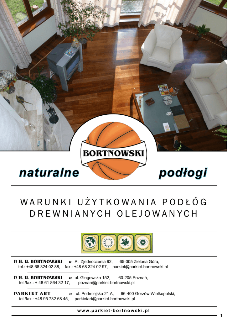 naturalne podłogi WARUNKI UŻY TKOWANIA PODŁÓG D R E W N I A N Y C h o l e j owanyc h P. H. U. BORTNOWSKI tel.: +48 68 324 02 88, » Al. Zjednoczenia 92, 65-005 Zielona Góra, fax.: +48 68 324 02 97, [email protected] P. H. U. BORTNOWSKI » ul. Głogowska 152, PA R K I E T A R T » ul. Podmiejska 21 A, 66-400 Gorzów Wielkopolski, [email protected] tel./fax.: + 48 61 864 32 17, tel./fax.: +48 95 732 68 45, 60-205 Poznań, [email protected] w w w. p a r k i e t - b o r t n o w s k i . p l 1 WARUNKI UŻYTKOWANIA PODŁÓG DREWNIANYCH Zakupili Państwo ekologiczny wysokiej jakości naturalny pakiet wykonany w 100% z naturalnego drewna o wysokiej odporności użytkowej. Poza walorami estetycznymi parkiet jest także dobrym izolatorem termicznym, izolatorem akustycznym, dobrym regulatorem mikroklimatu i wilgotności powietrza i materiałem nie alergizującym. Co ważne jest przede wszystkim trwały i może być wielokrotnie odnawiany. Muszą państwo jednak mieć świadomość że nawet tego typu podłogi również zużywają się dlatego kilka podstawowych zasad powinno być przestrzeganych w celu wydłużenia jej żywotności: Drewno jest materiałem higroskopijnym, który rozszerza się gdy wilgotność powietrza rośnie lub kurczy gdy wilgotność spada. Może to powodować powstawanie szczelin, deformacje podłogi i drobne pęknięcia gdy wilgotność powierza jest za wysoka lub za niska w pewnym przedziale czasu. Może mieć to miejsce szczególnie zimą gdy wilgotność spada. Wówczas należy dowilżać pomieszczenia najlepiej za pomocą nawilżacza elektrycznego. Również w pomieszczeniach z klimatyzacją może wystąpić zjawisko zbyt niskiej wilgotności. Aby nie mieć problemów należy utrzymywać w pomieszczeniu klimat o wilgotności powietrza 45-60% i temperaturze ok. 18-22oC. Taki klimat jest najbardziej właściwy zarówno dla zdrowia naszych Klientów jak również dla podłóg drewnianych. Również z tego powodu zimą, pomieszczenie nie może pozostawać nie ogrzewane. Idealnym sposobem pielęgnacji jest używanie do czyszczenia tylko środków pielęgnacyjno – ochronnych wskazanych poniżej. Taka pielęgnacja powinna być powtarzana w zależności od natężenia ruchu co 2-3 tygodnie. Po pielęgnacji nie może na powierzchni parkietu zalegać woda, ani płyn po pielęgnacji. Należy zapoznać się z instrukcją użytkowania załączoną do preparatu. Codzienna pielęgnacja może ograniczać się do zwykłego odkurzania bądź zamiatania podłogi. Piach lub brud powinien zostać pilnie usunięty, ponieważ działając jak najlepszy papier ścierny powoduje rysowanie podłogi i bardzo szybkie zużywanie się warstwy ochronnej oleju. Z tego względu przed wejściami powinny być umieszczone duże wycieraczki z aktywnymi szczoteczkami, przechwytujące piasek i błoto z butów, tak szerokie, aby nie można było omijać tych stref przed wejściem. Konieczne jest podklejenie krzeseł i mebli podkładkami filcowymi w celu wydłużenia żywotności podłogi. Podkładki filcowe powinny być wymieniane w zależności od stopnia zużycia. Podłoga może zostać poddana wielokrotnej renowacji poprzez szlifowanie i olejowanie, nawet we fragmentach, które podlegają najszybszemu zużyciu. Ilość renowacji uzależniona jest od stabilności podłogi, głębokości uszkodzeń mechanicznych oraz od jakości maszyny szlifującej. Proszę pamiętać, że stosowanie powyższych zaleceń znacznie wydłuża żywotność drewnianych podłóg i zmniejsza ryzyko pracy, ale nie wyklucza jej całkowicie, naturalna praca drewna nie może być przedmiotem reklamacji. Firma nie gwarantuje nadmiernego wysychania drewna przy zbyt gorących grzejnikach i w miejscach koncentracji nieizolowanych rurek ciepłowniczych w podłożu. 1. Podłoga drewniana może być użytkowana tylko w obuwiu nieniszczącym mechanicznie, bez piasku i ostrych krawędzi. Piasek działa jak papier ścierny. Olej jest elementem eksploatacyjnym i jego trwałość zależy od prawidłowej pielęgnacji i sposobu użytkowania. W zależności od stopnia zużycia podlega on ciągłemu uzupełnianiu środkami pielęgnacyjnymi przez osoby utrzymujące czystość. Gwarancja nie obejmuje uszkodzeń mechanicznych. 2 2. Przed wejściami na parkiet powinny być umieszczone wycieraczki na całą szerokość korytarza w celu przechwytywania mokrego błota, brudu i piasku. 3. Usuwanie kurzu powinno być wykonywane lekko wilgotną ścierką z dodatkiem płynu pielęgnacyjnego (mydła) BONA Carls Cleaner (200ml/ max 10 L. wody). Po wyschnięciu można nanieść płyn BONA Carls Oil 25 (ok. 300 ml na 100 m2) zgodnie z instrukcją zawsze polerując podłogę do sucha. Podłogę należy sprzątać na sucho lub w miarę potrzeb na mokro nie używając dużej ilości wody a tylko mocno wykręconą szmatę lub mopa gdyż ze względu na niską wilgotność klepek może dojść do wykrawędziowania, wyłódkowania, a w skrajnym przypadku do wybrzuszenia parkietu). Nie mogą pod żadnym warunkiem po sprzątaniu pozostawać mokre ślady. Wszelkie uszkodzenia bądź zaplamienia podłogi spowodowane wylaniem wody i innych płynów lub działaniem wilgoci nie stanowią podstaw do reklamacji. 4. Zaleca się przynajmniej raz na 6 miesięcy i zawsze po bardzo intensywnym użytkowaniu przeprowadzić gruntowne polerowanie parkietu preparatem BONA Carls Oil 25. W razie konieczności w strefach największego zużycia, zalecamy wcześniejsze wyszorowanie maszynowe czarnymi padami i płynem BONA Carls Cleaner. Maszynowe umycie i wytarcie płynu pielęgnacyjnego maszyną do polerowania, robimy zawsze z udziałem ścierek flanelowych, a po wyschnięciu podłogi stosujemy polerując do sucha olej pielęgnacyjny BONA Carls Oil 25 a w razie znacznego ubytku warstwy ochronnej olej BONA Carls Oil 45. 5. Ze względu na dążenie drewna do równowagi higroskopijnej. Z otaczającym powietrzem wilgotność powietrza powinna być w przedziale 45-60%, a temperatura w przedziale