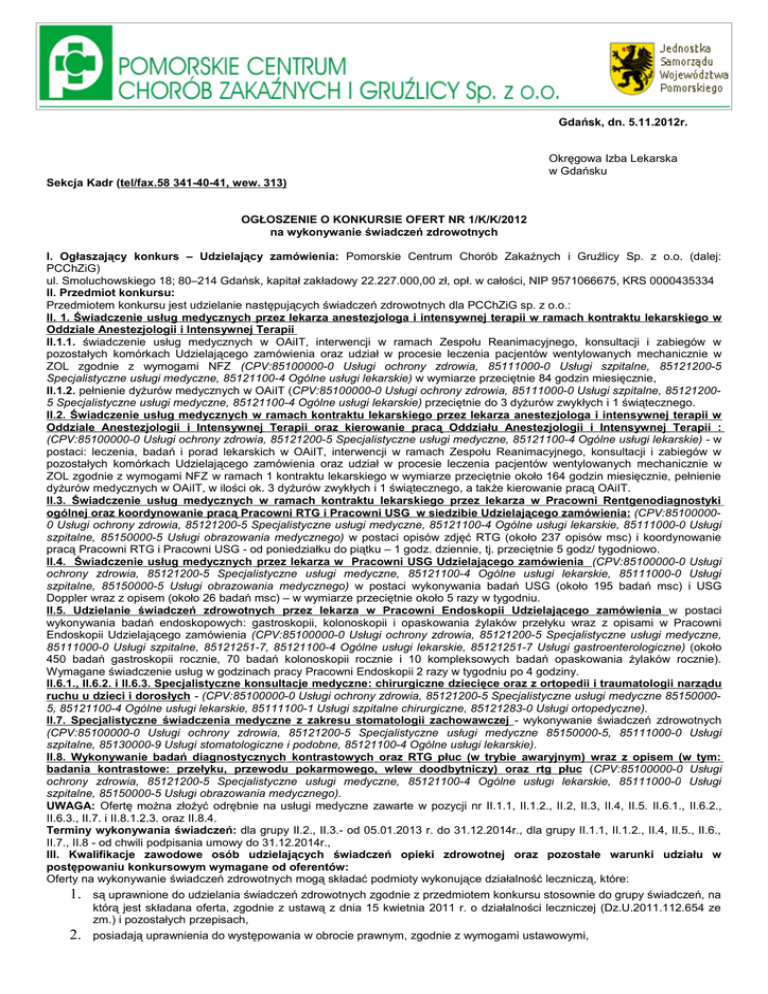 Gdańsk, dn. 5.11.2012r. Okręgowa Izba Lekarska w Gdańsku Sekcja Kadr (tel/fax.58 341-40-41, wew. 313) OGŁOSZENIE O KONKURSIE OFERT NR 1/K/K/2012 na wykonywanie świadczeń zdrowotnych I. Ogłaszający konkurs – Udzielający zamówienia: Pomorskie Centrum Chorób Zakaźnych i Gruźlicy Sp. z o.o. (dalej: PCChZiG) ul. Smoluchowskiego 18; 80–214 Gdańsk, kapitał zakładowy 22.227.000,00 zł, opł. w całości, NIP 9571066675, KRS 0000435334 II. Przedmiot konkursu: Przedmiotem konkursu jest udzielanie następujących świadczeń zdrowotnych dla PCChZiG sp. z o.o.: II. 1. Świadczenie usług medycznych przez lekarza anestezjologa i intensywnej terapii w ramach kontraktu lekarskiego w Oddziale Anestezjologii i Intensywnej Terapii II.1.1. świadczenie usług medycznych w OAiIT, interwencji w ramach Zespołu Reanimacyjnego, konsultacji i zabiegów w pozostałych komórkach Udzielającego zamówienia oraz udział w procesie leczenia pacjentów wentylowanych mechanicznie w ZOL zgodnie z wymogami NFZ (CPV:85100000-0 Usługi ochrony zdrowia, 85111000-0 Usługi szpitalne, 85121200-5 Specjalistyczne usługi medyczne, 85121100-4 Ogólne usługi lekarskie) w wymiarze przeciętnie 84 godzin miesięcznie, II.1.2. pełnienie dyżurów medycznych w OAiIT (CPV:85100000-0 Usługi ochrony zdrowia, 85111000-0 Usługi szpitalne, 851212005 Specjalistyczne usługi medyczne, 85121100-4 Ogólne usługi lekarskie) przeciętnie do 3 dyżurów zwykłych i 1 świątecznego. II.2. Świadczenie usług medycznych w ramach kontraktu lekarskiego przez lekarza anestezjologa i intensywnej terapii w Oddziale Anestezjologii i Intensywnej Terapii oraz kierowanie pracą Oddziału Anestezjologii i Intensywnej Terapii : (CPV:85100000-0 Usługi ochrony zdrowia, 85121200-5 Specjalistyczne usługi medyczne, 85121100-4 Ogólne usługi lekarskie) - w postaci: leczenia, badań i porad lekarskich w OAiIT, interwencji w ramach Zespołu Reanimacyjnego, konsultacji i zabiegów w pozostałych komórkach Udzielającego zamówienia oraz udział w procesie leczenia pacjentów wentylowanych mechanicznie w ZOL zgodnie z wymogami NFZ w ramach 1 kontraktu lekarskiego w wymiarze przeciętnie około 164 godzin miesięcznie, pełnienie dyżurów medycznych w OAiIT, w ilości ok. 3 dyżurów zwykłych i 1 świątecznego, a także kierowanie pracą OAiIT. II.3. Świadczenie usług medycznych w ramach kontraktu lekarskiego przez lekarza w Pracowni Rentgenodiagnostyki ogólnej oraz koordynowanie pracą Pracowni RTG i Pracowni USG w siedzibie Udzielającego zamówienia: (CPV:851000000 Usługi ochrony zdrowia, 85121200-5 Specjalistyczne usługi medyczne, 85121100-4 Ogólne usługi lekarskie, 85111000-0 Usługi szpitalne, 85150000-5 Usługi obrazowania medycznego) w postaci opisów zdjęć RTG (około 237 opisów msc) i koordynowanie pracą Pracowni RTG i Pracowni USG - od poniedziałku do piątku – 1 godz. dziennie, tj. przeciętnie 5 godz/ tygodniowo. II.4. Świadczenie usług medycznych przez lekarza w Pracowni USG Udzielającego zamówienia (CPV:85100000-0 Usługi ochrony zdrowia, 85121200-5 Specjalistyczne usługi medyczne, 85121100-4 Ogólne usługi lekarskie, 85111000-0 Usługi szpitalne, 85150000-5 Usługi obrazowania medycznego) w postaci wykonywania badań USG (około 195 badań msc) i USG Doppler wraz z opisem (około 26 badań msc) – w wymiarze przeciętnie około 5 razy w tygodniu. II.5. Udzielanie świadczeń zdrowotnych przez lekarza w Pracowni Endoskopii Udzielającego zamówienia w postaci wykonywania badań endoskopowych: gastroskopii, kolonoskopii i opaskowania żylaków przełyku wraz z opisami w Pracowni Endoskopii Udzielającego zamówienia (CPV:85100000-0 Usługi ochrony zdrowia, 85121200-5 Specjalistyczne usługi medyczne, 85111000-0 Usługi szpitalne, 85121251-7, 85121100-4 Ogólne usługi lekarskie, 85121251-7 Usługi gastroenterologiczne) (około 450 badań gastroskopii rocznie, 70 badań kolonoskopii rocznie i 10 kompleksowych badań opaskowania żylaków rocznie). Wymagane świadczenie usług w godzinach pracy Pracowni Endoskopii 2 razy w tygodniu po 4 godziny. II.6.1., II.6.2. i II.6.3. Specjalistyczne konsultacje medyczne: chirurgiczne dziecięce oraz z ortopedii i traumatologii narządu ruchu u dzieci i dorosłych - (CPV:85100000-0 Usługi ochrony zdrowia, 85121200-5 Specjalistyczne usługi medyczne 851500005, 85121100-4 Ogólne usługi lekarskie, 85111100-1 Usługi szpitalne chirurgiczne, 85121283-0 Usługi ortopedyczne). II.7. Specjalistyczne świadczenia medyczne z zakresu stomatologii zachowawczej - wykonywanie świadczeń zdrowotnych (CPV:85100000-0 Usługi ochrony zdrowia, 85121200-5 Specjalistyczne usługi medyczne 85150000-5, 85111000-0 Usługi szpitalne, 85130000-9 Usługi stomatologiczne i podobne, 85121100-4 Ogólne usługi lekarskie). II.8. Wykonywanie badań diagnostycznych kontrastowych oraz RTG płuc (w trybie awaryjnym) wraz z opisem (w tym: badania kontrastowe: przełyku, przewodu pokarmowego, wlew doodbytniczy) oraz rtg płuc (CPV:85100000-0 Usługi ochrony zdrowia, 85121200-5 Specjalistyczne usługi medyczne, 85121100-4 Ogólne usługi lekarskie, 85111000-0 Usługi szpitalne, 85150000-5 Usługi obrazowania medycznego). UWAGA: Ofertę można złożyć odrębnie na usługi medyczne zawarte w pozycji nr II.1.1, II.1.2., II.2, II.3, II.4, II.5. II.6.1., II.6.2., II.6.3., II.7. i II.8.1.2.3. oraz II.8.4. Terminy wykonywania świadczeń: dla grupy II.2., II.3.- od 05.01.2013 r. do 31.12.2014r., dla grupy II.1.1, II.1.2., II.4, II.5., II.6., II.7., II.8 - od chwili podpisania umowy do 31.12.2014r., III. Kwalifikacje zawodowe osób udzielających świadczeń opieki zdrowotnej oraz pozostałe warunki udziału w postępowaniu konkursowym wymagane od oferentów: Oferty na wykonywanie świadczeń zdrowotnych mogą składać podmioty wykonujące działalność leczniczą, które: 1. są uprawnione do udzielania świadczeń zdrowotnych zgodnie z przedmiotem konkursu stosownie do grupy świadczeń, na którą je
