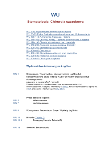 WU Stomatologia. Chirurgia szczękowa WU 1-49 Wydawnictwa informacyjne i ogólne WU 50-95 Etyka. Praktyka zawodowa i personel. Dokumentacja WU 100-113.7 Anatomia. Fizjologia. Higiena WU 140-166 Choroby. Urazy. Technika dentystyczna. Leczenie WU 170-190 Chemia stomatologiczna i materiały WU 210-290 Anatomia stomatologiczna. Choroby WU 300-360 Stomatologia zachowawcza WU 400-440 Ortodoncja WU 460-495 Stomatologia różnych grup pacjentów WU 500-530 Protetyka stomatologiczna WU 600-640 Chirurgia szczękowa Wydawnictwa informacyjne i ogólne WU 1 Organizacje. Towarzystwa, stowarzyszenia (ogólnie lub nieklasyfikowane gdzie indziej) (Cutter od nazwy organizacji lub stowarzyszenia) (używane w monografiach i seriach) Zawiera listę/wykazy członków towarzystw wydawane w seriach lub osobno/oddzielnie. Klasyfikuj informatory w WU 22. Roczne sprawozdania, raporty itp. w W1. Dla uczelni i instytutów patrz WU 23-24. WU 5 WU 7 Prace zebrane (ogólnie) Wielu autorów Jednego autora WU 9 Wystąpienia. Prezentacje. Eseje. Wykłady (ogólnie) WU 11 WU 11.1 Historia (Tabela G) Zasięg ogólny (nie Tabela G) WU 13 Słowniki. Encyklopedie (używane w monografiach i seriach) WU 15 Klasyfikacja. Terminologia (używane w monografiach i seriach) WU 16 Tabele. Statystyki (używane w monografiach i seriach) WU 17 Atlasy. Albumy Klasyfikuj atlasy poszczególnych części układu w odpowiednich numerach WU 317, WU 417, WU 507, WU 600.7. WU 18 Edukacja Klasyfikuj tutaj prace dotyczące nauczania (edukacji). WU 18.2 Materiały edukacyjne (używane w monografiach i seriach) Klasyfikuj tutaj materiały edukacyjne takie jak zarysy, streszczenia, pytania i odpowiedzi, testy, materiały do samokształcenia, katalogi, szkolenia, materiały do nauczania wspomaganego komputerowo, itp. niezależnie od formatu. Podręczniki, niezależnie od formatu, klasyfikuj według tematu, którego dotyczą (tematycznie). WU 18.5 Edukacja asystentów stomatologicznych, higienistek stomatologicznych, techników dentystycznych WU 19 Szkoły i uczelnie (college) (używane w monografiach i seriach) Klasyfikuj informatory dla kandydatów na studia, katalogi itp. w W 19.5 WU 20 Szkolnictwo stomatologiczne wyższe i szkolnictwo stomatologiczne dokształcające (w tym stypendia naukowe i uczniowskie, staże i rezydentury) WU 20.5 Badania naukowe stomatologiczne (ogólnie) Klasyfikuj tutaj prace dotyczące badań naukowych ogólnie. Prace poświęcone badaniom naukowym na dany temat, klasyfikuj według tematu. WU 21 Stomatologia jako zawód. Recenzje naukowe (analizy badawcze) WU 22 WU 22.1 Informatory (Tabela G) Zasięg ogólny (nie Tabela G) (używane w monografiach i seriach) WU 23 WU 24 Laboratoria, akademie, instytuty badawcze, itp. Zbiorowo Poszczególne instytucje (Cutter od nazwy instytucji) WU 24.5 WU 24.51 Banki (Tabela G) Zasięg ogólny (nie Tabela G) WU 25 Podręczniki laboratoryjne. Techniki i procedury laboratoryjne Klasyfikuj podręczniki dotyczące protetyki stomatologicznej w WU 500-530. WU 26 Sprzęt, wyposażenie i materiały (ogólnie) Klasyfikuj katalogi w W 26; klasyfikuj prace dotyczące materiałów stomatologicznych w WU 180-190; Aparaty ortodontyczne w WU 426. WU 26.5 Informatyka. Automatyczne przetwarzanie danych. Komputery (ogólnie) Klasyfikuj prace na temat konkretnych zastosowań według tematów w danej dziedzinie. WU 27 WU 27.1 WU 28 WU 28.5 WU 28.6 WU 29 Szpitale, kliniki, ambulatoria, przychodnie Zbiorowo (Tabela G) Zasięg ogólny (nie Tabela G) Poszczególne jednostki (szpitale) (Cutter od nazwy szpitala) (Tabela G) Muzea, Wystawy Zbiorowo Poszczególne muzea (Cutter od nazwy muzeum) Opieka stomatologiczna i profilaktyka zdrowotna. Kontrola zakażeń stomatologicznych Por. z W 260 Ubezpieczenie stomatologiczne; WC 195 prace ogólne na temat Kontroli zakażeń; WX 167 Zakażenie szpitalne kontrola WU 30 Zbieranie danych, badania WU 32 Prawo (Tabela G) (używane w monografiach i seriach) WU 32.1 WU 33 Zasięg ogólny (nie Tabela G) (używane w monografiach i seriach) Komentarze do przepisów prawnych (Tabela G) (używane w monografiach i seriach) Zasięg ogólny (nie Tabela G) (używane w monografiach i seriach) WU 33.1 [WU 39] [numer nieużywany] Klasyfikuj poradniki stomatologiczne w WU 49. WU 40.1 Prawo praktyki stomatologicznej dla stomatologów i higienistek stomatologicznych (Tabela G) Zasięg ogólny (nie Tabela G) WU 44 WU 44.1 Błąd w sztuce (Tabela G) Zasięg ogólny (nie Tabela G) WU 49 Poradniki. Przewodniki (używane w monografiach i seriach) WU 40 Etyka. Praktyka zawodowa i personel. Dokumentacja WU 50 Etyka w stomatologii WU 58 Reklama WU 61 Relacja między stomatologami. Postawa Klasyfikuj tutaj prace dotyczące relacji z pacjentami, środowiskiem, lekarzami. WU 77 Ekonomika opieki stomatologicznej. Organizacja praktyki WU 79 Praktyka zespołowa stomatologiczna. Spółdzielnie stomatologiczne WU 80 Prace popularne (ogólnie) Klasyfikuj prace dotyczące dzieci w WU 113.6. WU 90 Personel stomatologiczny średni i pomocniczy (Np. zakres obowiązków, możliwości rozwoju zawodowego, instrukcje pracy) Klasyfikuj materiały dotyczące techników dentystycznych w WU 150. WU 95 Dokumentacja stomatologiczna Anatomia. Fizjologia. Higiena WU 100 Prace ogólne Klasyfikuj tutaj prace dotyczące specjalności oraz specjalności i choroby razem. Klasyfikuj osobno prace dotyczące choroby w WU 140.W tym prace dotyczące stomatologii dla lekarzy innych specjalności. WU 101 Anatomia. Histologia. Morfologia. Embriologia W tym prace: Szczęka i żuchwa WU 101.5 Wady rozwojowe i zniekształcenie szczęki i żuchwy, jamy ustnej i/lub zębów (ogólnie) Por. z WU 600 Chirurgia jamy ustnej. WU 102 Fizjologia (Np. Żucie) W tym prace: Szczęka i żuchwa WU 105 Stany nagłe w stomatologii (ogólnie) WU 113 Stan jamy ustnej i higiena jamy ustnej. Stomatologia prewencyjna i profilaktyka Klasyfikuj tutaj prace na temat programów edukacyjnych i profilaktycznych w szkołach. Por. z WA 350 Opieka stomatologiczna w szkoł