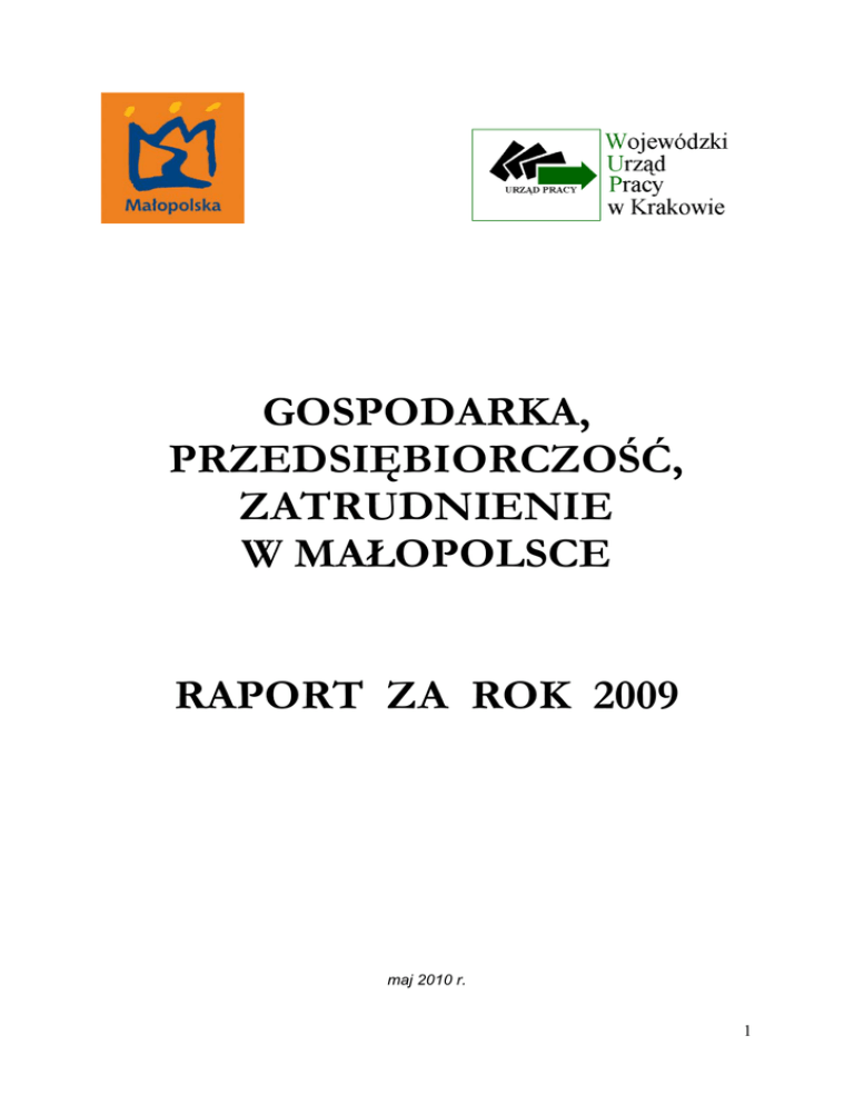 GOSPODARKA, PRZEDSIĘBIORCZOŚĆ, ZATRUDNIENIE W MAŁOPOLSCE RAPORT ZA ROK 2009 maj 2010 r. 1 SPIS TREŚCI 1. 2. 3. 4. WPROWADZENIE ........................................................................................... 2 PODMIOTY GOSPODARCZE I KONIUNKTURA ............................................ 5 ZATRUDNIENIE ............................................................................................ 20 ZJAWISKA WARUNKUJĄCE SYTUACJĘ NA RYNKU PRACY .................... 32 4.1. Zadowolenie z pracy ............................................................................... 32 4.2. Wynagrodzenia ....................................................................................... 33 4.3. Migracje .................................................................................................. 34 5. PODSUMOWANIE ............................................................................................ 39 1 1. WPROWADZENIE Raport omawia sytuację gospodarczą Małopolski w 2009 roku w kontekście światowego kryzysu gospodarczego. Dlatego analiza dynamiki liczby podmiotów gospodarki narodowej została poparta wynikami badań koniunktury oraz wskaźnikami gospodarczymi. Omówiono również wpływ kryzysu i koniunktury gospodarczej na sytuację zatrudnieniową w Małopolsce w 2009 roku, uwzględniając oceny przedsiębiorców prezentowane w raportach z badań przeprowadzonych w regionie. Nieco miejsca poświęcono takim czynnikom związanym z rynkiem pracy, jak mobilność (migracje zagraniczne i powrotne) oraz zarobki. Do przygotowania powyższych informacji wykorzystano przede wszystkim dane dostępne w statystyce publicznej, jak również wyniki badań i analiz, wykonanych głównie przez Małopolskie Obserwatorium Rynku Pracy i Edukacji oraz Małopolskie Obserwatorium Gospodarki. Według danych Urzędu Statystycznego w Krakowie w okresie styczeń-grudzień 2009 r. sytuacja społeczno-gospodarcza województwa małopolskiego zmieniła się w porównaniu z rokiem poprzednim w kilku wymiarach. Liczba podmiotów gospodarki narodowej w rejestrze KRUPGN-REGON (według stanu w końcu roku) wzrosła o 12 444 jednostki. Więcej niż przed rokiem było zarówno osób fizycznych prowadzących działalność gospodarczą, jak i osób prawnych oraz jednostek organizacyjnych bez osobowości prawnej. Zwiększyła się liczba spółek handlowych, również tych z udziałem kapitału zagranicznego. Nastąpił też dalszy spadek ilości spółdzielni oraz przedsiębiorstw państwowych. Obniżyły się przychody ze sprzedaży wyrobów i usług uzyskane przez przedsiębiorstwa przemysłowe. Spadek sprzedaży produkcji dotyczył wszystkich sekcji należących do przemysłu, w tym szczególnie sekcji wytwarzanie i zaopatrywanie w energię elektryczną, gaz, parę wodną i gorącą wodę. Zmniejszyła się wydajność pracy mierzona produkcją sprzedaną na jednego zatrudnionego oraz czas przepracowany. Przedsiębiorstwa budowlano-montażowe odnotowały wzrost przychodów ze sprzedaży produkcji i usług. Zwiększył się udział produkcji budowlano-montażowej w ogólnej kwocie przychodów ze sprzedaży w sekcji budownictwo, spadł natomiast udział robót o charakterze inwestycyjnym w produkcji budowlano-montażowej. Wzrosła liczba mieszkań oddanych do użytkowania, zwłaszcza w budownictwie na sprzedaż lub wynajem. Mniej było lokali mieszkaniowych, na budowę których wydano pozwolenia, jak również mieszkań, 2 których budowę rozpoczęto. Efekty budownictwa mieszkaniowego w województwie małopolskim kształtowały się korzystniej niż w kraju. Obroty hurtowe jednostek handlowych i niehandlowych obniżyły się, podczas gdy sprzedaż detaliczna uzyskana przez te jednostki wzrosła. Największy wzrost sprzedaży odnotowano w branży „pozostała” sprzedaż detaliczna w niewyspecjalizowanych sklepach, a także w sprzedaży farmaceutyków, kosmetyków, sprzętu ortopedycznego. Na małopolskim rynku pracy odnotowano niewielki wzrost przeciętnego zatrudnienia w sektorze przedsiębiorstw (odwrotnie niż w kraju). Spadek zatrudnienia wystąpił tylko w listopadzie i grudniu. Ogółem zatrudnienie zwiększyło się w większości sekcji. Wzrosła liczba zarejestrowanych bezrobotnych (zwłaszcza wśród osób młodych), a także stopa bezrobocia, przy równoczesnym spadku ilości ofert pracy. Tempo wzrostu przeciętnego miesięcznego wynagrodzenia brutto wyraźnie spadło i było niższe niż średnie w kraju. Płace wzrosły we wszystkich sekcjach sektora przedsiębiorstw, a szczególnie w górnictwie i wydobywaniu oraz administrowaniu i działalności wspierającej. Zwiększył się czas przepracowany oraz średnie wynagrodzenie godzinowe. Przeciętna pensja była nadal niższa niż średnia krajowa. Większość pojęć użytych w raporcie zostało zdefiniowanych w poprzedniej edycji opracowania1 i w niniejszym dokumencie będą one stosowane w tym samym znaczeniu. Tam, gdzie konieczne było wprowadzenie nowych pojęć, zostały one objaśnione w przypisach. Od 2009 r. GUS w opracowaniach2 prezentuje dane w układzie Polskiej Klasyfikacji Działalności 2007 (PKD 2007), opracowanej na podstawie Statystycznej Klasyfikacji Działalności Gospodarczych we Wspólnocie Europejskiej3. Wprowadzone zmiany w klasyfikacji PKD 2007 w stosunku do klasyfikacji PKD 2004 wynikają przede wszystkim ze zmian zakresowych, polegających na wprowadzeniu nowych grupowań rodzajów działalności (uwzględnienie nowych, podział lub agregacja dotychczasowych), a także na przesunięciach rodzajów działalności pomiędzy poszczególnymi poziomami klasyfikacyjnymi. Spowodowało to, że w PKD 2007 wyróżnia się 21 sekcji i 88 działów, a w PKD 2004 - 17 sekcji i 62 działy. Należy zwrócić uwagę, że w niektórych przypadkach, pomimo niezmienionych nazw poziomów klasyfikacyjnych wg PKD 2007 w stosunku do PKD 2004, 1 Gospodarka, przedsiębiorczość, zatrudnienie w Małopolsce. Raport za rok 2008. Ma