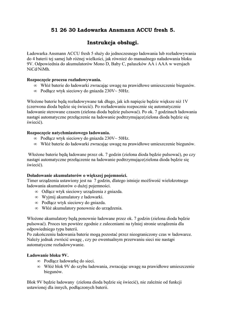 51 26 30 Ładowarka Ansmann ACCU fresh 5. Instrukcja obsługi. Ładowarka Ansmann ACCU fresh 5 służy do jednoczesnego ładowania lub rozładowywania do 4 baterii tej samej lub różnej wielkości, jak również do manualnego naładowania bloku 9V. Odpowiednia do akumulatorów Mono D, Baby C, paluszków AA i AAA w wersjach NiCd/NiMh. Rozpoczęcie procesu rozładowywania. • Włóż baterie do ładowarki zwracając uwagę na prawidłowe umieszczenie biegunów. • Podłącz wtyk sieciowy do gniazda 230V~ 50Hz. Włożone baterie będą rozładowywane tak długo, jak ich napięcie będzie większe niż 1V (czerwona dioda będzie się świecić). Po rozładowaniu rozpocznie się automatycznie ładowanie sterowane czasem (zielona dioda będzie pulsować). Po ok. 7 godzinach ładowania nastąpi automatyczne przełączenie na ładowanie podtrzymujące(zielona dioda będzie się świecić). Rozpoczęcie natychmiastowego ładowania. • Podłącz wtyk sieciowy do gniazda 230V~ 50Hz. • Włóż baterie do ładowarki zwracając uwagę na prawidłowe umieszczenie biegunów. Włożone baterie będą ładowane przez ok. 7 godzin (zielona dioda będzie pulsować), po czy nastąpi automatyczne przełączenie na ładowanie podtrzymujące(zielona dioda będzie się świecić). Doładowanie akumulatorów o większej pojemności. Timer urządzenia ustawiony jest na 7 godzin, dlatego istnieje możliwość wielokrotnego ładowania akumulatorów o dużej pojemności. • Odłącz wtyk sieciowy urządzenia z gniazda. • Wyjmij akumulatory z ładowarki. • Podłącz wtyk sieciowy do gniazda. • Włóż akumulatory ponownie do urządzenia. Włożone akumulatory będą ponownie ładowane przez ok. 7 godzin (zielona dioda będzie pulsować). Proces ten powtórz zgodnie z zaleceniami na tylniej stronie urządzenia dla odpowiedniego typu baterii. Po zakończeniu ładowania baterie mogą pozostać przez nieograniczony czas w ładowarce. Należy jednak zwrócić uwagę , czy po ewentualnym przerwaniu sieci nie nastąpi automatyczne rozładowywanie. Ładowanie bloku 9V. • Podłącz ładowarkę do sieci. • Włóż blok 9V do szybu ładowania, zwracając uwagę na prawidłowe umieszczenie biegunów. Blok 9V będzie ładowany (zielona dioda będzie się świecić), nie zależnie od funkcji ustawionej dla innych, podłączonych baterii. Uwaga: przy ładowaniu bloku nie następuje automatyczne przełączenie na ładowanie podtrzymujące, po max 14 godzinach należy go manualnie odłączyć, aby nie doszło do przeładowania. Wyładowanie wstępne. Proces rozładowywania służy likwidacji tzw. efektu pamięci. Baterie mające ulec rozładowaniu należy najpierw włożyć do ładowarki i podłączyć urządzenie do sieci. Po rozładowaniu akumulatorów nastąpi ponownie automatyczne naładowanie. Ładowanie sterowane timerem- ochrona przed przeładowaniem. Czas ładowania sterowany jest przez zintegrowany timer. Wyklucza to możliwość wystąpienia przeładowania.. Ładowanie podtrzymujące. Po zakończeniu procesu ładowania następuje automatyczne przełączenie na ładowanie podtrzymujące. Wskaźniki stanu ładowania. Czerwona dioda świeci się – rozładowywanie. Zielona dioda pulsuje- ładowanie okrągłych baterii. Zielona dioda świeci się- akumulatory pełne/ ładowanie podtrzymujące. Zielona dioda(na górze) świeci się- ładowanie bloku 9V. Środki ostrożności: • Nie podłączaj suchych baterii lub Alkali- Mangan Accus. • Nie otwieraj obudowy urządzenia. • Naprawy dokonuj w uprawnionym do tego serwisie. • Nagrzanie akumulatorów podczas ładowania jest zjawiskiem prawidłowym. Dane techniczne. Typ akumulatora Mono/Baby Mono Baby Mignon Mignon Micro Micro Blok 9V Pojemność 1,2-1,4Ah 4,0-4,5 Ah 2,0-2,2 Ah 0,6-0,7 Ah 1,2 Ah 0,2-0,22 Ah 0,45 Ah 0,11-0,13 Ah Czas ładowania Ok 7 godz. Ok 21 godz. Ok. 14 godz. Ok. 7 godz. Ok. 14 godz. Ok. 7 godz. Ok. 14 godz. Ok. 14 godz. Sterowanie czasem automatyczne manualne manualne automatyczne manualne automatyczne manualne manualne