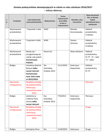 Zestaw podręczników obowiązujących w szkole w roku szkolnym 2016/2017 – arkusz zbiorczy L. p. Przedmiot Tytuł podręcznika tytuły podręczników Wydawnictwo Forma dopuszczenia przez MEN, w tym nr dopuszczenia Nazwiska, imię nauczyciela Klasy lub poziom klas, w których będzie obowiązywał dany podręcznik Wychowanie przedszkolne Tropiciele 5-latki WSiP Monika Korzeniowska Oddział przedszkolny 5-latków Wychowanie przedszkolne Tropiciele 4-latki WSiP Żaneta Ochman Oddział przedszkolny 4-latków Wychowanie przedszkolne Bawię się i przygotowuję do szkoły-cały pakiet Kontynuacja Pakietu Jesteśmy dziećmi Bożymi tylko zeszyt ćwiczeń Kontynuacja tych, które były w 2015/2016 Bezpłatny dostęp do podręczników informacja sierpień/wrzesień 2016 Jesteśmy w rodzinie Pana Jezusa tylko zeszyt ćwiczeń Bezpłatny dostęp do podręczników informacja sierpień/wrzesień 2016 Nowa Era Sikora Barbara Oddział przedszkolny Kl.”0” /5 – latki i 6 – latki/ Katarzyna Kopycińska Oddział przedszkolny Kl.”0” Kochajmy Pana Św. Religia Nauczanie zintegrowane Religia Nauczania zintegrowane Religia Św. Stanisław, Kraków 2013 1111/2013 Pierwsza Św. Stanisław, Kraków 2012 776/2012 Katarzyna Kopycińska Pierwsza Druga 1120/2013 Katarzyna Druga Jezusa tylko zeszyt ćwiczeń Religia Stanisław, Kraków 2014 Kopycińska Bezpłatny dostęp do podręczników informacja sierpień/wrzesień 2016 Trzecia Bezpłatny dostęp do podręczników informacja sierpień/wrzesień 2016 Piąta Wierzymy w Pana w Boga Wyd. Wiesław Widuch Piąta Język polski „Między nami” Zeszyty ćwiczeń Cz 1 i 2 GWO Babicz Monika Szósta Język angielski TODAY3(podręcz nik + ćwiczenia) minirepetytorium STARA WERSJA Pearson Malciak Małgorzata Szósta Matematyka Matematyka 2001 + ćwiczenia WSiP 56/06 Pacut Ewa Szósta Przyroda Tajemnice przyrody 6 +ćwiczenia Nowa Era 339/1/2011 Dereniowska Cecylia Szósta Historia Wczoraj i dziś 2cz+ ćwiczenia Nowa Era Kamińska Mirosława Szósta Zajęcia techniczne Jak to działa? Podręcznik z ćwiczeniami do zajęć Nowa Era Dereniowska Cecylia Szósta Św.Stanisława Kraków 2013 445/2/2013 technicznych dla klas 4-6 Zajęcia komputerowe Informatyka Europejczyka Podręcznik do zajęć komputerowych Dla szkoły podstawowej klasa 6 Edycja Windows XP Muzyczny Świat Kl.6 Helion edukacja Dereniowska Cecylia Szósta MAC Wróbel Iwona Szósta Plastyka Na ścieżkach wyobraźni WSiP 550/2/2013 Monika Szósta Religia W kościele umacniamy wiarę Wyd. Św. Stanisław, Kraków 2013 1118/2013 Ks. Wiesław Widuch Szósta Muzyka Bezpłatny dostęp do podręczników informacja sierpień/wrzesień 2016 Religia Spotkanie ze Słowem I gimnazjum Wyd. Św. Stanisław, Kraków 2012 778/2012 Katarzyna Kopycińska Bezpłatny dostęp do podręczników informacja sierpień/wrzesień 2016 I gimnazjum II gimnazjum Język polski Świat w słowach i obrazach WSiP 26/2/2009 Kasprzyk Dorota III gimnazjum Język angielski Kontynuacja Up Beat 3 + Repetytorium Gimnazjalistypoziom Wyd. McMillan Autorzy: K.Kotorowicz -Jasińska 316/3/2011 /z1 Malciak Małgorzata III gimnazjum podstawowy i rozszerzony wyd. Macmillan Kompass 3 neu Podręcznik Matematyka z plusem + ćwiczenia A.Mędela Fizyka Język niemiecki WSZPWN 622/2/2012 Budzowska Izabela Pacut Ewa III gimnazjum GWO 39/2/2009 Świat Fizyki 3 +ćwiczenia ZamKor 11/2/2010 Brózda Ewelina III gimnazjum Geografia Planeta Nowa 3 Nowa Era 7/1/2009 III gimnazjum Puls Życia Nowa Era 28/08/2012 Wojewodzic Jacek Filek-Sikora Iwona Biologia Chemia Nowa Era Nowa Era 60/2/2010 Filek-Sikora Iwona Bernadeta KalębaŻołnierek III gimnazjum Historia Chemia Nowej Ery cz. 3 Śladami Przeszłości kl.III + zeszyt ćwiczeń Zajęcia techniczne Zajęcia techniczne Operon 199/2009 Dereniowska Cecylia III gimnazjum Religia W miłości Boga Wyd. Św. Stanisława 351/2014 Wiesław Widuch III gimnazjum Edukacja dla bezpieczeństwa WOS Żyję i działam bezpiecznie WOS cz. 2 + zeszyt ćwiczeń Nowa Era 17/2009 III gimnazjum Operon 96/2/2010 Plastyka „Plastyka” Operon Filek-Sikora Iwona Iwona Niedźwiedź Iwona Wróbel Matematyka III gimnazjum IIIgimnazjum III gimnazjum III gimnazjum III gimnazjum