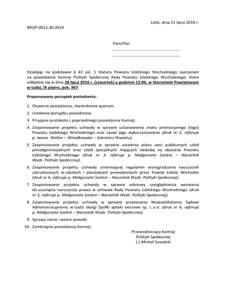 Łódź, dnia 21 lipca 2016 r. BRiZP.0012.30.2016 Pani/Pan ………………………………………………………. ………………………………………………………. Działając na podstawie § 43 ust. 1 Statutu Powiatu Łódzkiego Wschodniego zapraszam na posiedzenie Komisji Polityki Społecznej Rady Powiatu Łódzkiego Wschodniego, które odbędzie się w dniu 28 lipca 2016 r. (czwartek) o godzinie 12:00, w Starostwie Powiatowym w Łodzi, IX piętro, pok. 907. Proponowany porządek posiedzenia: 1. Otwarcie posiedzenia, stwierdzenie quorum. 2. Ustalenie porządku posiedzenia. 3. Przyjęcie protokołu z poprzedniego posiedzenia Komisji. 4. Zaopiniowanie projektu uchwały w sprawie ustanowienia znaku promocyjnego (logo) Powiatu Łódzkiego Wschodniego oraz zasad jego wykorzystywania (druk nr 2, referuje p. Iwona Walter – Wisiałkowska – Sekretarz Powiatu). 5. Zaopiniowanie projektu uchwały w sprawie ustalenia planu sieci publicznych szkół ponadgimnazjalnych oraz szkół specjalnych mających siedzibę na obszarze Powiatu Łódzkiego Wschodniego (druk nr 3, referuje p. Małgorzata Szelest – Naczelnik Wydz. Polityki Społecznej). 6. Zaopiniowanie projektu uchwały zmieniającej regulamin wynagradzania nauczycieli zatrudnionych w szkołach i placówkach prowadzonych przez Powiat Łódzki Wschodni (druk nr 4, referuje p. Małgorzata Szelest – Naczelnik Wydz. Polityki Społecznej). 7. Zaopiniowanie projektu uchwały w sprawie odmowy uwzględnienia wezwania do usunięcia naruszenia prawa w uchwale Rady Powiatu Łódzkiego Wschodniego (druk nr 5, referuje p. Małgorzata Szelest – Naczelnik Wydz. Polityki Społecznej). 8. Zaopiniowanie projektu uchwały w sprawie przekazania Wojewódzkiemu Sądowi Administracyjnemu w Łodzi skargi Spółki apteki sieciowe sp. z o.o. (druk nr 6, referuje p. Małgorzata Szelest – Naczelnik Wydz. Polityki Społecznej). 9. Sprawy różne i wolne wnioski. 10. Zamknięcie posiedzenia Komisji. Przewodniczący Komisji Polityki Społecznej (-) Michał Suwalski