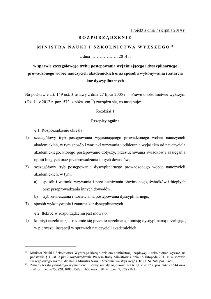 Projekt z dnia 7 sierpnia 2014 r. ROZPORZĄDZENIE M I N I S T R A N A U K I I S Z K O L N I C T W A W Y Ż S Z E G O 1) z dnia ………………. 2014 r. w sprawie szczegółowego trybu postępowania wyjaśniającego i dyscyplinarnego prowadzonego wobec nauczycieli akademickich oraz sposobu wykonywania i zatarcia kar dyscyplinarnych Na podstawie art. 149 ust. 3 ustawy z dnia 27 lipca 2005 r. – Prawo o szkolnictwie wyższym (Dz. U. z 2012 r. poz. 572, z późn. zm.2)) zarządza się, co następuje: Rozdział 1 Przepisy ogólne § 1. Rozporządzenie określa: 1) szczegółowy tryb postępowania wyjaśniającego prowadzonego wobec nauczycieli akademickich, w tym sposób i warunki wzywania i odbierania wyjaśnień od nauczyciela akademickiego, którego postępowanie dotyczy, przesłuchiwania świadków i zasięgania opinii biegłych oraz przeprowadzania innych dowodów; 2) szczegółowy tryb postępowania dyscyplinarnego prowadzonego wobec nauczycieli akademickich, w tym: a) sposób i warunki wzywania i przesłuchiwania obwinionego, świadków i biegłych oraz przeprowadzania innych dowodów, b) 3) tryb zawieszania i wznawiania postępowania dyscyplinarnego; sposób wykonywania i zatarcia kar dyscyplinarnych. § 2. Ilekroć w rozporządzeniu jest mowa o: 1) komisji uczelnianej – rozumie się przez to uczelnianą komisję dyscyplinarną orzekającą w pierwszej instancji w sprawach nauczycieli akademickich; 1) 2) Minister Nauki i Szkolnictwa Wyższego kieruje działem administracji rządowej – szkolnictwo wyższe, na podstawie § 1 ust. 2 pkt 2 rozporządzenia Prezesa Rady Ministrów z dnia 18 listopada 2011 r. w sprawie szczegółowego zakresu działania Ministra Nauki i Szkolnictwa Wyższego (Dz. U. Nr 248, poz. 1483). Zmiany tekstu jednolitego wymienionej ustawy zostały ogłoszone w Dz. U. z 2012 r. poz. 742 i 1544 oraz z 2013 r. poz. 675, 829, 1005, 1588 i 1650 oraz z 2014 r. poz. 7, 768 i 821. –2– 2) komisji przy ministrze – rozumie się przez to komisję dyscyplinarną powołaną przez ministra właściwego do spraw szkolnictwa wyższego orzekającą w pierwszej instancji w sprawach osób, o których mowa w art. 145 ust. 6 ustawy z dnia 27 lipca 2005 r. – Prawo o szkolnictwie wyższym, zwanej dalej „ustawą”; 3) komisji przy Radzie – rozumie się przez to komisję dyscyplinarną do spraw nauczycieli akademickich przy Radzie Głównej Nauki i Szkolnictwa Wyższego orzekającą w drugiej instancji; 4) komisjach dyscyplinarnych – rozumie się przez to komisje uczelniane, komisję przy ministrze i komisję przy Radzie; 5) rzeczniku dyscyplinarnym – rozumie się przez to rzecznika dyscyplinarnego powołanego przez rektora i rzecznika dyscyplinarnego powołanego przez ministra właściwego do spraw szkolnictwa wyższego; 6) zawiadamiającym - rozumie się przez to osobę pokrzywdzoną lub osobę przekazującą informację o popełnieniu czynu lub zachowaniu mającym znamiona przewinienia dyscyplinarnego. § 3. 1. Postępowania wyjaśniającego nie wszczyna się, a wszczęte umarza się, jeżeli: 1) czynu nie popełniono albo popełniony czyn nie zawierał znamion przewinienia dyscyplinarnego; 2) postępowanie co do tego samego czynu popełnionego przez tego samego nauczyciela akademickiego zostało prawomocnie zakończone albo jest w toku; 3) nauczyciel akademicki, którego dotyczy postępowanie, albo obwiniony zmarł; 4) nastąpiło przedawnienie albo upłynęły terminy, o których mowa w art. 144 ust. 2a albo ust. 4a ustawy; 5) szkodliwość popełnionego czynu jest znikoma. 2. Do postępowania dyscyplinarnego przepis ust. 1 stosuje się odpowiednio. § 4. 1. Postępowanie wyjaśniające i postępowanie dyscyplinarne w pierwszej instancji wobec nauczyciela akademickiego prowadzi się w uczelni, w której zostało popełnione przewinienie dyscyplinarne. 2. W przypadku gdy przewinienie dyscyplinarne zostało popełnione poza uczelnią, postępowanie wyjaśniające i postępowanie dyscyplinarne w pierwszej instancji prowadzi się w uczelni będącej podstawowym miejscem pracy nauczyciela akademickiego, którego dotyczy postępowanie. –3– 3. W przypadku, gdy przewinienie dyscyplinarne zostało popełnione poza uczelnią, a nauczyciel akademicki nie posiada podstawowego miejsca pracy, postępowanie wyjaśniające i postępowanie dyscyplinarne w pierwszej instancji prowadzi się w uczelni, w której złożono zawiadomienie o popełnieniu przewinienia dyscyplinarnego, o którym mowa w § 5. 4. Ilekroć w przepisach rozporządzenia jest mowa o rektorze, rozumie się przez to rektora uczelni, o której mowa w ust. 1 albo ust. 2 albo ust. 3. Rozdział 2 Postępowanie wyjaśniające § 5. 1. Postępowanie wyjaśniające wszczyna się z urzędu albo na podstawie zawiadomienia o popełnieniu czynu wyczerpującego znamiona przewinienia dyscyplinarnego, złożonego przez zawiadamiającego. 2. Zawiadomienia dotyczące osób, o których mowa w art. 145 ust. 6 ustawy, rektor przekazuje ministrowi właściwemu do spraw szkolnictwa wyższego, zwanemu dalej „ministrem” i właściwemu ministrowi, o którym mowa w art. 33 ust. 2 ustawy, zwanemu dalej „ministrem nadzorującym”. § 6. 1. Przed wszczęciem postępowania wyjaśniającego rzecznik dyscyplinarny bada, czy nie zachodzą okoliczności, o których mowa w § 3. 2. W przypadku stwierdzenia okoliczności, o których mowa w § 3, rzecznik dyscyplinarny wydaje postanowienie o odmowie wszczęcia postępowania wyjaśniającego, które doręcza wraz z uzasadnieniem: 1) zawiadamiającemu; 2) organowi, który go powołał; 3) ministrowi; 4) ministrowi nadzorującemu. 3. Jeżeli okoliczności, o których mowa w § 3, zostaną ujawnione w toku postępowania wyjaśniającego, rzecznik dyscyplinarny wydaje postanowienie o umorzeniu postępowania, które doręcza wraz z uzasadnieniem: 1) zawiadamiającemu; 2) osobie, której dotyczy postępowanie; 3) organowi, który go powołał; 4) ministrowi; –4– 5) ministrowi nadzorującemu