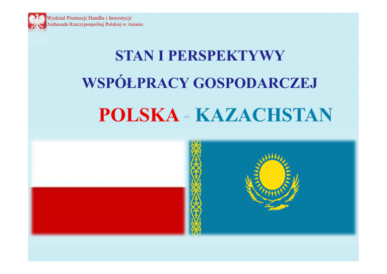 Wydział Promocji Handlu i Inwestycji Ambasada Rzeczypospolitej Polskiej w Astanie STAN I PERSPEKTYWY WSPÓŁPRACY GOSPODARCZEJ POLSKA - KAZACHSTAN Wydział Promocji Handlu i Inwestycji Ambasada Rzeczypospolitej Polskiej w Astanie R E P U B L I K A K A Z A C H S TA N U Liczba ludności: 16,4 mln Powierzchnia: 2 724,9 tys. km ² Wydział Promocji Handlu i Inwestycji Ambasada Rzeczypospolitej Polskiej w Astanie Podstawowe informacje makroekonomiczne Kazachstanu Główne sektory i gałęzie gospodarki (udział w PKB I-VI 2011 r.) Przemysł – 40,9% Usługi – 53,6% Rolnicwo – 5,5% 2008 2009 2010 2011 (I-IX) PKB (mld USD) 133,4 134,9 150 65* PKB per capita (tys USD): 8 130 7 030 9 150 - Inflacja (%): 9,5 6,2 8,1 5,1* Deficyt budŜetowy (% PKB): 2,1 3,5 4,1 (I-XI) b/d ZadłuŜenie zagraniczne (% PKB): b/d b/d 11,3 (I-XI) b/d Wolumen eksportu (mld USD): 71,2 43,2 59,2 60 Wolumen importu (mld USD): 37,9 28,4 29,8 14 * dane za okres I-VI 2011 r. Źródło: obliczenia własne na podstawie danych Komitetu Kontroli Celnej Ministerstwa Finansów RK oraz Agencji RK ds. Statystyki Wydział Promocji Handlu i Inwestycji Ambasada Rzeczypospolitej Polskiej w Astanie Lokalne uwarunkowania, specyficzne dla Republiki Kazachstanu • Dobra marka Polski • Kazachstan aplikuje o wejście do WTO, dlatego nie są stosowane Ŝadne inne bariery we współpracy z zagranicą poza niŜej wymienionymi (slajd 9, 10) • Korupcja: najniŜszy wskaźnik korupcji wśród państw WNP (105-ta pozycja w rankingu światowym) • Indeks biurokracji: w rankingu Doing Business 2011 Kazachstan wyprzedza Polskę o 11 miejsc (59-ta pozycja w rankingu światowym) • Diagnoza stanu gospodarki po kryzysie: średnioroczne tempo wzrostu PKB w l. 2004-2007 wyniosło 9,6%, w l. 2008-2009 – 1,6%, w 2010 r. – 7,1%, w I-IX 2011 r. - 7,0%. Kazachstan nie odnotował spadku PKB nawet w szczycie światowego kryzysu • Wskaźnik reform: według raportu EBOR 2010 r., średnia z ocen Kazachstanu w czterech kategoriach reform (Przedsiębiorstwa, Rynki i Handel, Instytucje Finansowe, Infrastruktura) wyniosła 3 Kazachstan uwaŜany jest za lidera przemian rynkowych w regionie (w skali od 1 do 4+). Wydział Promocji Handlu i Inwestycji Ambasada Rzeczypospolitej Polskiej w Astanie Prawo Otoczenie prawne dla prowadzenia działalności gospodarczej – stabilność prawa • Prawo jest stabilne • Sprawny system sądowniczy • Obecne są międzynarodowe kancelarie prawne, w tym polska Kancelaria Prawna „Chałas i Wspólnicy” Wydział Promocji Handlu i Inwestycji Ambasada Rzeczypospolitej Polskiej w Astanie Finansowanie Dostęp firm do finansowania zewnętrznego • Główne Centrum Finansowe Azji Centralnej • Obecne banki międzynarodowe (UniCredit, HSBC) • Giełda Papierów Wartościowych • Stopa refinansowa Narodowego Banku Kazachstanu – 7% • Odsetek złych kredytów w 2007 r. wyniósł 26% (raport EBOR 2010r.), lecz dzięki aktywnej polityce państwa problem został obecnie opanowany, a sytuacja sektora bankowego jest stabilna • Udzielenie ulg inwestycyjnych w postaci: inwestycyjnych preferencji podatkowych (CIT, preferencje w podatku od nieruchomości i w podatku gruntowym), zwolnienie z opodatkowania wwoŜonego sprzętu inwestycyjnego, państwowe granty np. w postaci gruntów. Wydział Promocji Handlu i Inwestycji Ambasada Rzeczypospolitej Polskiej w Astanie Polityka fiskalna Kazachstanu • W związku z powołaniem 1 stycznia 2010 r. Unii Celnej Republiki Białoruś, Republiki Kazachstanu oraz Federacji Rosyjskiej nastąpiła podwyŜka ceł na większość pozycji Taryfy Celnej, eksportowanych przez Polskę. Poziom ceł zewnętrznych w Jednolitej Taryfie Celnej w odniesieniu do RK wzrósł średnio o 4,4% (w przypadku art. przemysłowych wzrost średniej stawki z 4,6% do 8,5%, art. rolnych z 12,1% do 16,7%), • Relatywnie wysoki stopień protekcjonizmu w stosunku do producentów z terenu Unii Celnej – zgodne z polityką Rządu RK, dąŜącego do rozwoju przemysłu przetwórczego i sektora M.Ś.P, • VAT – 12% • PIT – 5-10% • CIT – 10% (działalność rolnicza), 20% (pozostała działalność); UWAGA: stawka 20% będzie obowiązywać do 31 grudnia 2012 r., a następnie zostanie obniŜona do 17,5%. Wydział Promocji Handlu i Inwestycji Ambasada Rzeczypospolitej Polskiej w Astanie Polityka fiskalna Kazachstanu •Podatek socjalny (odpowiednik składki ZUS) – 11% •Jednolita Taryfa Celna dostępna jest na stronie internetowej Komisji Unii Celnej: www.tsouz.ru oraz Kazachstańskiego Portalu Informacyjnego: www.tsouz.kz •Stabilny system prawny, podatkowy oraz celny •Od 1 lipca br. zniesione zostały kontrole weterynaryjne na wewnętrznych granicach Unii Celnej • Od 1 lipca br. 321 pozycji towarowych zostało wyłączonych z okresu przejściowego, w którym stosowano obniŜone stawki celne w stosunku do JTC (obniŜone stawki utrzymano jedynie w stosunku do 88 pozycji) •W 2012 r. planowane wprowadzenie jednolitych wzorów świadectw weterynaryjnych, uzgodnionych pomiędzy Unią Europejską a Unią Celną Białorusi, Rosji i Kazachstanu Wydział Promocji Handlu i Inwestycji Ambasada Rzeczypospolitej Polskiej w Astanie Bariery pozataryfowe • Wymóg zapewnienia 95% udziału obywateli Kazachstanu w ogólnej liczbie zatrudnionych przez zakład pracy, posiadający status kazachstańskiego podmiotu gospodarczego, • Preferencje cenowe dla kazachstańskich podmiotów gospodarczych w zamówieniach publicznych: 20% (w przypadku zakupu towarów), 15% (w przypadku zakupu usług i zleceń budowlanych), • Przedsiębiorstwa z udziałem ponad 50% kapitału zagranicznego są wykluczone z przetargów o zamówienia publiczne, chyba, Ŝe spełniają one następujące warunki: są rezydentami Kazachstanu, wytwarzają w Kazachstanie wyroby gotowe, zatrudniają nie mniej niŜ 85% miejscowej siły roboczej. Oddziały zagranicznych spółek prawa handlowego wykluczone są z udziału w przetargach o zamówienia publiczne, Wydz