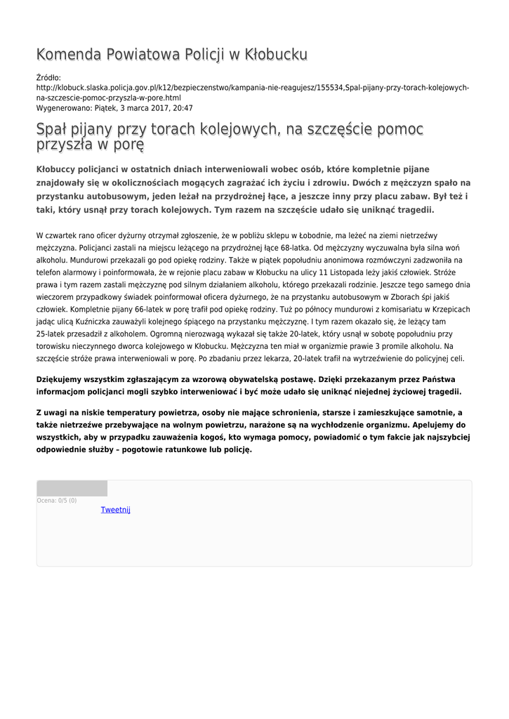 Komenda Powiatowa Policji w Kłobucku Źródło: http://klobuck.slaska.policja.gov.pl/k12/bezpieczenstwo/kampania-nie-reagujesz/155534,Spal-pijany-przy-torach-kolejowychna-szczescie-pomoc-przyszla-w-pore.html Wygenerowano: Piątek, 3 marca 2017, 20:47 Spał pijany przy torach kolejowych, na szczęście pomoc przyszła w porę Kłobuccy policjanci w ostatnich dniach interweniowali wobec osób, które kompletnie pijane znajdowały się w okolicznościach mogących zagrażać ich życiu i zdrowiu. Dwóch z mężczyzn spało na przystanku autobusowym, jeden leżał na przydrożnej łące, a jeszcze inny przy placu zabaw. Był też i taki, który usnął przy torach kolejowych. Tym razem na szczęście udało się uniknąć tragedii. W czwartek rano oficer dyżurny otrzymał zgłoszenie, że w pobliżu sklepu w Łobodnie, ma leżeć na ziemi nietrzeźwy mężczyzna. Policjanci zastali na miejscu leżącego na przydrożnej łące 68-latka. Od mężczyzny wyczuwalna była silna woń alkoholu. Mundurowi przekazali go pod opiekę rodziny. Także w piątek popołudniu anonimowa rozmówczyni zadzwoniła na telefon alarmowy i poinformowała, że w rejonie placu zabaw w Kłobucku na ulicy 11 Listopada leży jakiś człowiek. Stróże prawa i tym razem zastali mężczyznę pod silnym działaniem alkoholu, którego przekazali rodzinie. Jeszcze tego samego dnia wieczorem przypadkowy świadek poinformował oficera dyżurnego, że na przystanku autobusowym w Zborach śpi jakiś człowiek. Kompletnie pijany 66-latek w porę trafił pod opiekę rodziny. Tuż po północy mundurowi z komisariatu w Krzepicach jadąc ulicą Kuźniczka zauważyli kolejnego śpiącego na przystanku mężczyznę. I tym razem okazało się, że leżący tam 25-latek przesadził z alkoholem. Ogromną nierozwagą wykazał się także 20-latek, który usnął w sobotę popołudniu przy torowisku nieczynnego dworca kolejowego w Kłobucku. Mężczyzna ten miał w organizmie prawie 3 promile alkoholu. Na szczęście stróże prawa interweniowali w porę. Po zbadaniu przez lekarza, 20-latek trafił na wytrzeźwienie do policyjnej celi. Dziękujemy wszystkim zgłaszającym za wzorową obywatelską postawę. Dzięki przekazanym przez Państwa informacjom policjanci mogli szybko interweniować i być może udało się uniknąć niejednej życiowej tragedii. Z uwagi na niskie temperatury powietrza, osoby nie mające schronienia, starsze i zamieszkujące samotnie, a także nietrzeźwe przebywające na wolnym powietrzu, narażone są na wychłodzenie organizmu. Apelujemy do wszystkich, aby w przypadku zauważenia kogoś, kto wymaga pomocy, powiadomić o tym fakcie jak najszybciej odpowiednie służby – pogotowie ratunkowe lub policję. Ocena: 0/5 (0) Tweetnij