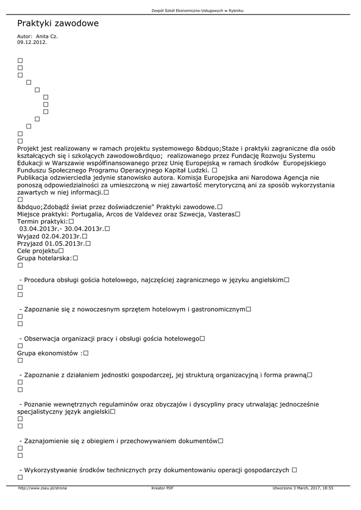 Zespół Szkół Ekonomiczno-Usługowych w Rybniku Praktyki zawodowe Autor: Anita Cz. 09.12.2012. Projekt jest realizowany w ramach projektu systemowego „Staże i praktyki zagraniczne dla osób kształcących się i szkolących zawodowo” realizowanego przez Fundację Rozwoju Systemu Edukacji w Warszawie współfinansowanego przez Unię Europejską w ramach środków Europejskiego Funduszu Społecznego Programu Operacyjnego Kapitał Ludzki. Publikacja odzwierciedla jedynie stanowisko autora. Komisja Europejska ani Narodowa Agencja nie ponoszą odpowiedzialności za umieszczoną w niej zawartość merytoryczną ani za sposób wykorzystania zawartych w niej informacji. „Zdobądź świat przez doświadczenie" Praktyki zawodowe. Miejsce praktyki: Portugalia, Arcos de Valdevez oraz Szwecja, Vasteras Termin praktyki: 03.04.2013r.- 30.04.2013r. Wyjazd 02.04.2013r. Przyjazd 01.05.2013r. Cele projektu Grupa hotelarska: - Procedura obsługi gościa hotelowego, najczęściej zagranicznego w języku angielskim - Zapoznanie się z nowoczesnym sprzętem hotelowym i gastronomicznym - Obserwacja organizacji pracy i obsługi gościa hotelowego Grupa ekonomistów : - Zapoznanie z działaniem jednostki gospodarczej, jej strukturą organizacyjną i forma prawną - Poznanie wewnętrznych regulaminów oraz obyczajów i dyscypliny pracy utrwalając jednocześnie specjalistyczny język angielski - Zaznajomienie się z obiegiem i przechowywaniem dokumentów - Wykorzystywanie środków technicznych przy dokumentowaniu operacji gospodarczych http://www.zseu.pl/strona Kreator PDF Utworzono 3 March, 2017, 18:55 Zespół Szkół Ekonomiczno-Usługowych w Rybniku - Kontaktowanie się i dokonywanie rozliczeń z kontrahentami oraz instytucjami finansowymi Grupa handlowców: - Zapoznanie się z działalnością firmy handlowej, jej nowoczesnym wyposażeniem w Sali sprzedażowej i magazynie - Zapoznanie się ze specyfiką rozmowy sprzedażowej i obsługą klienta - Zapoznanie się ze sposobem zamawiania towaru, jego odbiorem i rozmieszczeniem oraz dokumentacją handlową i księgową firmy Dla wszystkich grup: - Otrzymanie międzynarodowego certyfikatu Europass Mobility potwierdzającego podniesienie kwalifikacji zawodowych - Wdrożenie umiejętności językowych zdobytych w czasie lekcji - Poznanie miast partnerskich i ich okolic Planowany przebieg projektu Grupa ekonomistów i handlowców: Wylot/przylot: Kraków Balice- Porto Grupa hotelarzy: Wylot/przylot: Katowice Pyrzowice - Sztokholm Miejsce zakwaterowania i praktyki: Grupa ekonomistów i handlowców: Hotel Ribeira http://www.hotelribeira.pt/ Miejsce praktyk: Ekonomista: wydział finansowy i administracyjny Szkoły Epralima (2 uczniów), przedsiębiorstwo handlowo-przemysłowe Polipropigal (2 uczniów), ACIAB Instytucja Handlowo- Przemysłowa (Commercial and Industrial Association of Arcos de Valdevez and Ponte da Barca) - 2 uczniów, ACIBTM Centrum Inkubacji Firm regionu Minho - Associacao para o Centro de Incubacao de Empresas de Base Tecnolâogica do Minho (North) - 2 uczniów, Hotel Ribeira (dział administracyjny) - 2 uczniów. Handlowiec: znane również w Polsce sieci handlowe takie jak: Intermarche,Pingo Doce,Lidl, Miniprego: po 2 uczniów na obiekt Grupa hotelarzy: Zakwaterowanie: hotel Room Support http://www.roomsupport.se/mainEng.html miejsce praktyk: dwa hotele z sieci First Class Plaza Hotels Program kulturowy: zwiedzanie zabytków i ciekawych obiektów w Portugalii i Szwecji – wycieczki podczas weekendów Nadzór i opieka Podczas całego pobytu za granicą uczniowie będą pod stałą opieką nauczycieli z Polski (Portugalia dwóch opiekunów, Szwecja – jeden opiekun), a podczas odbywania praktyk zawodowych uczniowie będą również pod opieką nauczycieli ze szkoły Epralima w Portugalii i Tranellska w Szwecji. Podczas odbywania praktyki uczniowie będą podlegali ocenie. Organizatorzy projektu zapewniają: - przelot http://www.zseu.pl/strona Kreator PDF Utworzono 3 March, 2017, 18:55 Zespół Szkół Ekonomiczno-Usługowych w Rybniku - zakwaterowanie - wyżywienie - opiekę pedagogiczną - nadzór praktyk zawodowych - program kulturalny - ubezpieczenie Wyjazd na praktykę będzie poprzedzony przygotowaniem pedagogicznym, kulturowym i językowym. XII.2012 – III.2013 Przygotowanie językowe – p. Anna Amalio- Bednorz oraz p. Anna Górka-Szołtys 10 godzin miesięcznie Przygotowanie pedagogiczne – 8 godzin – p. Joanna Liszka, p. Joanna Białas, p. Joanna Dzierżęga Przygotowanie kulturowe – p. Joanna Bugdoł, p. Lidia Kalemba A. PRZYGOTOWANIE JĘZYKOWE. XII 2012 - III 2013 (10 h w każdym miesiącu, w sumie 40 h) Kurs, który będzie miał charakter warsztatów, ćwiczeń, zabawy, scenek rodzajowych. Przykładowa tematyka zajęć w zależności od zawodu: 1. Dialogi w restauracji/ w hotelu (zamówienia, procedura meldunku i wymeldunku) 2. Rodzaje posiłków, nazwy produktów żywnościowych 3. Pogoda, zapytania o drogę 4. Rozmowa sprzedażowa/ rozmowa kurtuazyjna z gościem hotelowym 5. Finanse i księgowość - typy dokumentów występujących w zakładach handlowych i obiektach hotelarskich (2 godziny) 6. Rozmowy telefoniczne 7. Podróż: transport lokalny i dialogi na lotnisku B. PRZYGOTOWANIE PEDAGOGICZNE. XII 2012 - III 2013 (2 h w każdym miesiącu, w sumie 8 h) Tematyka poruszana na zajęciach: 1. Sporządzenie kontraktu między uczestnikami wyjazdu a opiekunami, w którym zawarte będą m.in. zasady zachowania się podczas pobytu w za granicą, podczas podróży, w miejscu zakwaterowania. 2.Proces komunikacji. 3.Stres. Umiejętność radzenia sobie ze stresem 4.Trzy magiczne słowa: proszę, dziękuję, przepraszam. Zaufanie i szacunek 5.Sytuacje trudne, konflikty, sposoby rozwiązywania 6.Rynek pracy. Sposoby poszukiwania pracy. Pisanie CV i listu motywacyjnego 7.Prawa i obowiązki pracownika i pracodawcy 8. Współpraca w zespole 9. Napisanie przez uczestnika pracy na temat „ Jak poprawić swoją mobilność na rynku pr
