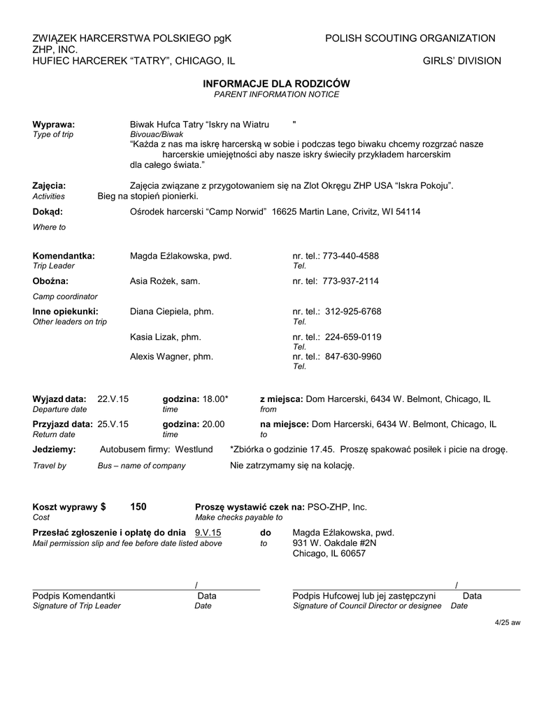 ZWIĄZEK HARCERSTWA POLSKIEGO pgK ZHP, INC. HUFIEC HARCEREK “TATRY”, CHICAGO, IL POLISH SCOUTING ORGANIZATION GIRLS’ DIVISION INFORMACJE DLA RODZICÓW PARENT INFORMATION NOTICE Wyprawa: Biwak Hufca Tatry “Iskry na Wiatru Type of trip Bivouac/Biwak Zajęcia: " “Każda z nas ma iskrę harcerską w sobie i podczas tego biwaku chcemy rozgrzać nasze harcerskie umiejętności aby nasze iskry świeciły przykładem harcerskim dla całego świata.” Activities Zajęcia związane z przygotowaniem się na Zlot Okręgu ZHP USA “Iskra Pokoju”. Bieg na stopień pionierki. Dokąd: Ośrodek harcerski “Camp Norwid” 16625 Martin Lane, Crivitz, WI 54114 Where to Magda Eźlakowska, pwd. Komendantka: nr. tel.: 773-440-4588 Trip Leader Tel. Oboźna: Asia Rożek, sam. nr. tel: 773-937-2114 Diana Ciepiela, phm. nr. tel.: 312-925-6768 Camp coordinator Inne opiekunki: Other leaders on trip Tel. Kasia Lizak, phm. nr. tel.: 224-659-0119 Alexis Wagner, phm. nr. tel.: 847-630-9960 Tel. Tel. Wyjazd data: 22.V.15 godzina: 18.00* z miejsca: Dom Harcerski, 6434 W. Belmont, Chicago, IL time from Przyjazd data: 25.V.15 godzina: 20.00 na miejsce: Dom Harcerski, 6434 W. Belmont, Chicago, IL Return date time to Departure date Jedziemy: Travel by Autobusem firmy: Westlund Nie zatrzymamy się na kolację. Bus – name of company Koszt wyprawy $ 150 *Zbiórka o godzinie 17.45. Proszę spakować posiłek i picie na drogę. Proszę wystawić czek na: PSO-ZHP, Inc. Cost Make checks payable to Przesłać zgłoszenie i opłatę do dnia 9.V.15 Mail permission slip and fee before date listed above do to Magda Eźlakowska, pwd. 931 W. Oakdale #2N Chicago, IL 60657 Podpis Komendantki / Data Podpis Hufcowej lub jej zastępczyni Signature of Trip Leader Date Signature of Council Director or designee / Data Date 4/25 aw ZWIĄZEK HARCERSTWA POLSKIEGO pgK HUFIEC HARCEREK “TATRY”, CHICAGO, IL POLISH SCOUTING ORGANIZATION ZHP, INC. GIRLS’ DIVISION ZGŁOSZENIE -- PARENTAL PERMISSION Daję pozwolenie memu dziecku brać udziału w Biwaku hufca “Iskry na Wiatru” I hereby give permission for my child/ward ___________________________________________________________________________________________________________ Imię i nazwisko Name (Uczestniczka 21 lat lub wyżej wypełnia sama za siebie. Participant 21 years of age or older fills the form out for herself.) Data urodzenia wiek miejsce Tel. główny Date of birth age place of birth Primary tel. Adres Miasto Stan Address City State Drużyna Stopień Troop name Rank Adres emailowy: ________________________________________________________________________ Imię i nazwisko ojca Tel. kontaktowy Father’s name Contact no. Imię i nazwisko matki Tel. kontaktowy Mother’s name Contact no. W razie wypadku, jeżeli rodziców nie będzie w domu, proszę powiadomić: In case of emergency, if parents are not home, please notify: Imię i nazwisko Tel. Pokrewieństwo Name Tel. Relationship Informacje medyczne / alergie Health information / allergies Zażywa lekarstwa codziennie – nazwa, kiedy, dawka Takes the following medication on regular basis – name of medicine, time, dosage Nazwa firmy ubezpieczeniowej załączyć kopię obydwu stron karty ubezpieczeniowej Family Medical Insurance Carrier – attach a copy of both sides of insurance card. BEZ UBEZPIECZENIA – NO HEALTH INSURANCE Dziecko moje nie posiada ubezpieczenia. Załączam formularz podstęplowany przez notariusza potwierdzający ten fakt. My child does not have health insurance. I am attaching a notarized form atesting to such fact. podpis rodzica signature of parent Waiver of Liability: I give permission to my child named on this form, to take part in the named activity. I waive any claim, demand or cause of action, legal or equitable against its Officers and staff for any injuries to my child that might be sustained by her/him during the period of the program. I also give permission to the physician selected by the activity director to order X-rays, routine tests and treatment for the health of my child, and, in the event I cannot be reached in an emergency, I hereby give permission to the physician selected by the activity director to hospitalize, secure proper treatment for, and to order injections and/or surgery for my child as named herein. It is further warranted that if this consent form is signed by one or two parents or guardians, it is with the authority of the other. Podpis rodziców dla dzieci poniżej 21 lat / Podpis uczestniczki 21 lat i powyżej Signature of parents for children under 21 / Signature of participant over 21 Dla komendy wyprawy / For internal use Zapłacono $ ___ czek # data / date gotówka $ kopia karty ubezpieczeniowej bez ubezpieczenia – podpis notariusza / Podpis komendantki wyprawy Data 4/15 aw ZWIĄZEK HARCERSTWA POLSKIEGO pgK ZHP, INC. HUFIEC HARCEREK “TATRY”, CHICAGO, IL POLISH SCOUTING ORGANIZATION GIRLS’ DIVISION BRAK UBEZPIECZENIA – NO INSURANCE COVERAGE Data / Date DO / TO: Związku Harcerstwa Polskiego pgK - Hufca Harcerek “Tatry” Polish Scouting Organization – ZHP, Inc. Girls’ Division - Illinois District – Girl Guide Council “Tatry” Moje dziecko (Ja) / My child (I) Urodzone / Born on Adres / Address Bierze (biorę) udział w specjalnej wprawie Is (am) taking part in the Special Activity Data wyprawy / Date of activity od / from do / to ******************************************************************** Nie mam ubezpieczenia rodzinnego. Rozumiem, że ubezpieczenie obozu / specjalneych wypraw jest minimalne. W razie medycznych problemów, będę odpowiedzialny(na) za wszelkie koszta medyczne mojego dziecka (własne). I do not carry Family Health Insurance. I understand that camp / special activity insurance is limited in coverage. In case of any medical problems, I will be responsible for all costs for my child (myself). Podpis rodzica / uczestniczki, 21 lat lub wyżej Data Signature of parent, guardian / participant, if 21 or over Date Witness my h