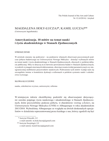 The Polish Journal of the Arts and Culture Nr 12 (4/2014) / Artykuł Magdalena Hoły‑Łuczaj*, Kamil Łuczaj** (Uniwersytet Jagielloński) Amerykanizacja. 10 mitów na temat nauki i życia akademickiego w Stanach Zjednoczonych STRESZCZENIE W artykule staramy się podważyć – na podstawie własnych obserwacji poczynionych podczas pobytu badawczego na Uniwersytecie Nowego Meksyku – dziesięć wybranych mitów na temat nauki i życia akademickiego w Stanach Zjednoczonych, obecnych w polskiej debacie publicznej. Mity te dotyczą m.in łatwości prowadzenia badań w Stanach Zjednoczonych, wysokich wymagań stawianych doktorantom, obowiązywania ścisłej parametryzacji czy nieograniczonej mobilności pracowników naukowych. Podważenie tych mitów wydaje nam się szczególnie istotne w kontekście dyskusji o reformach w polskim systemie nauki i szkolnictwa wyższego. SŁOWA KLUCZOWE nauka, szkolnictwo wyższe, uniwersytet, reforma W niniejszym tekście chcielibyśmy podzielić się obserwacjami dotyczącymi szeroko pojętego życia naukowego i akademickiego w Stanach Zjednoczonych, które poczyniliśmy podczas pobytu, w charakterze visiting scholars, na Uniwersytecie Nowego Meksyku (UNM) w Albuquerque w roku akademickim 2013/2014. Wybraliśmy Albuquerque ze względu na dwóch doskonałych specjalistów w dziedzinie reprezentowanej przez każdego z nas, którzy zgodzili się być * Instytut Filozofii, UJ e‑mail autorki: [email protected] ** Instytut Socjologii, UJ e‑mail autora: [email protected] 10 Magdalena Hoły‑Łuczaj, Kamil Łuczaj naszymi tutorami. UNM to jednak nie Harvard. Tym niemniej jest to porządny uniwersytet stanowy, jakich w Stanach Zjednoczonych jest bardzo wiele, w przeciwieństwie do uczelni z Ivy League, których jest zaledwie osiem (a łączy je poza lokalizacją geograficzną, o czym często się zapomina, przede wszystkim wspólna dywizja rozgrywek sportowych). Opowieść o Albuquerque to zatem nie opowieść o jednym z ośmiu flagowych uniwersytetów, lecz o zwykłym uniwersytecie stanowym. Zaprezentowane poniżej obserwacje mają podważyć wybrane mity, obecne w polskiej debacie publicznej. Podważenie tych mitów wydaje nam się szczególnie istotne ze względu na to, że amerykański system nauki często stawia się za wzór systemowi polskiemu. Mit 1: USA jako kraj przyjazny prowadzeniu badań W systemie nauki, tak jak w każdym innym amerykańskim systemie, mamy bardzo wiele regulacji, kodeksów i zasad. Jedną z naczelnych zasad jest dbałość o etyczność badań. Z tego względu każdy akademik prowadzący badania empiryczne jest zobligowany do uzyskania zgody lokalnej komisji etycznej, noszącej zazwyczaj nazwę Institutional Review Board (IRB). Procedura składania wniosku do IRB nie jest jednak przyjazna i przypomina raczej procedurę składania wniosku grantowego. W pewnych momentach jest ona nawet znacznie bardziej skomplikowana niż procedury znane np. z naszego Narodowego Centrum Nauki, ponieważ nie każdy może skierować wniosek do IRB. Najpierw wniosek musi przejść recenzję na poziomie wydziału, co przysparza dodatkowej pracy dziekanowi. Drugim warunkiem wstępnym jest przejście szkolenia Collaborative Institutional Training Initiative (CITY). Prowadzone na platformie internetowej i dostępne wyłącznie dla osób afiliowanych przy zrzeszonych uczelniach szkolenie pozwala zdobyć szereg informacji dotyczących wymogów etycznych stawianych badaniom. Szkolenie to trzeba zresztą cyklicznie powtarzać. Jednym z podstawowych dokumentów omawianych w jego trakcie jest tzw. Raport z Belmont1. Raport ten formułuje wiele zdroworozsądkowych zasad dotyczących postępowania w przypadku badań nad ludźmi. Główny problem stanowią jednak interpretacje tego dokumentu. Przykładowo, z ogólnej zasady, mówiącej, że wszyscy uczestnicy badań powinni być traktowani jednakowo, wynika, że wszystkim uczestnikom należy zapłacić równą sumę pieniędzy (jako rekompensatę za wzięcie udziału w badaniu). Paradoks pojawia się, gdy w jednym badaniu interesują nas zarówno dorośli, jak i dzieci. W myśl przytoczonej interpretacji dzieciom 1 Jego treść dostępna jest pod adresem: http://www.fda.gov/ohrms/dockets/ac/05/briefing/ 2005–4178b_09_02_Belmont%20Report.pdf [dostęp: 22.11.2014]. Amerykanizacja. 10 mitów na temat nauki i życia akademickiego… 11 należałoby zapłacić te same kilkanaście dolarów, które płaci się dorosłym. Niestety, zgodnie z inną regułą, dzieciom nie można płacić. W rezultacie wychodzi na to, że dziecku jednocześnie trzeba i nie można zapłacić. Jeden z przedstawicieli lokalnego IRB, o korzeniach innych niż anglosaskie, przyznał w rozmowie z jednym z nas, że niektóre reguły (w tym „Raport z Belmont”) wymyśliła grupa bogatych ludzi, którzy nie mają kontaktu z rzeczywistością badawczą. Trudno nie zgodzić się z jego opinią. Fakt, że procedura komplikuje się znacząco, gdy badanie jest bardziej inwazyjne (np. dotyczy żywności), nie dziwi bardzo, ponieważ badania tego typu niosą z sobą zwykle większe ryzyko. Jedno z nas podczas pobytu badawczego chciało przeprowadzić bardzo prosty eksperyment polegający na pokazaniu serii zdjęć dorosłym i dzieciom. Zdjęcia przeznaczone dla dzieci były pozbawione jakichkolwiek elementów kontrowersyjnych. Okazało się jednak, że zgoda uczelnianej IRB nie wystarczy. Wcześniej należy uzyskać zgodę IRB działającej przy Albuquerque Public Schools (APS), odpowiednika naszego kuratorium oświaty. Owo kuratorium nie różniło się niczym od instytucji znanych z polskich anegdot na temat niewydolnej administracji (urzędnicy nie odbierali telefonów, nie odpisywali na maile, byli – delikatnie mówiąc – dość niechętni współpracy). Nie wiemy, czy Amerykanów traktowano by podobnie, jednak fakt, że współwnioskodawcą był znany amerykański profesor, wskazuje, że nie chodziło tu o niechętny stosunek APS do obcokraj
