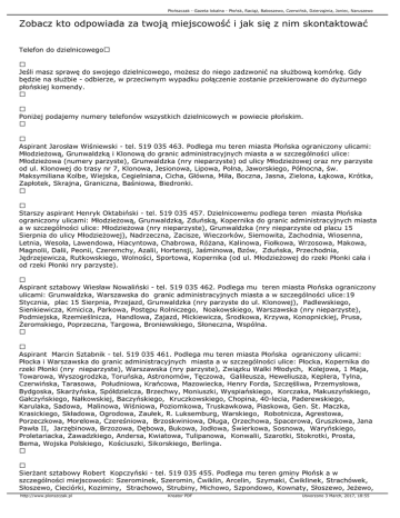 Płońszczak - Gazeta lokalna - Płońsk, Raciąż, Baboszewo, Czerwińsk, Dzierzążnia, Joniec, Naruszewo Zobacz kto odpowiada za twoją miejscowość i jak się z nim skontaktować Telefon do dzielnicowego Jeśli masz sprawę do swojego dzielnicowego, możesz do niego zadzwonić na służbową komórkę. Gdy będzie na służbie - odbierze, w przeciwnym wypadku połączenie zostanie przekierowane do dyżurnego płońskiej komendy. Poniżej podajemy numery telefonów wszystkich dzielnicowych w powiecie płońskim. Aspirant Jarosław Wiśniewski - tel. 519 035 463. Podlega mu teren miasta Płońska ograniczony ulicami: Młodzieżową, Grunwaldzką i Klonową do granic administracyjnych miasta a w szczególności ulice: Młodzieżowa (numery parzyste), Grunwaldzka (nry nieparzyste) od ulicy Młodzieżowej oraz nry parzyste od ul. Klonowej do trasy nr 7, Klonowa, Jesionowa, Lipowa, Polna, Jaworskiego, Północna, św. Maksymiliana Kolbe, Wiejska, Cegielniana, Cicha, Główna, Miła, Boczna, Jasna, Zielona, Łąkowa, Krótka, Zapłotek, Skrajna, Graniczna, Baśniowa, Biedronki. Starszy aspirant Henryk Oktabiński - tel. 519 035 457. Dzielnicowemu podlega teren miasta Płońska ograniczony ulicami: Młodzieżową, Grunwaldzką, Zduńską, Kopernika do granic administracyjnych miasta a w szczególności ulice: Młodzieżowa (nry nieparzyste), Grunwaldzka (nry nieparzyste od placu 15 Sierpnia do ulicy Młodzieżowej), Nadrzeczna, Zacisze, Wieczorków, Siemowita, Zachodnia, Wiosenna, Letnia, Wesoła, Lawendowa, Hiacyntowa, Chabrowa, Różana, Kalinowa, Fiołkowa, Wrzosowa, Makowa, Magnolii, Dalii, Peonii, Czeremchy, Azalii, Hortensji, Jaśminowa, Bzów, Zduńska, Przechodnia, Jędrzejewicza, Rutkowskiego, Wolności, Sportowa, Kopernika (od ul. Młodzieżowej do rzeki Płonki cała i od rzeki Płonki nry parzyste). Aspirant sztabowy Wiesław Nowaliński - tel. 519 035 462. Podlega mu teren miasta Płońska ograniczony ulicami: Grunwaldzka, Warszawska do granic administracyjnych miasta a w szczególności ulice:19 Stycznia, plac 15 Sierpnia, Przejazd, Grunwaldzka (nry parzyste do ul. Klonowej), Padlewskiego, Sienkiewicza, Kmicica, Parkowa, Postępu Rolniczego, Noakowskiego, Warszawska (nry nieparzyste), Podmiejska, Rzemieślnicza, Handlowa, Zajazd, Mickiewicza, Środkowa, Krzywa, Konopnickiej, Prusa, Żeromskiego, Poprzeczna, Targowa, Broniewskiego, Słoneczna, Wspólna. Aspirant Marcin Sztabnik - tel. 519 035 461. Podlega mu teren miasta Płońska ograniczony ulicami: Płocka i Warszawska do granic administracyjnych miasta a w szczególności ulice: Płocka, Kopernika do rzeki Płonki (nry nieparzyste), Warszawska (nry parzyste), Związku Walki Młodych, Kolejowa, 1 Maja, Towarowa, Wyszogrodzka, Toruńska, Astronomów, Tęczowa, Galileusza, Heweliusza, Keplera, Tylna, Czerwińska, Tarasowa, Południowa, Krańcowa, Mazowiecka, Henry Forda, Szczęśliwa, Przemysłowa, Bydgoska, Skarżyńska, Spółdzielcza, Brzechwy, Moniuszki, Wyspiańskiego, Korczaka, Makuszyńskiego, Gałczyńskiego, Nałkowskiej, Baczyńskiego, Kruczkowskiego, Chopina, 40-lecia, Paderewskiego, Karulaka, Sadowa, Malinowa, Wiśniowa, Poziomkowa, Truskawkowa, Piaskowa, Gen. St. Maczka, Krasickiego, Składowa, Ogrodowa, Zaułek, R. Luksemburg, Warskiego, Robotnicza, Agrestowa, Porzeczkowa, Morelowa, Czereśniowa, Brzoskwiniowa, Długa, Orzechowa, Spacerowa, Gruszkowa, Jana Pawła II, Jarzębinowa, Brzozowa, Dębowa, Bukowa, Jodłowa, Świerkowa, Sosnowa, Waryńskiego, Proletariacka, Zawadzkiego, Andersa, Kwiatowa, Tulipanowa, Konwalii, Szarotki, Stokrotki, Prosta, Bema, Wojska Polskiego, Kościuszki, Sikorskiego, Berlinga. Sierżant sztabowy Robert Kopczyński - tel. 519 035 455. Podlega mu teren gminy Płońsk a w szczególności miejscowości: Szerominek, Szeromin, Ćwiklin, Arcelin, Szymaki, Ćwiklinek, Strachówek, Słoszewo, Cieciórki, Koziminy, Strachowo, Strubiny, Michowo, Szpondowo, Kownaty, Słoszewo, Jeżewo, http://www.plonszczak.pl Kreator PDF Utworzono 3 March, 2017, 18:55 Płońszczak - Gazeta lokalna - Płońsk, Raciąż, Baboszewo, Czerwińsk, Dzierzążnia, Joniec, Naruszewo Bońki, Brody, Siedlin, Pilitowo, Bogusławice, Woźniki, Cempkowo, Raźniewo, Dalanówek, Poczernin, Młyńsk, Pruszyn, Michalinek, Lisewo, Krępica. Aspirant Marek Cichowski - tel. 519 035 460. Podlega mu teren gminy Dzierzążnia: Błomino Gumowskie, Błomino Gule, Błomino Jeże, Cumino, Kadłubowo, Podmarszczyn, Korytowo, Pomianowo, Pluskocin, Skołatowo, Wierzbica Pańska, Wierzbica Szlachecka, Sadkowo, Starczewo Wielkie, Starczewo Pobodze, Dzierzążnia Nowa, Gumino, Gumino Nowe, Gumino Stare, Kucice Stare, Kucice Nowe, Przemkowo, Niwa, Rakowo, Siekluki, Sarnowo Góry, Sarnowo Nowe, Wilamowice oraz Wroninko, Cholewy, Skrzynki, Skarżyn, Ilino, Ilinko, Kluczewo należące do gminy Płońsk. Sierżant sztabowy Daniel Zieliński - tel. 519 035 459. Podlegają mu miejscowości: Baboszewo, Bożewo, Brzeście, Brzeście Małe, Brzeście Nowe, Cieszkowo Kolonia, Cieszkowo Nowe, Cieszkowo Stare, Cywiny Dynguny, Cywiny Wojskie, Jarocin, Kowale, Krościn, Lutomierzyn, Mystkowo, Niedarzyn, Sokolniki Nowe, Sokolniki Stare, Zbyszyno, Korzybie, Kruszewie. Aspirant Mariusz Pankowski - tel. 519 035 464. Podlegają mu miejscowości z terenu gm. Baboszewo: Budy Radzymińskie, Dłużniewo, Dramin, Dziektarzewo, Galomin, Galominek, Galominek Nowy, Goszczyce Poświętne, Goszczyce Średnie, Jesionka, Kiełki, Lachówiec, Pawłowo, Pieńki Rzewińskie, Polesie, Rybitwy, Rzewin, Sarbiewo, Śródborze, Wola Dłużniewska, Wola Folwark. Starszy aspirant Mariusz Pajewski - tel. 519 035 458. Podlegają mu miejscowości: Sochocin po stronie prawej trasy K-50 Płońsk - Ciechanów oraz miejscowości: Wycinki 1-28, Biele 17-33, Gromadzyn, Ciemniewo 4-8, Drożdżyn, Kołoząb, Niewikla, Ślepowrony, Pruszkowo, Bolęcin, Idzikowice, Kuchary Żydowskie, Kuchary Królewskie, Rzy, Kondrajec, Jędrzejewo. Starszy sierżant Rafał Michniewicz - tel. 519 035 456. Podlega 
