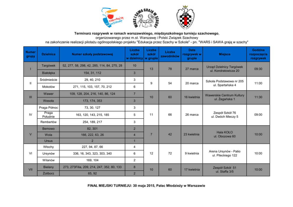 Terminarz rozgrywek w ramach warszawskiego, międzyszkolnego turnieju szachowego, organizowanego przez m.st. Warszawę i Polski Związek Szachowy na zakończenie realizacji pilotażu ogólnopolskiego projektu "Edukacja przez Szachy w Szkole" - pn. "WARS i SAWA grają w szachy" Numer grupy Dzielnica Numer szkoły podstawowej Targówek 52, 277, 58, 298, 42, 285, 114, 84, 275, 28 Liczba Liczba Liczba szkół szkół zawodników w dzielnicy w grupie Białołęka 154, 31, 112 3 Śródmieście 29, 40, 210 3 II Mokotów 271, 115, 103, 157, 70, 212 6 Wawer 109, 128, 204, 216, 140, 86, 124 7 III V VI VII Miejsce Godzina rozpoczęcia rozgrywek 10 I IV Data rozgrywek w grupie Wesoła 173, 174, 353 3 Praga Północ 73, 30, 127 3 Praga Południe 163, 120, 143, 215, 185 5 Rembertów 254, 189, 217 3 Bemowo 82, 301 2 Wola 166, 222, 63, 26 4 Ursus 2 1 Włochy 227, 94, 87, 66 4 Ursynów 336, 16, 343, 323, 303, 340 6 Wilanów 169, 104 2 Bielany 273, 273Filia, 209, 214, 247, 352, 80, 133 8 Żoliborz 65, 92 2 13 78 27 marca Urząd Dzielnicy Targówek ul. Kondratowicza 20 09:30 9 54 20 marca Szkoła Podstawowa nr 205 ul. Spartańska 4 11:00 10 60 16 kwietnia Wawerskie Centrum Kultury ul. Żegańska 1 11:30 11 66 26 marca Zespół Szkół 76 ul. Dwóch Mieczy 5 09:00 7 42 23 kwietnia Hala KOŁO ul. Obozowa 60 10:00 12 72 9 kwietnia Arena Ursynów - Patio ul. Pileckiego 122 10:00 10 60 17 kwietnia Zespół Szkół 51 ul. Staffa 3/5 10:00 FINAŁ MIEJSKI TURNIEJU: 30 maja 2015, Pałac Młodzieży w Warszawie
